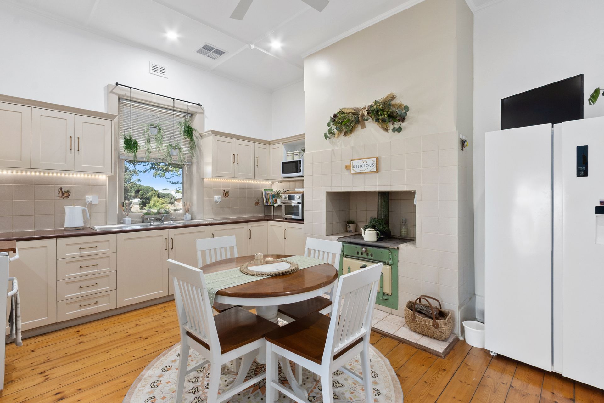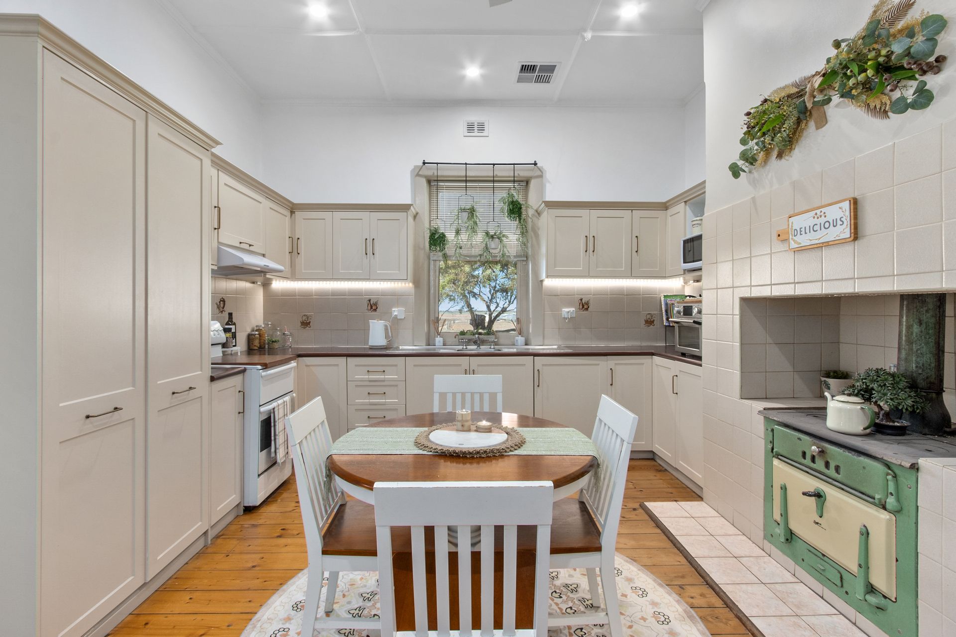 Dine-in kitchen with ample cupboard space, original wood stove and beautiful pine floorboards.