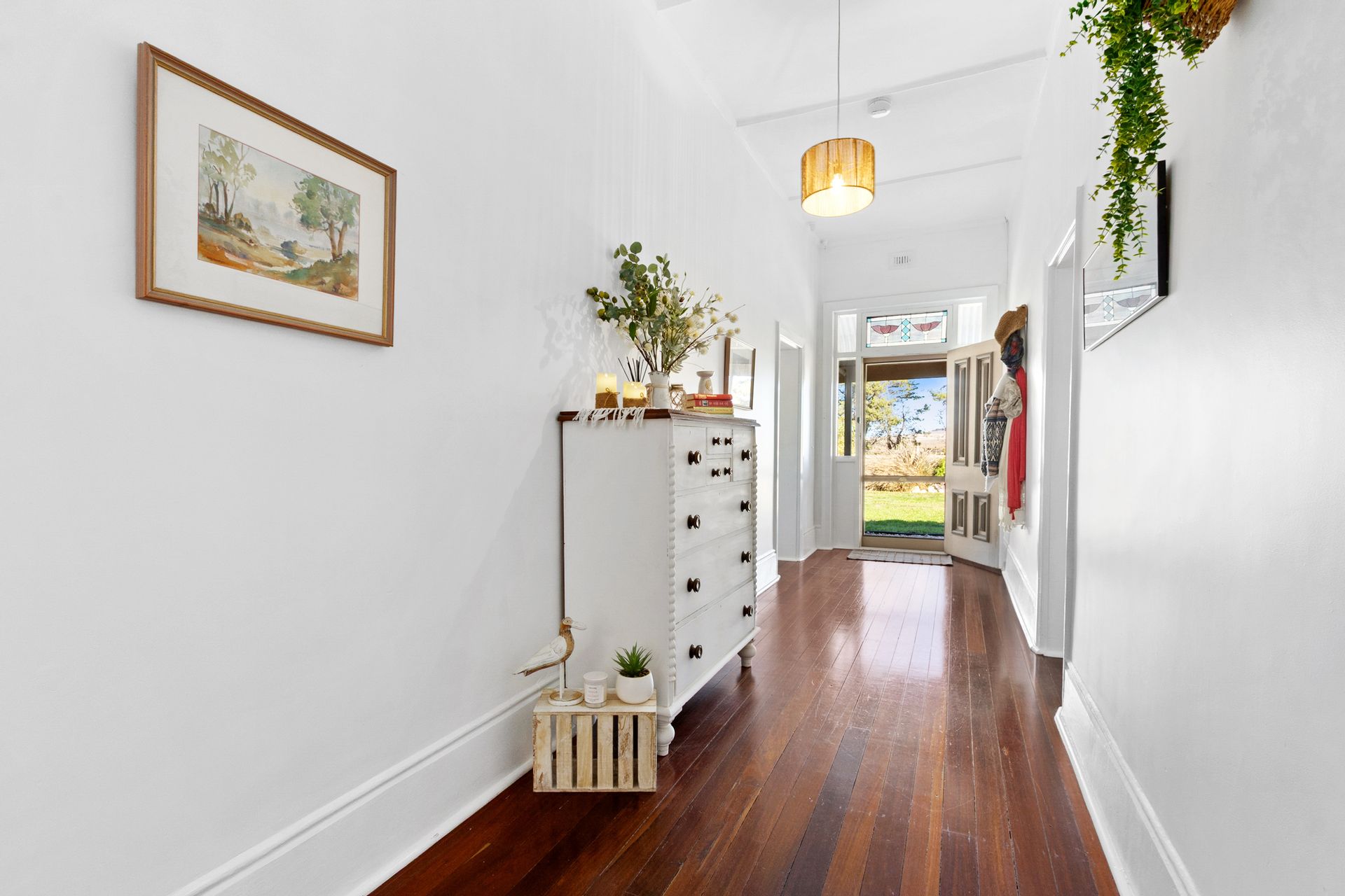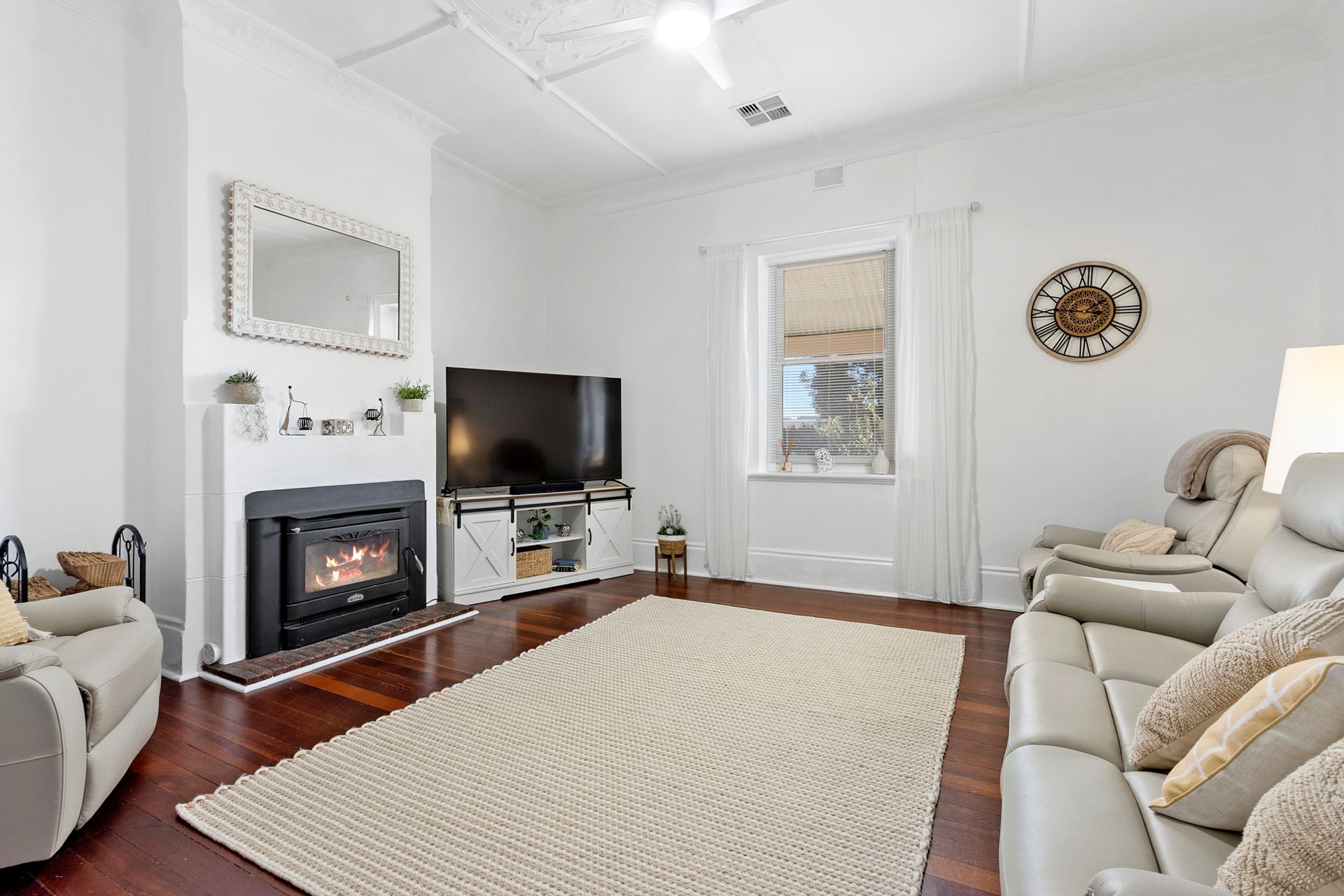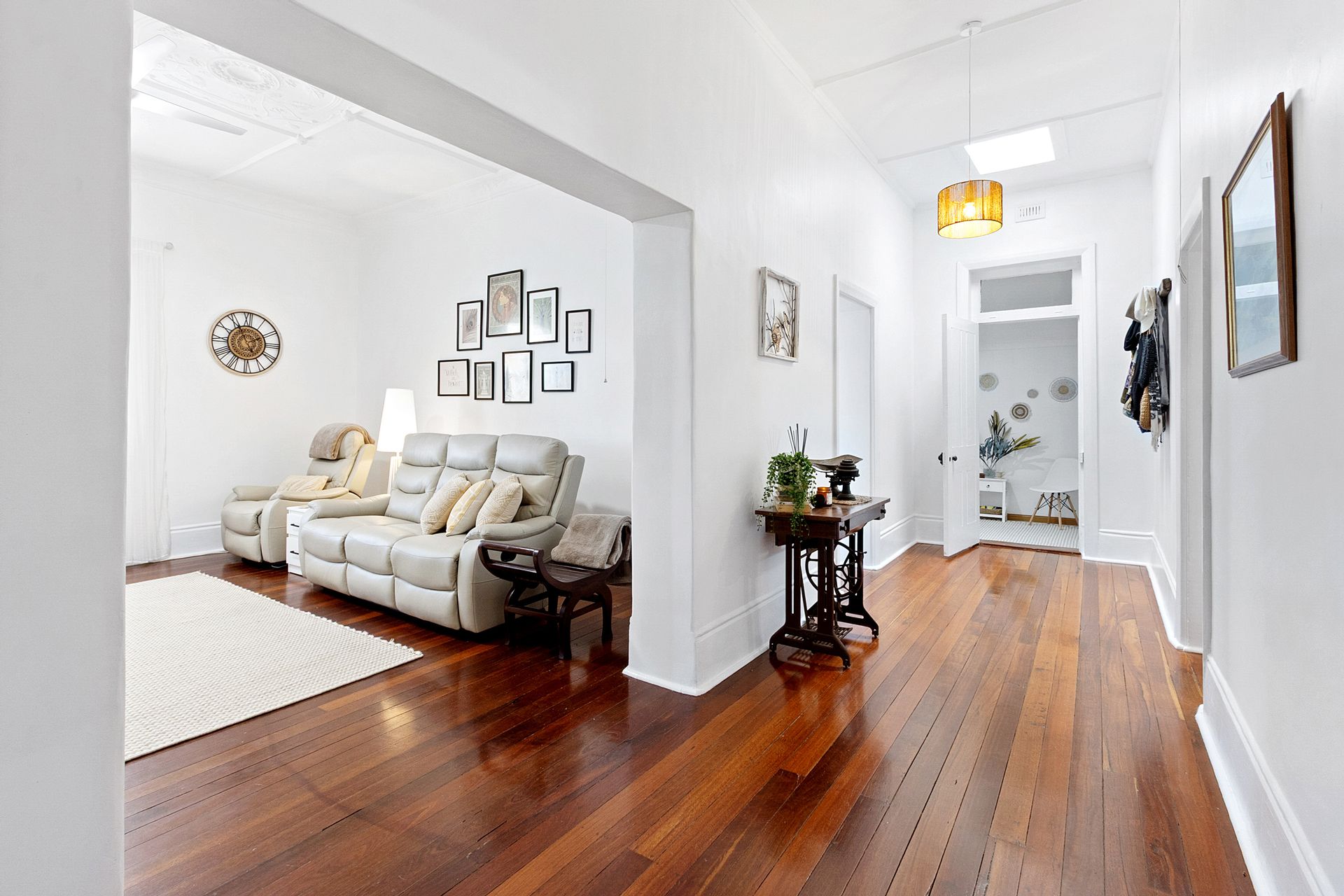Very spacious lounge room with slow combustion wood heater including beautiful polished jarrah timber floorboards that also feature the full length wide central passage to the front door.
