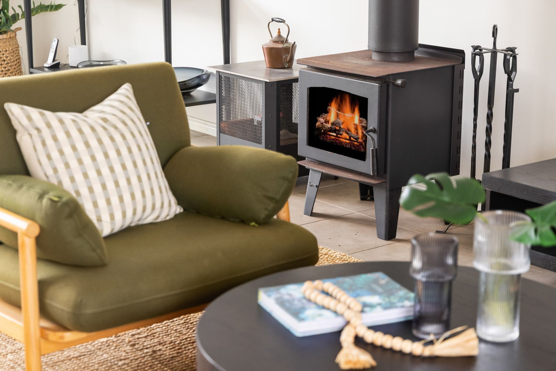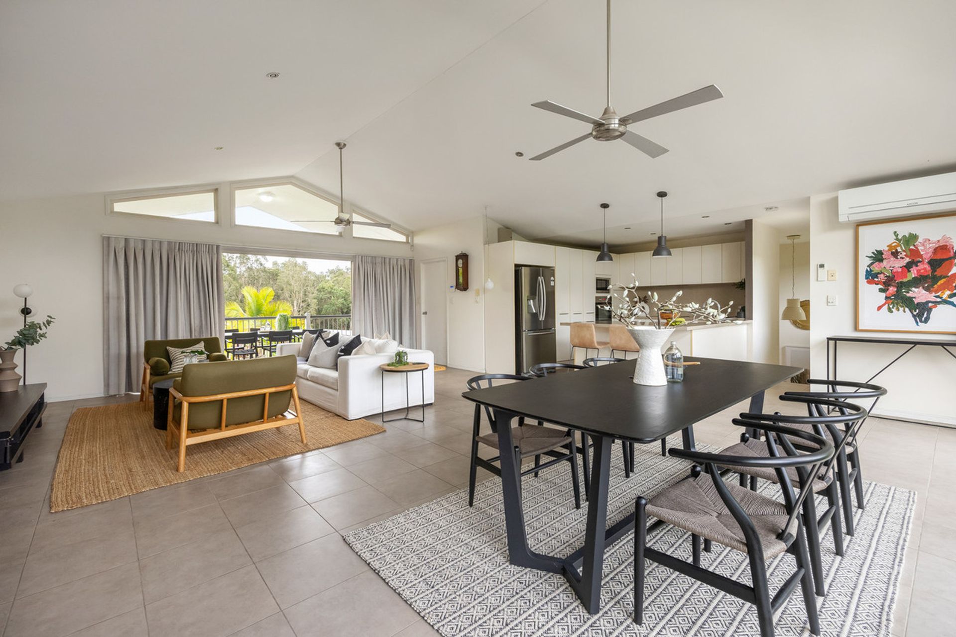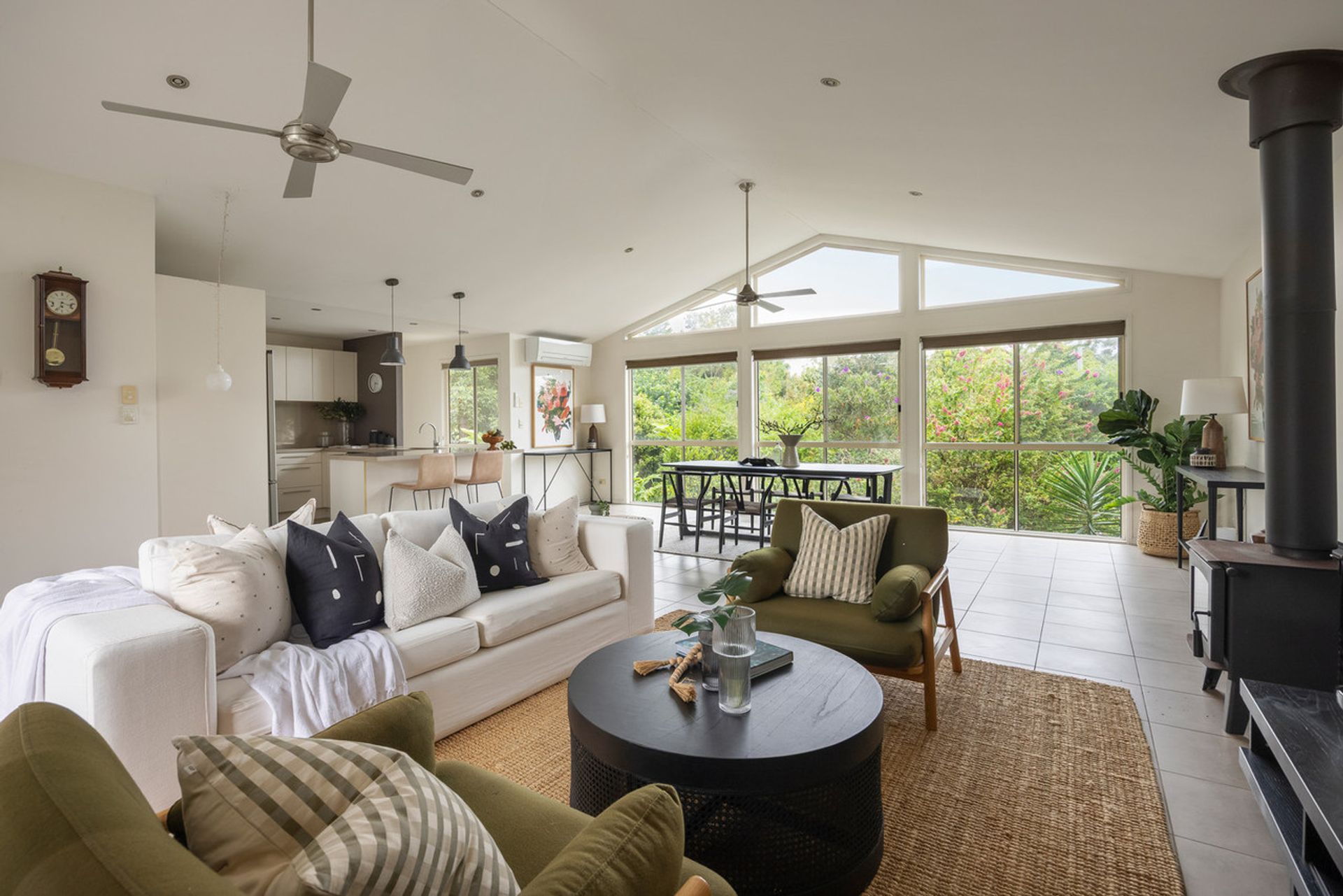 - Open-plan living with fireplace, high ceilings, and air conditioning