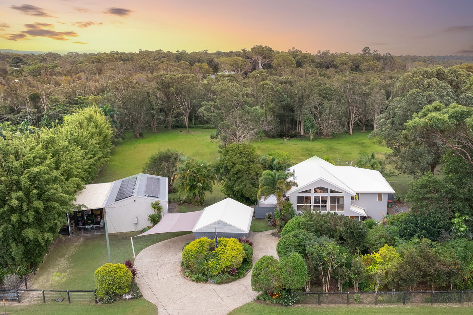 Set in a quiet, sealed country cul-de-sac, this beautifully maintained home offers peaceful, private living and is one of the closest acreages to Noosa. Surrounded by lush, established gardens, the property makes a striking first impression with its circular exposed aggregate driveway and a convenient drive-through carport, providing all-weather access.