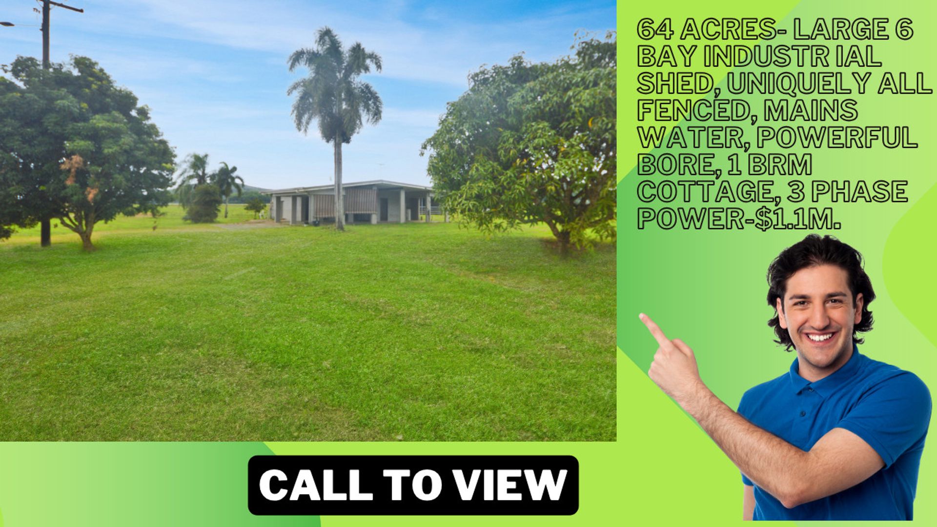 64 Acres – Industrial Shed, Cottage, Power + Water – $935K