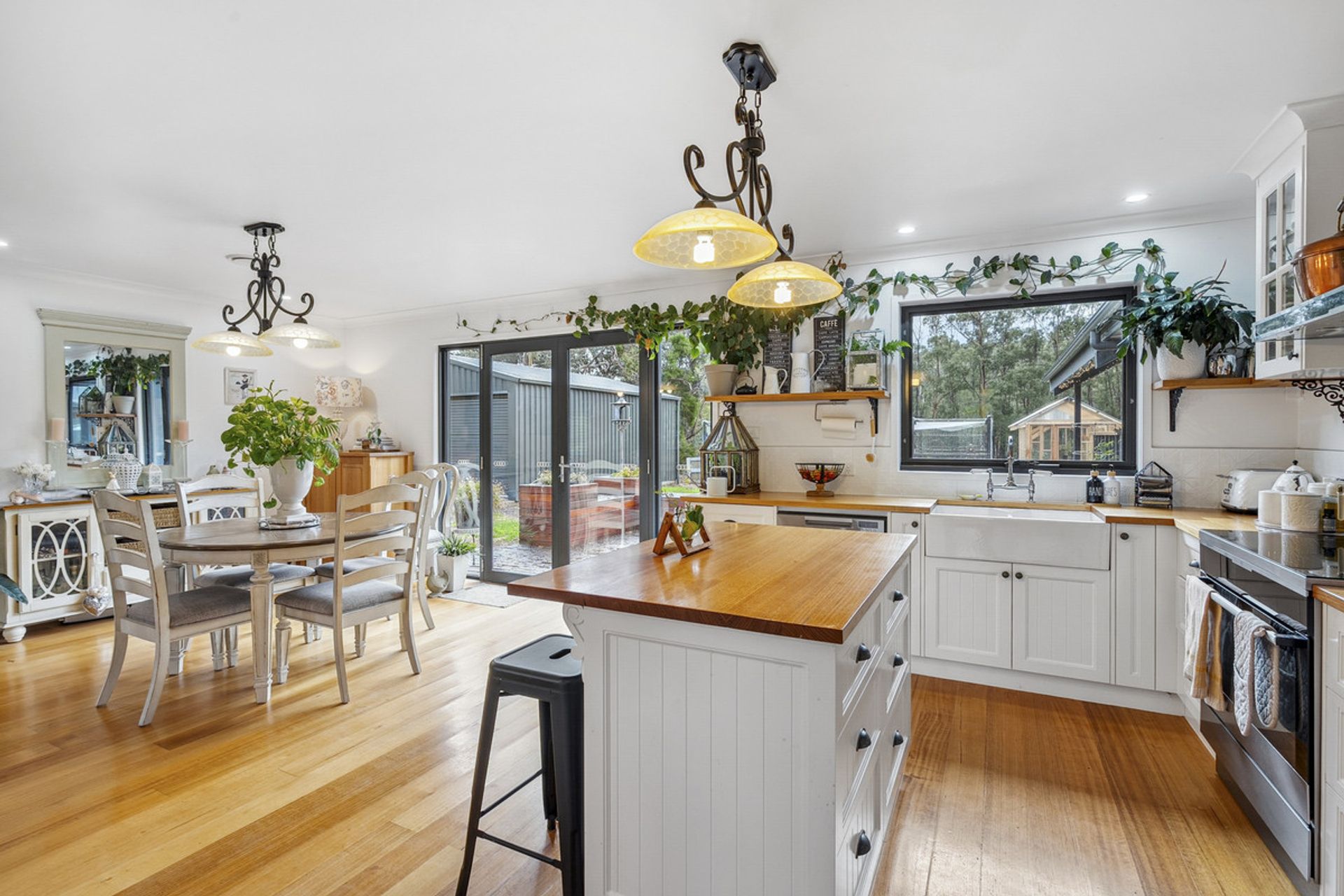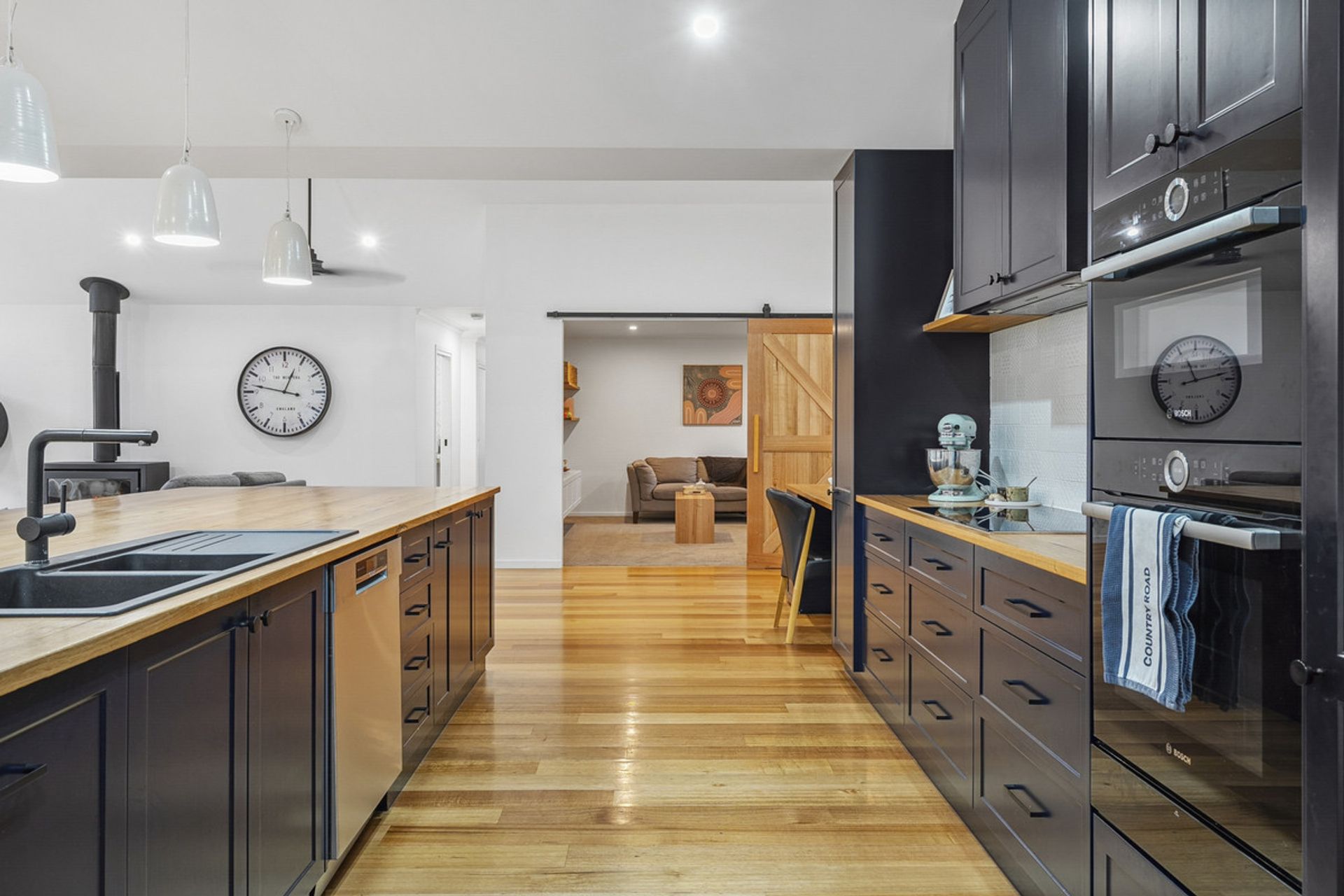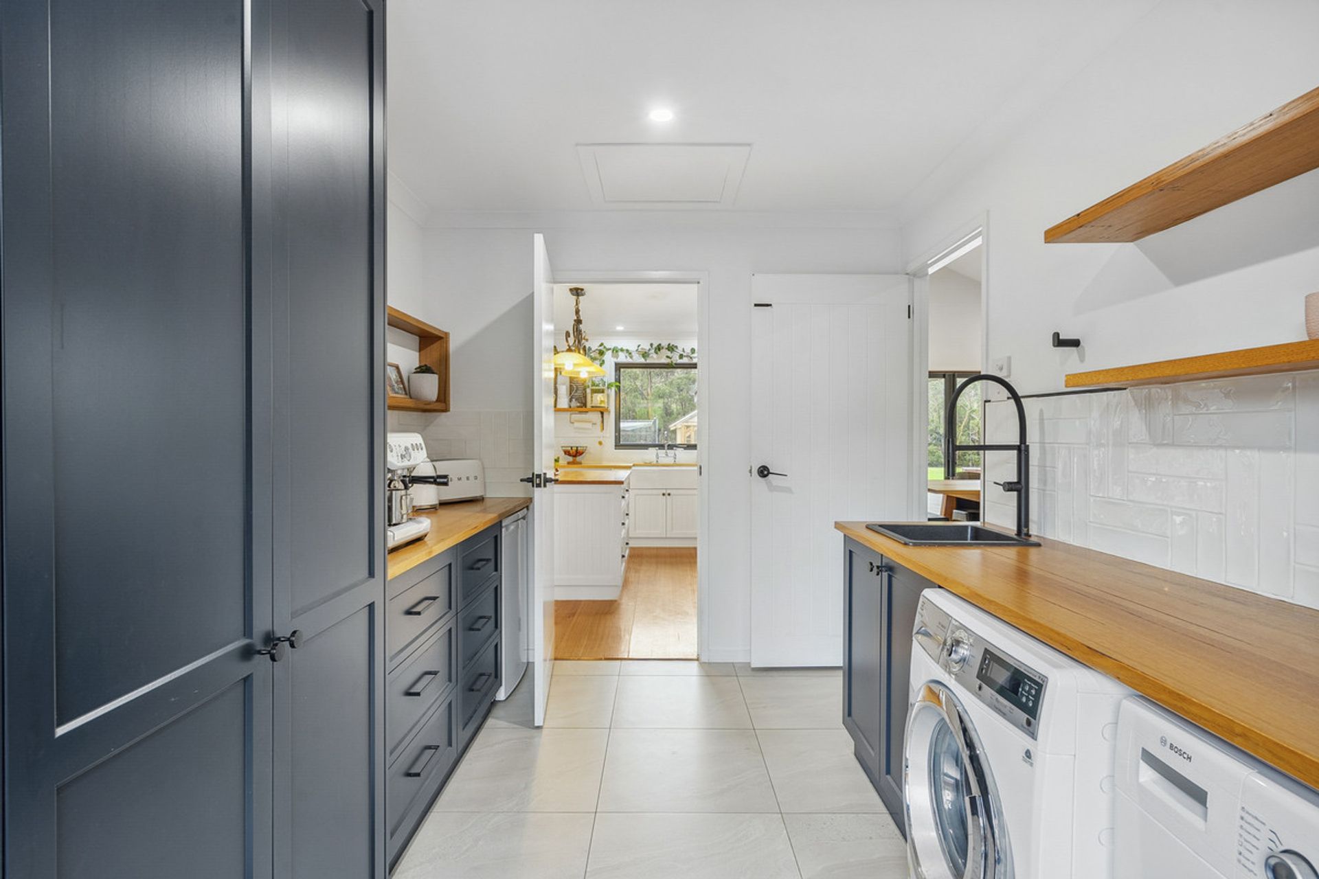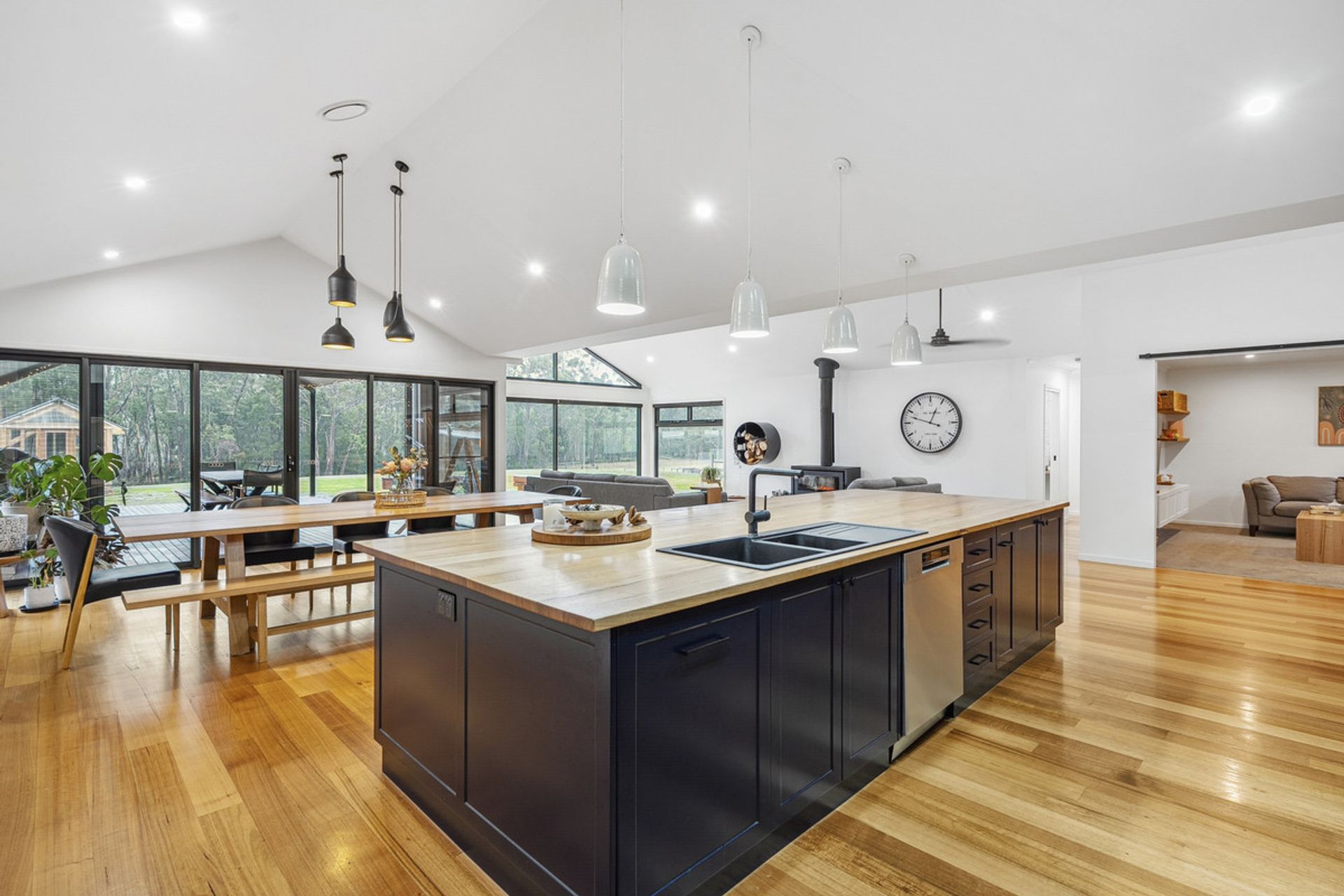 The heart of the home is a light-filled open-plan living space with soaring ceilings and large north-facing windows that capture the sun. The stunning timber benchtop in the kitchen adds warmth and character, complemented by a generous butler's pantry ideal for entertainers and home cooks alike.