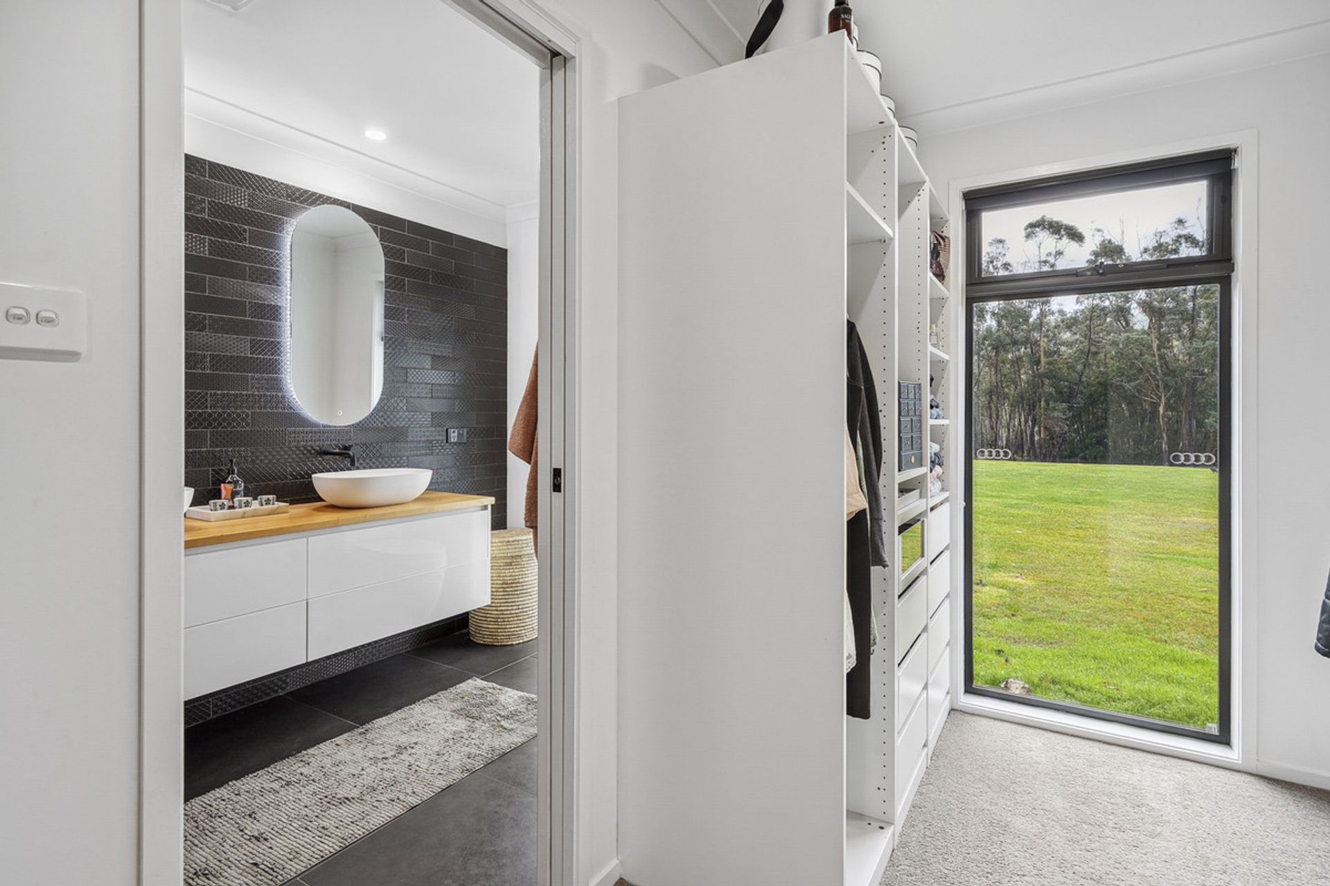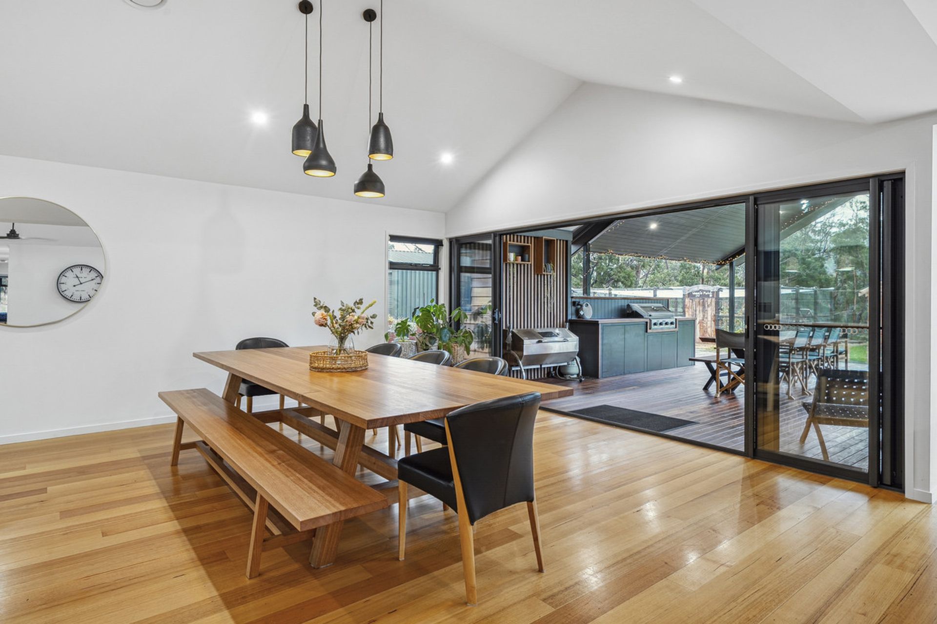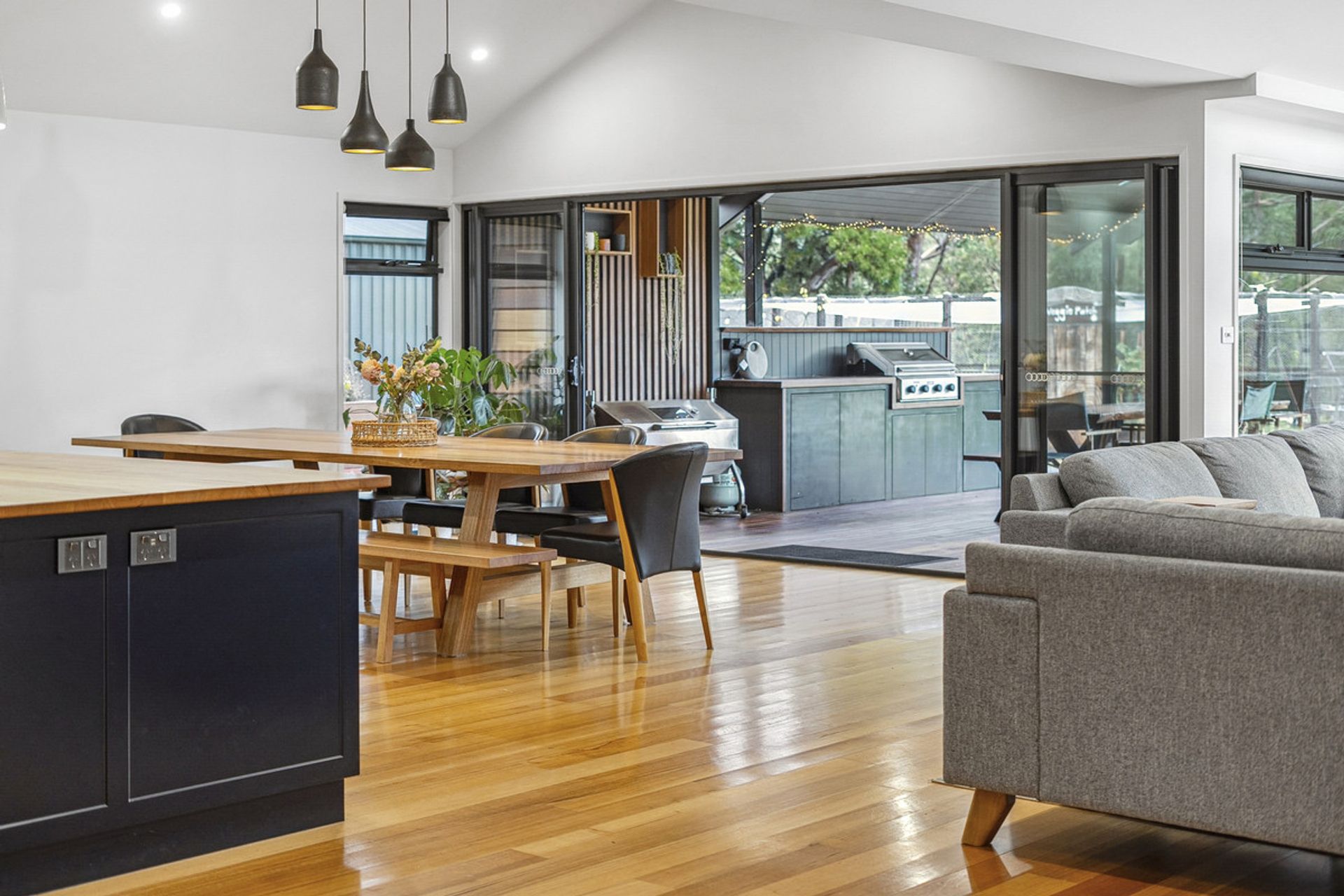 The heart of the home is a light-filled open-plan living space with soaring ceilings and large north-facing windows that capture the sun. The stunning timber benchtop in the kitchen adds warmth and character, complemented by a generous butler's pantry ideal for entertainers and home cooks alike.