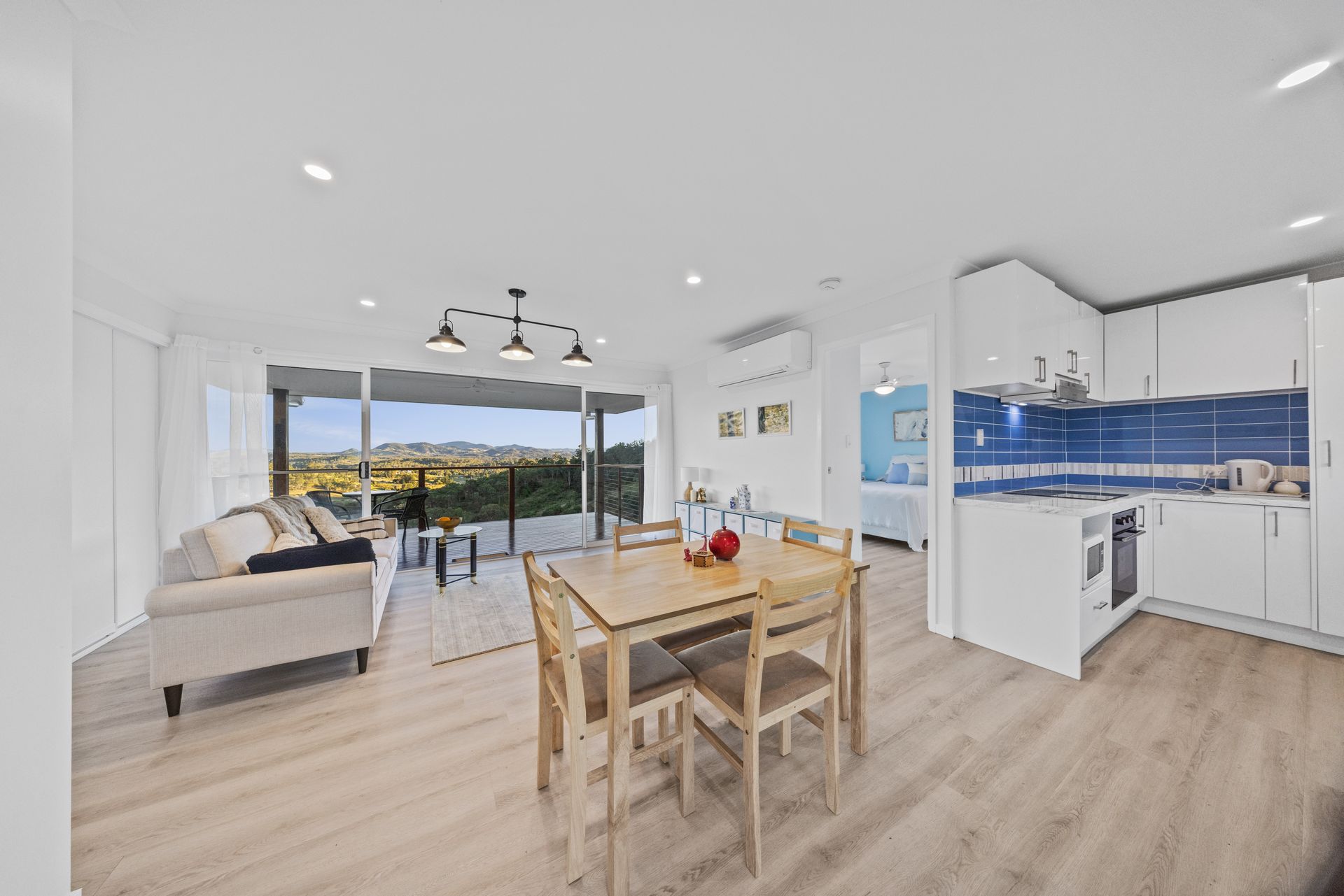 Centrally positioned, the open-plan kitchen, living, and dining area is both stylish and welcoming, designed to enhance connection and flow. Air conditioning provides year-round climate control, while expansive windows and sliding doors frame the extraordinary landscape beyond.