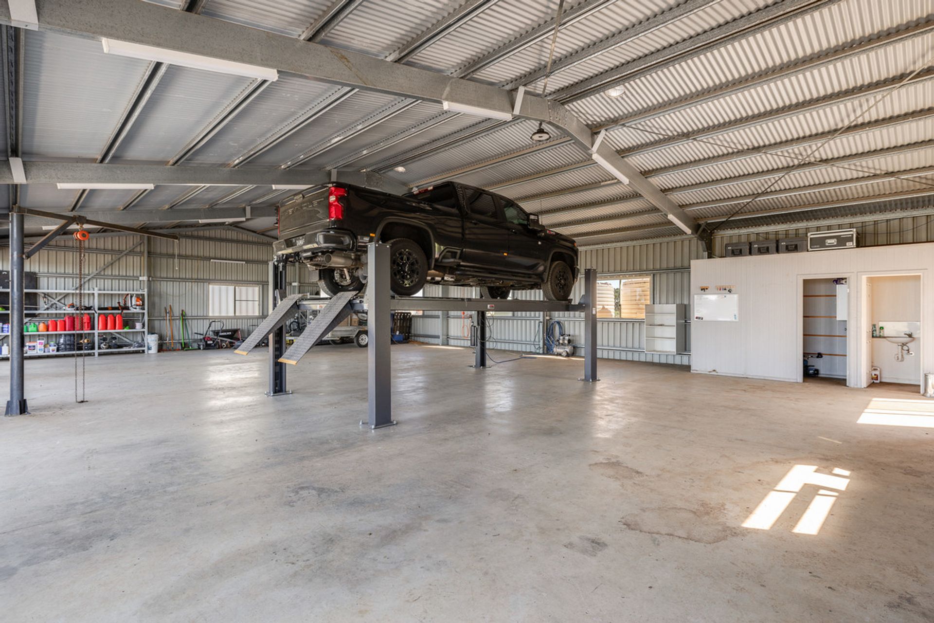 • 20 m x 13 m high clearance shed with three phase power, shelving, work benches & toilet