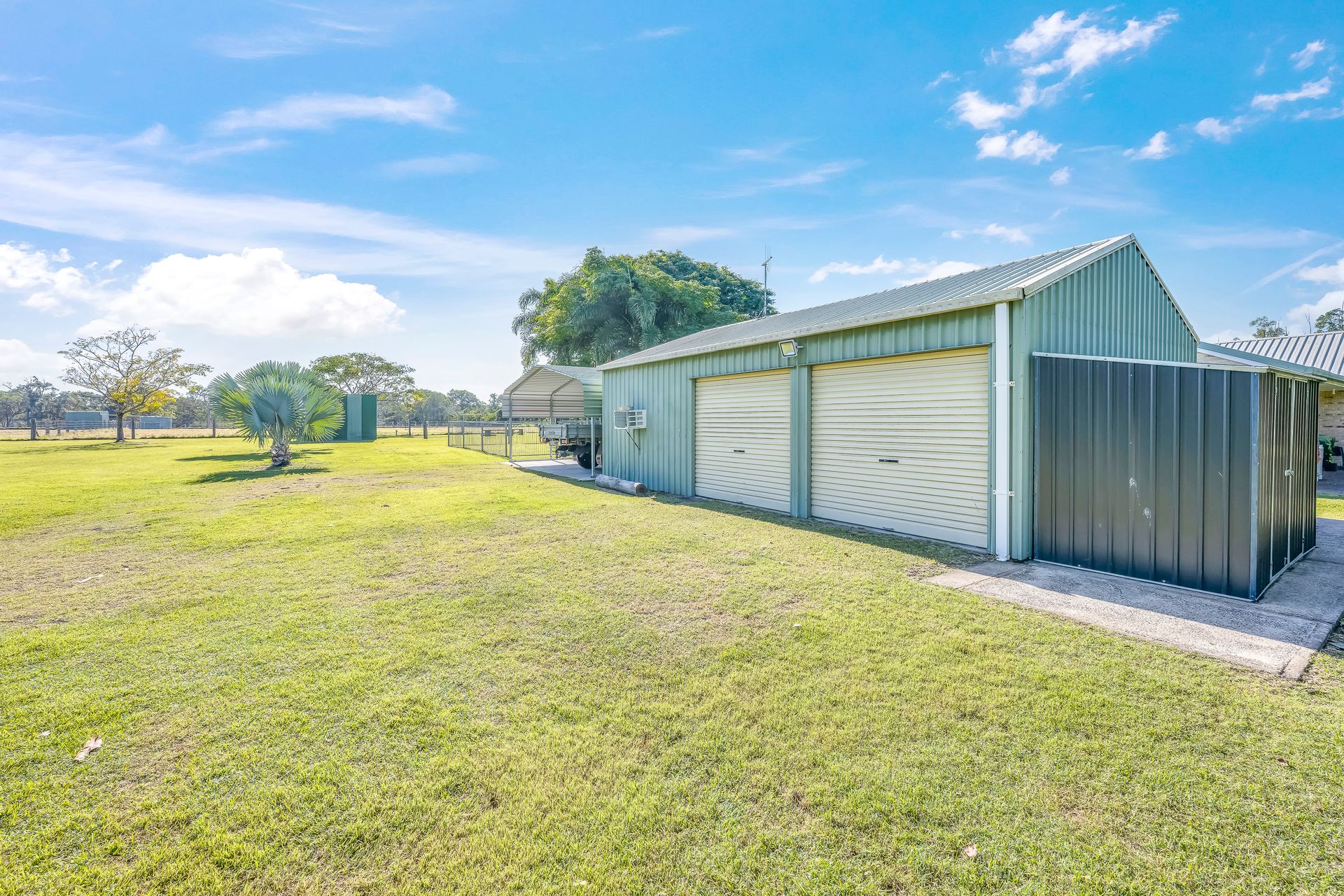 • Double lock-up garage, 4-bay machinery shed, large chook pen, garden shed