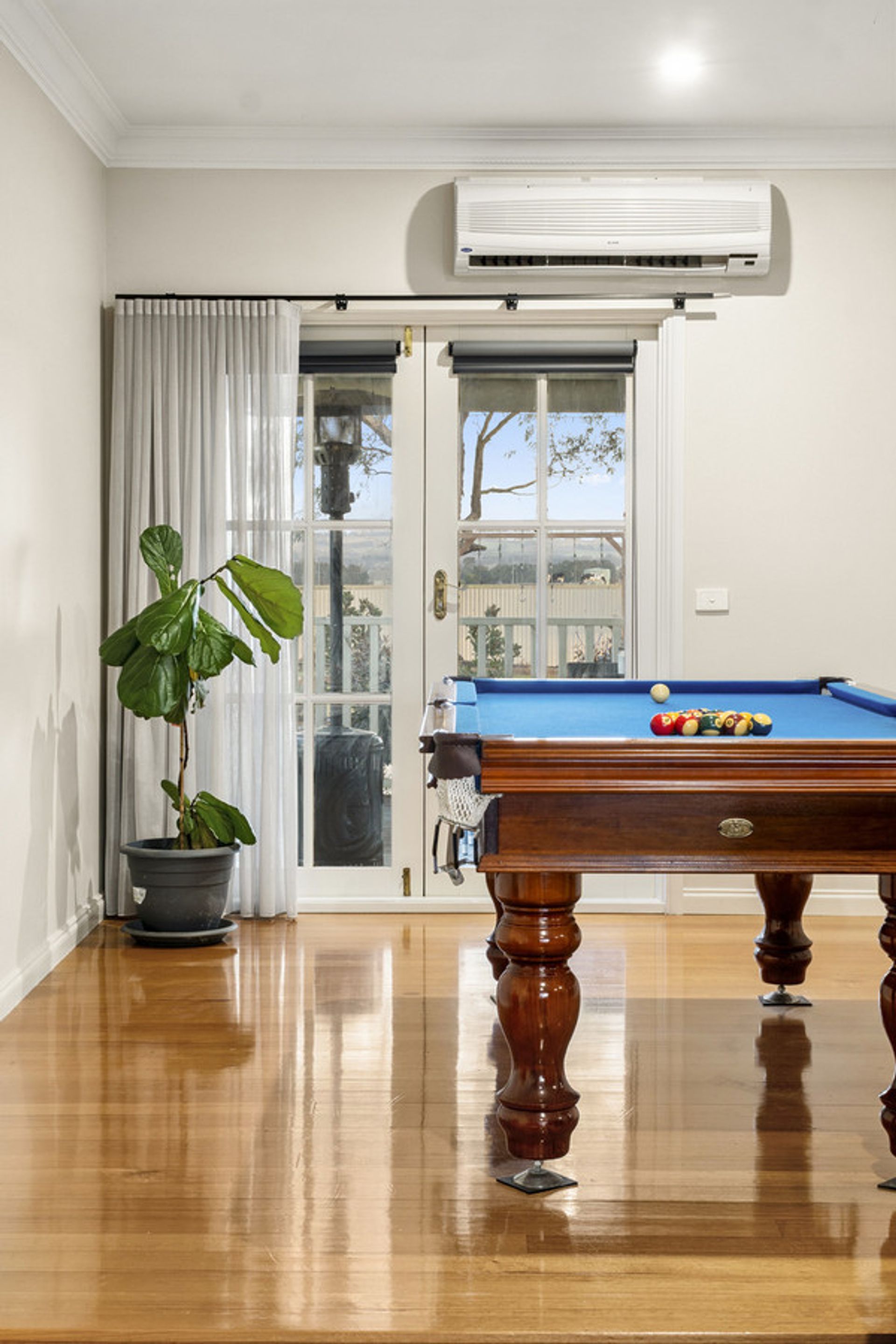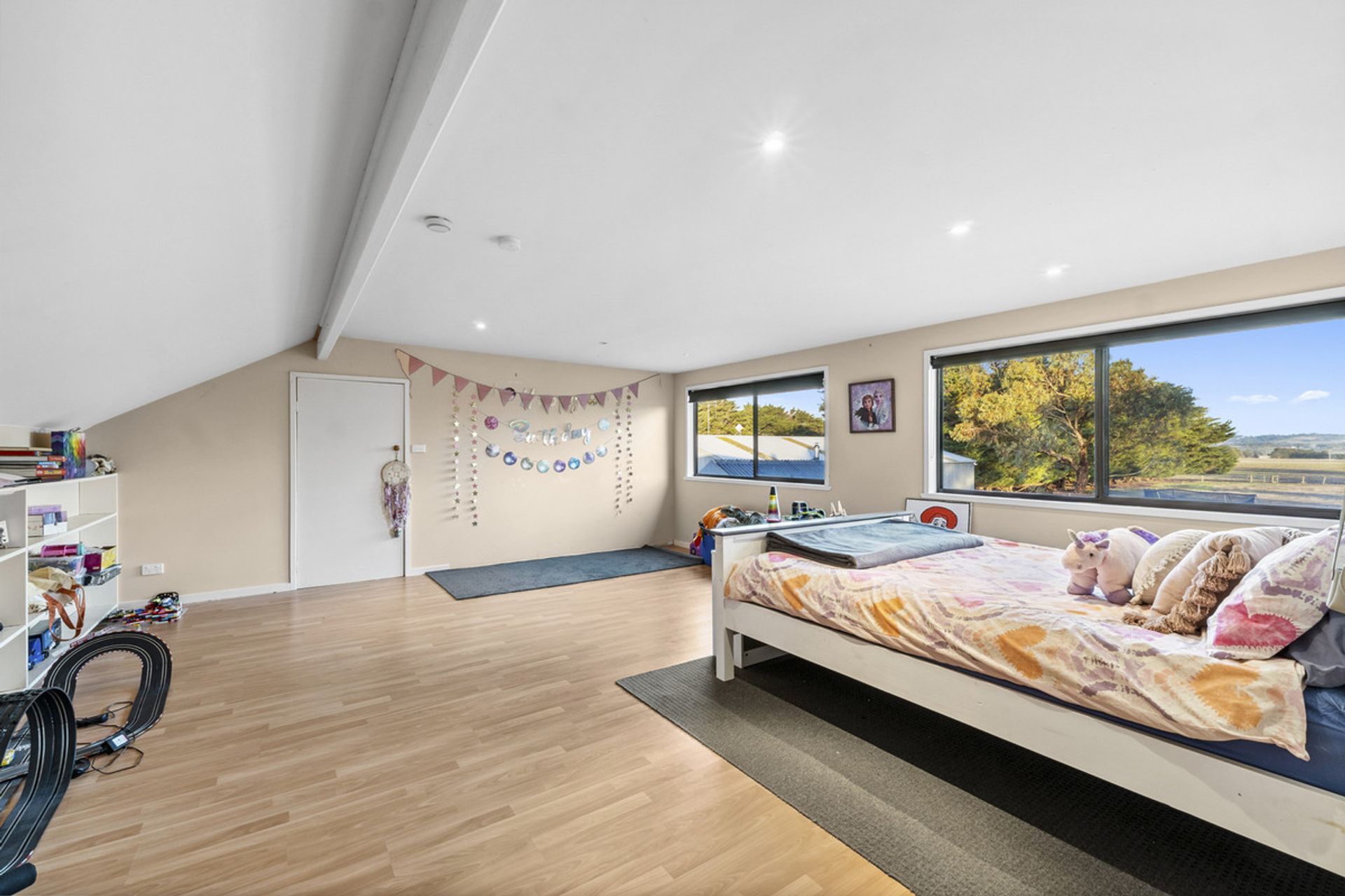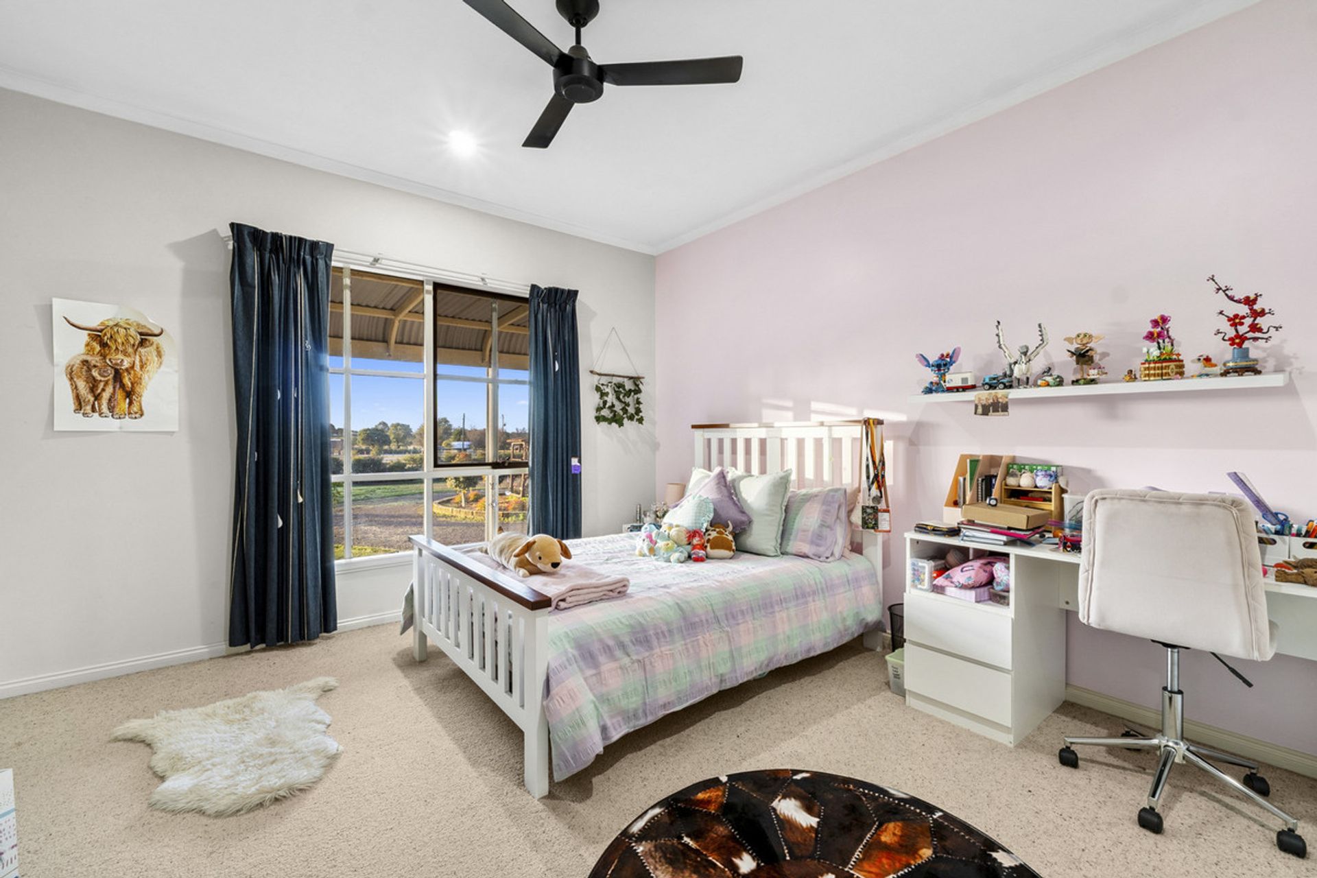 Additional features of the home include a dedicated study with built-in desk and shelving—ideal for a home office or teen's study zone which leads upstairs to the 4th bedroom or games room. Year-round comfort is ensured with wood heating in the living area, ducted heating throughout the bedrooms, and a reverse cycle air conditioner for warmer months.