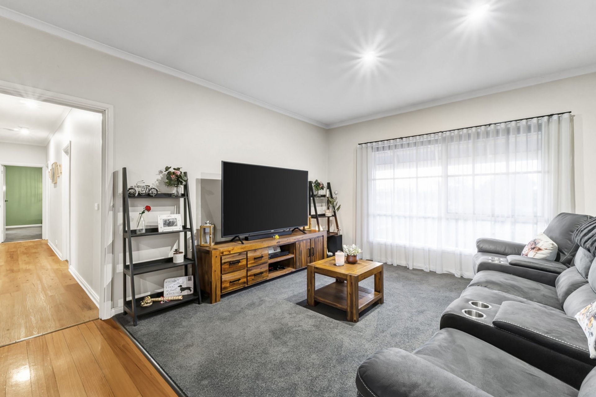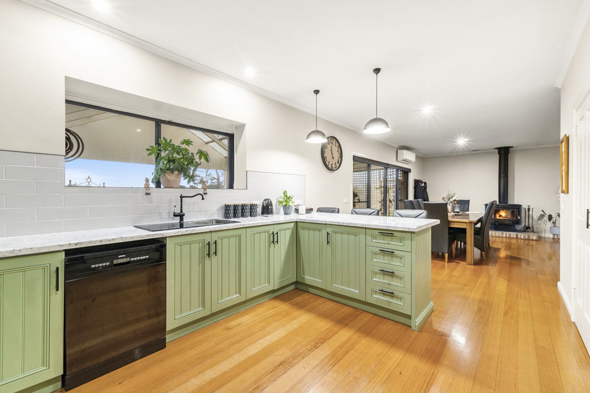 Step inside to discover a home that has been thoughtfully and extensively renovated. The open plan kitchen and dining area has been transformed into a stylish and functional heart of the home, boasting timber cabinetry, polished floorboards, electric cooking, a dishwasher, expansive bench space, and a generous walk-in pantry. This space opens out to a large south-facing timber deck—ideal for entertaining or family gatherings.
