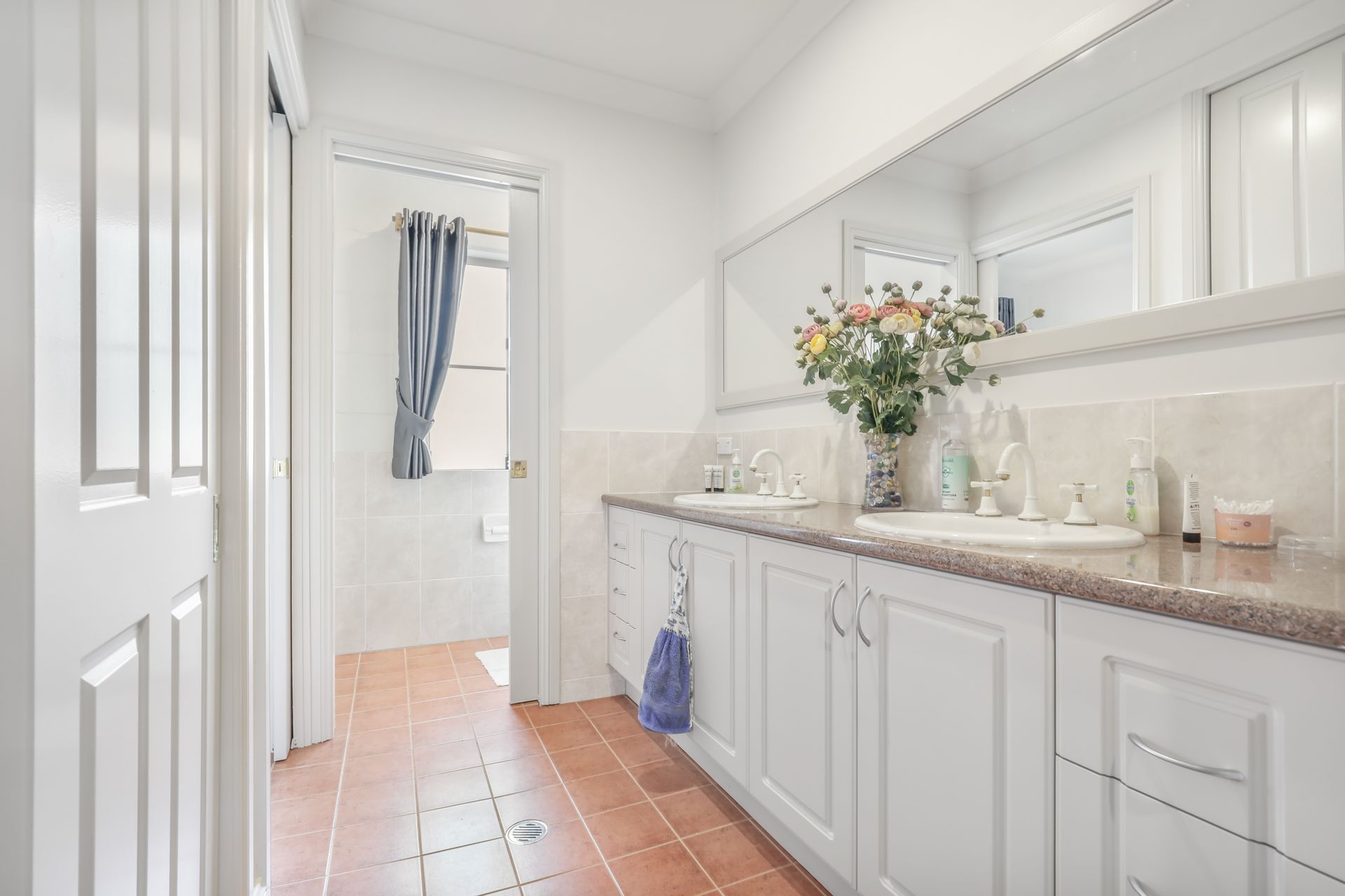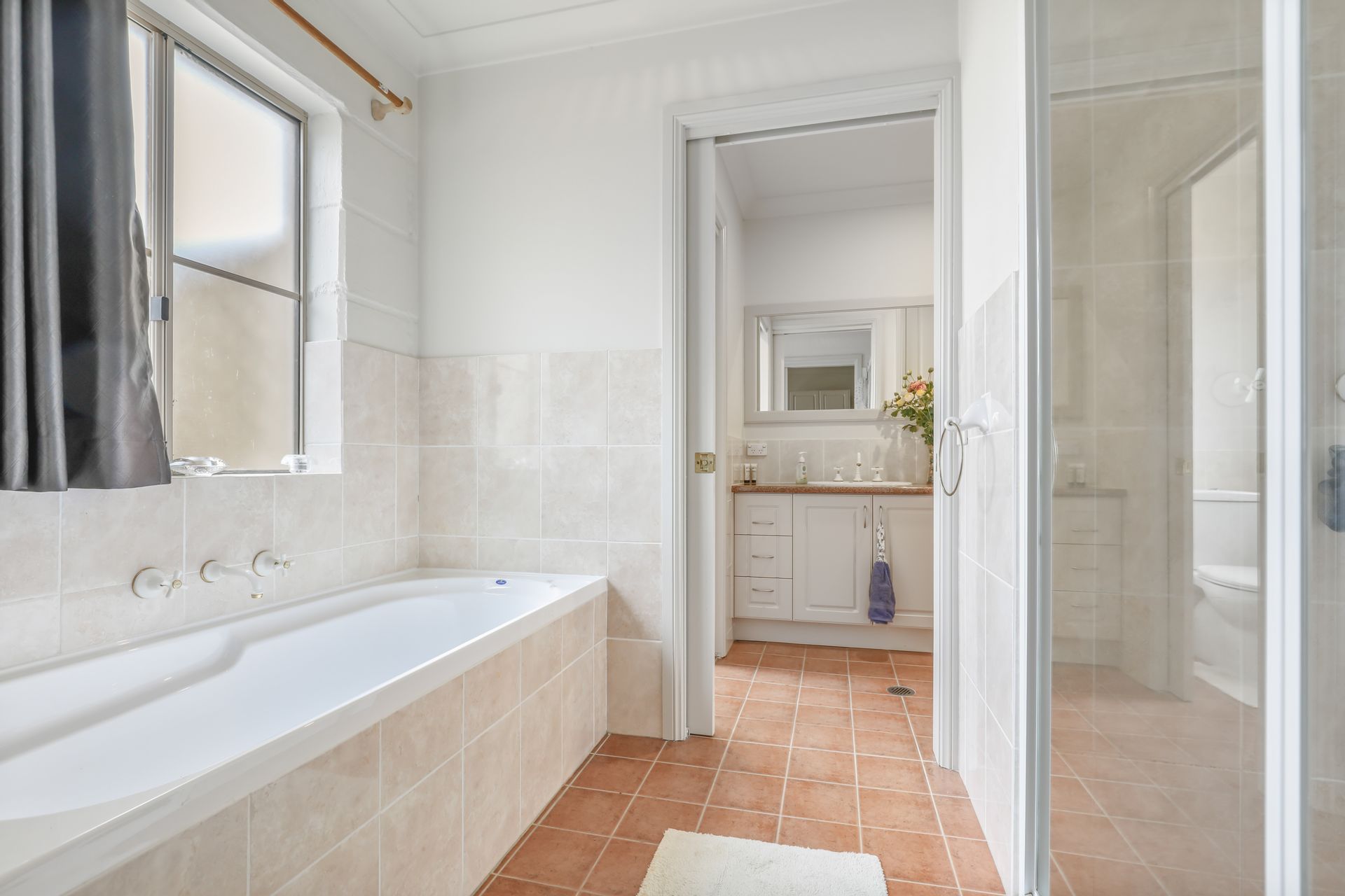 • Central three-way bathroom with double vanity, bath, and separate toilet