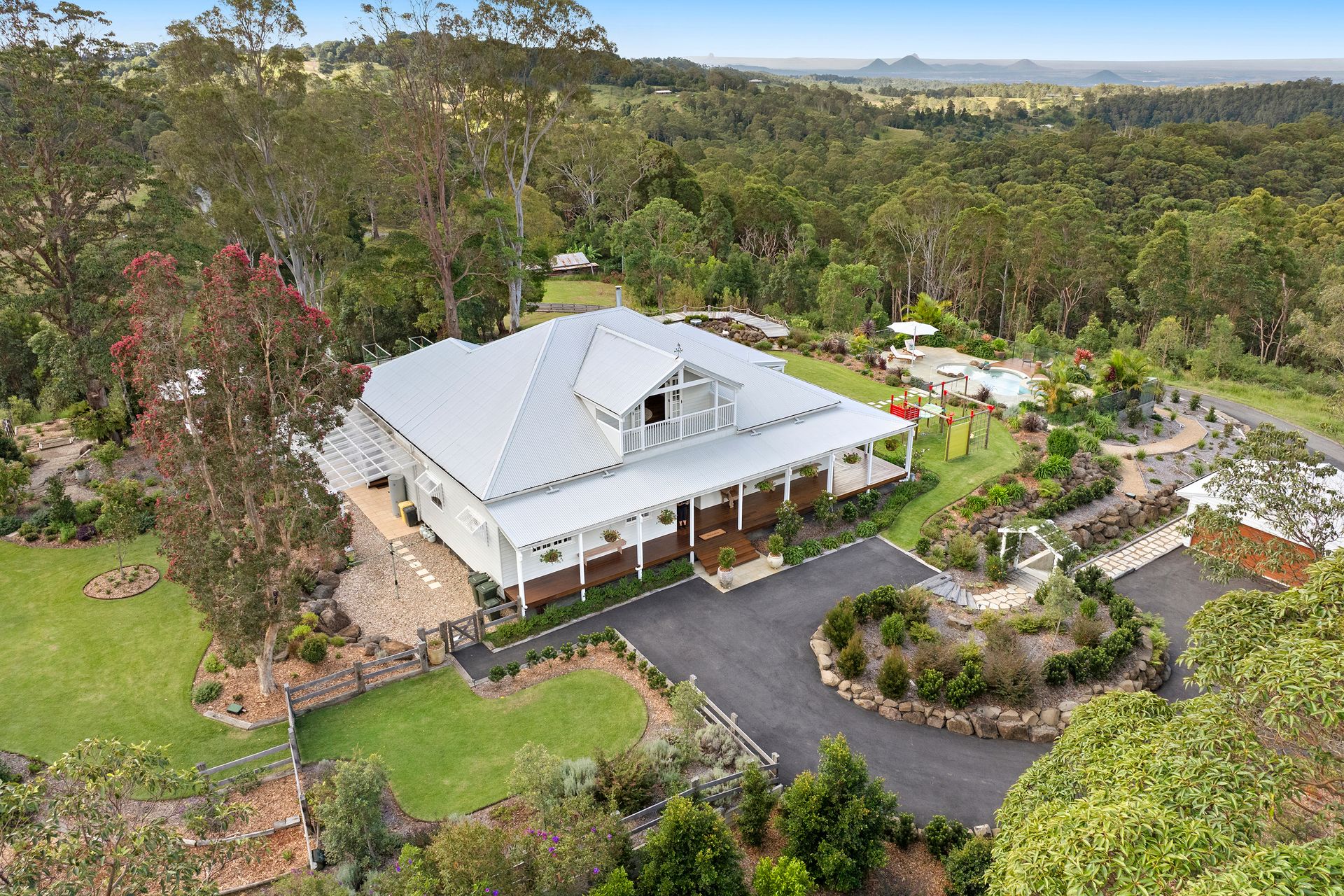 Perched above the clouds at 500 metres is "Lorelei Manor" set on 40 picturesque acres capturing the romance of a classic country manor with the soul of a resort retreat with a magnesium pool, Balinese pavilion, sweeping views of the Glass House Mountains, Moreton Bay and more!