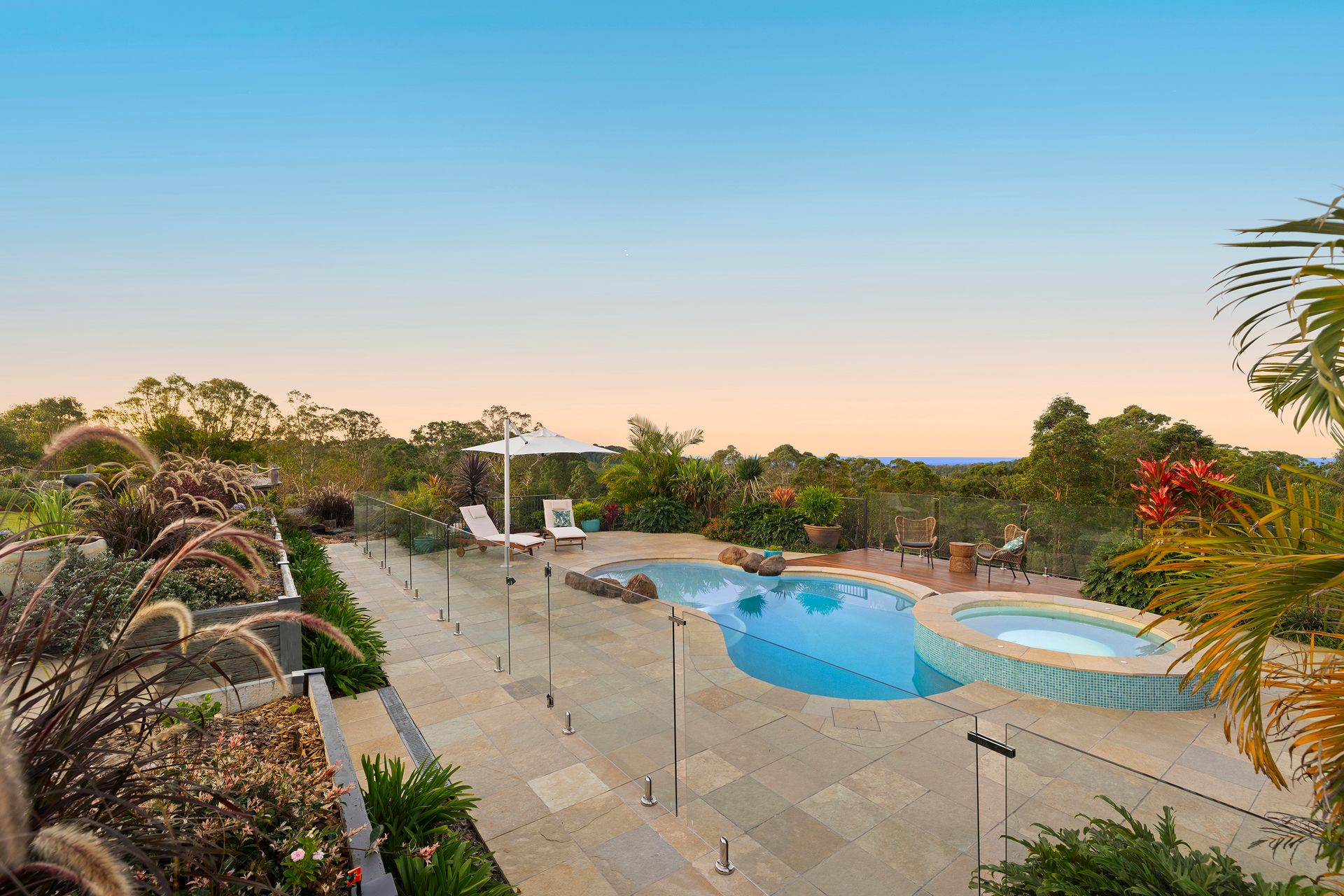 On one side of the property there is a children's playground area with suspension bridge, swings and climbing wall and an award winning, 8 metre heated magnesium salt pool complete with 3.5m tilting cantilever umbrella, decking, hot spa and beach!