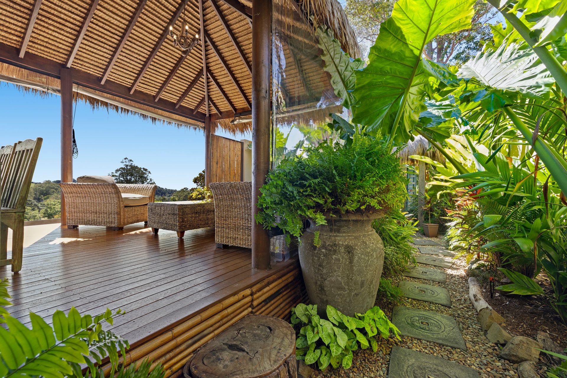 On the other side there's a magnificent Mediterranean inspired courtyard, BBQ area with 6 burner BBQ and an enclosed tropical Balinese garden oasis with water features and a resort style thatched pavilion hut. It's always 5 o'clock at your blissful Bali abode!