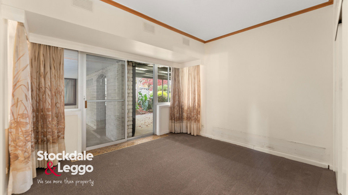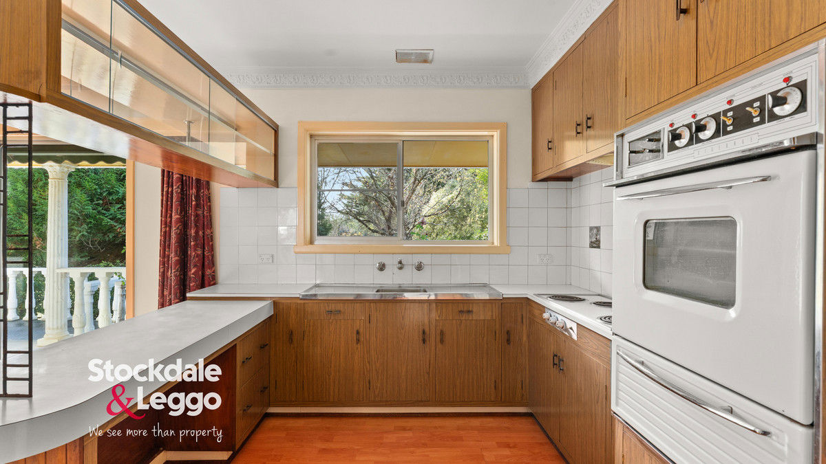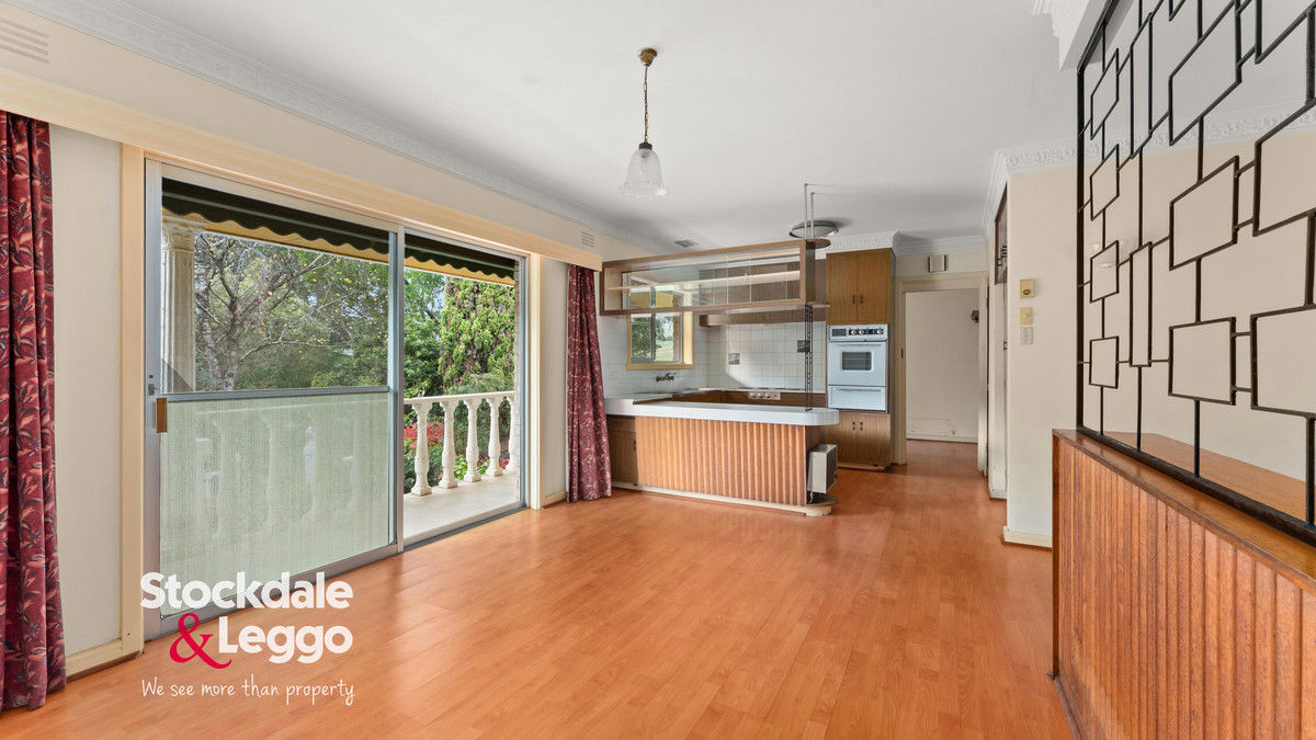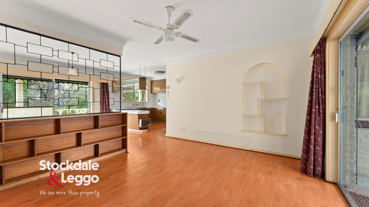A wide entry hall opens from the protected front porch—an inviting space to enjoy the peaceful garden outlook. The heart of the residence is a spacious open-plan kitchen, dining, and living area, complete with split system heating and cooling, a ceiling fan, and seamless flow to both front and rear patios. The kitchen retains its original charm, featuring electric cooking and overhead cabinetry, with clear potential to modernise and add value.