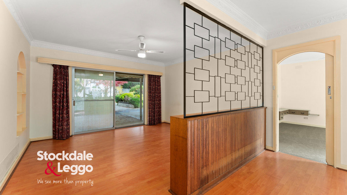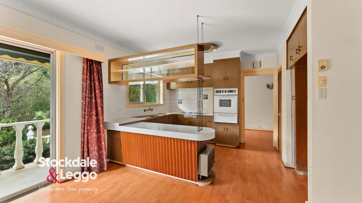 A wide entry hall opens from the protected front porch—an inviting space to enjoy the peaceful garden outlook. The heart of the residence is a spacious open-plan kitchen, dining, and living area, complete with split system heating and cooling, a ceiling fan, and seamless flow to both front and rear patios. The kitchen retains its original charm, featuring electric cooking and overhead cabinetry, with clear potential to modernise and add value.