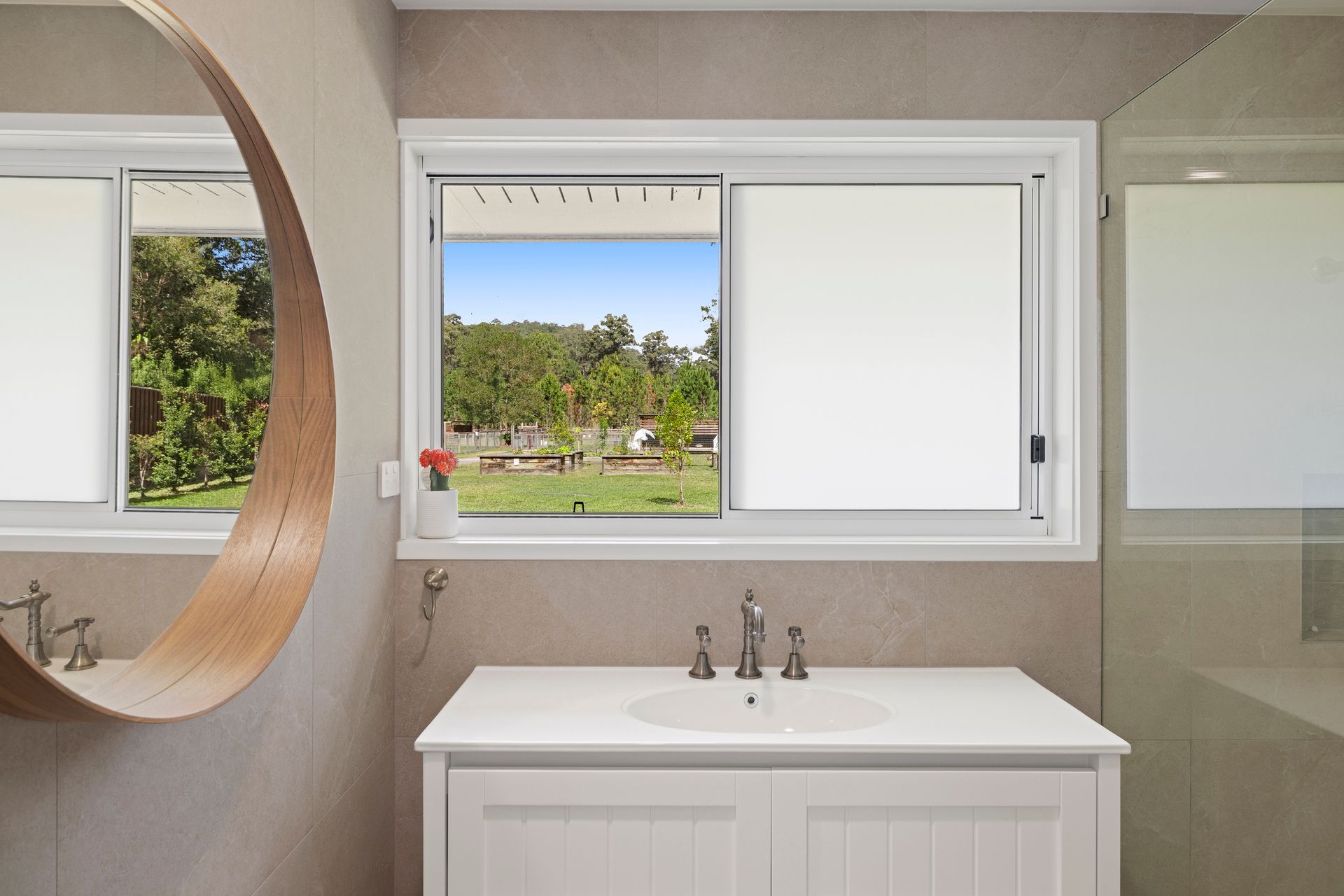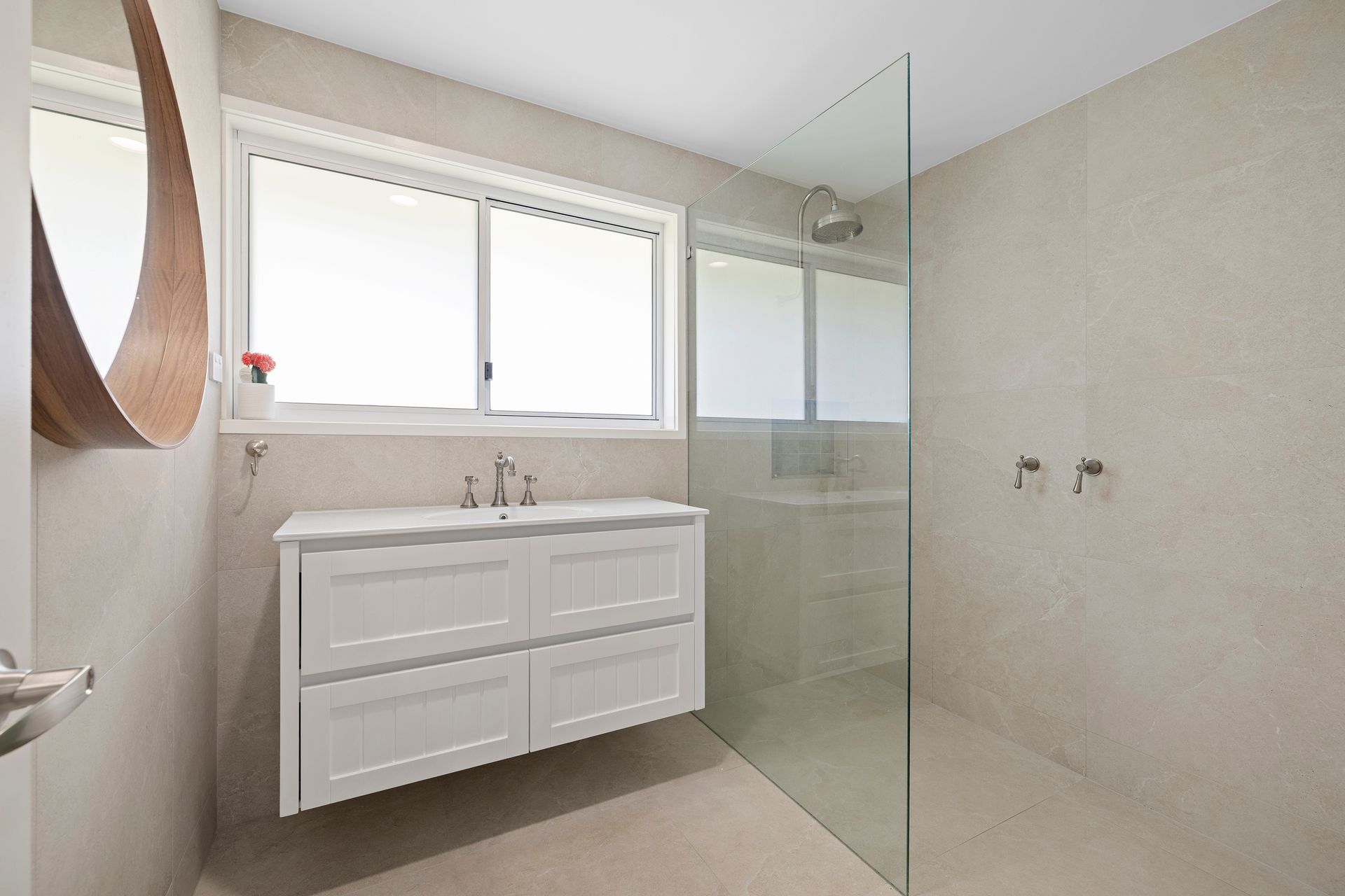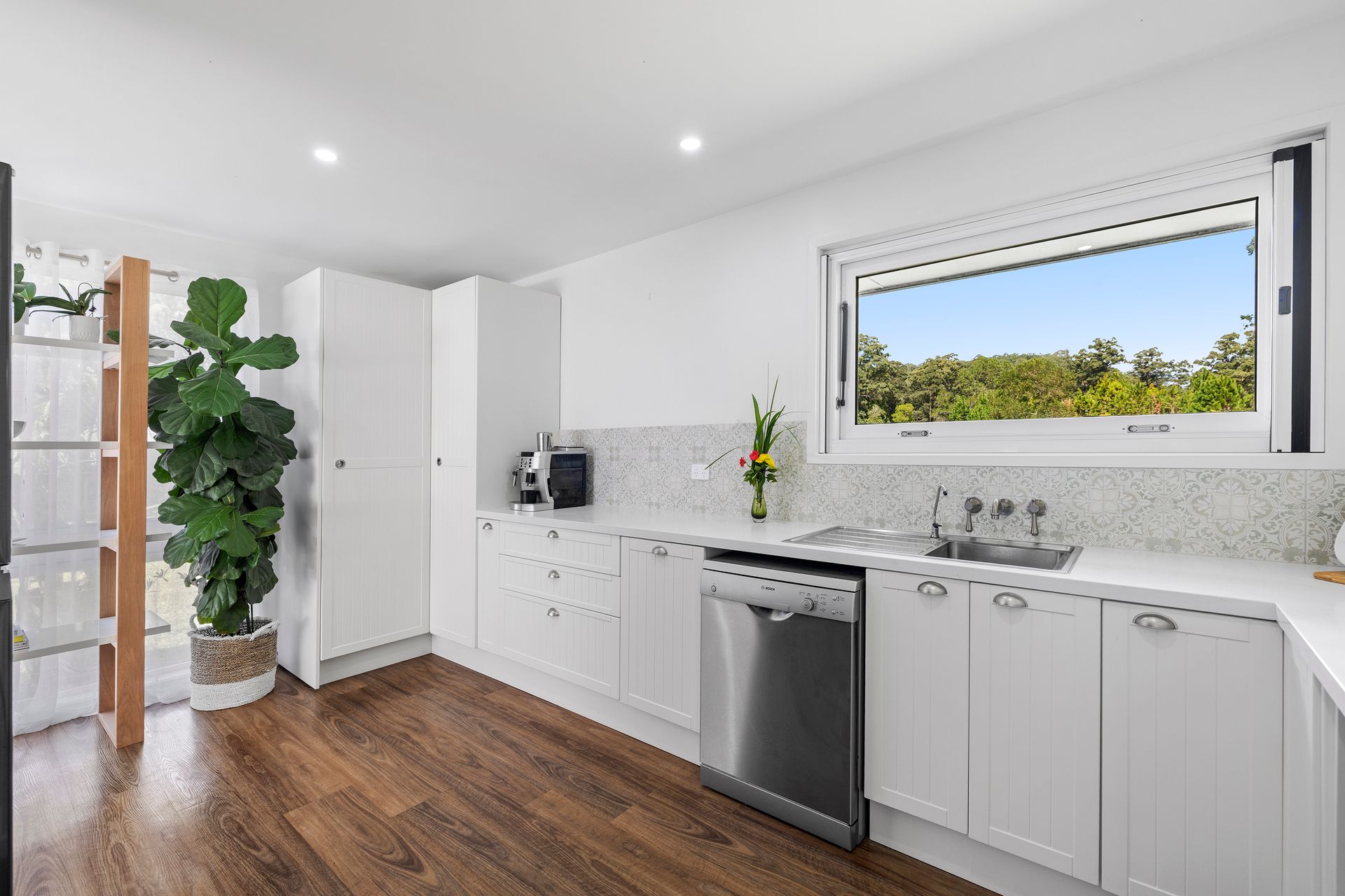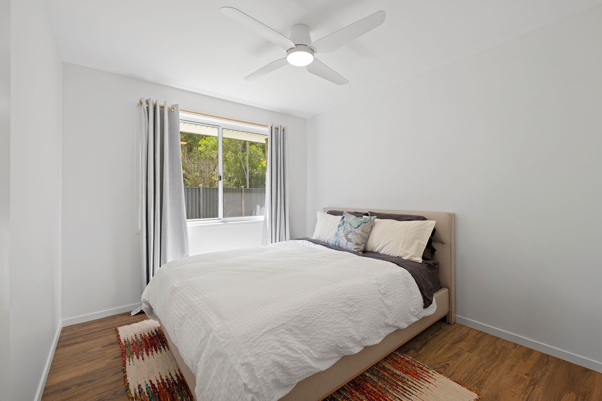 A light-filled hallway leads through to the home's main bathroom with separate toilet, well-appointed laundry and two bedrooms. The contemporary bathroom has large format floor to ceiling tiles, chic frameless shower, floating vanity and minimalist brushed nickel fixtures. The two bedrooms feature ceiling fans and leafy vistas, and the master comprises a large walk-in wardrobe.
