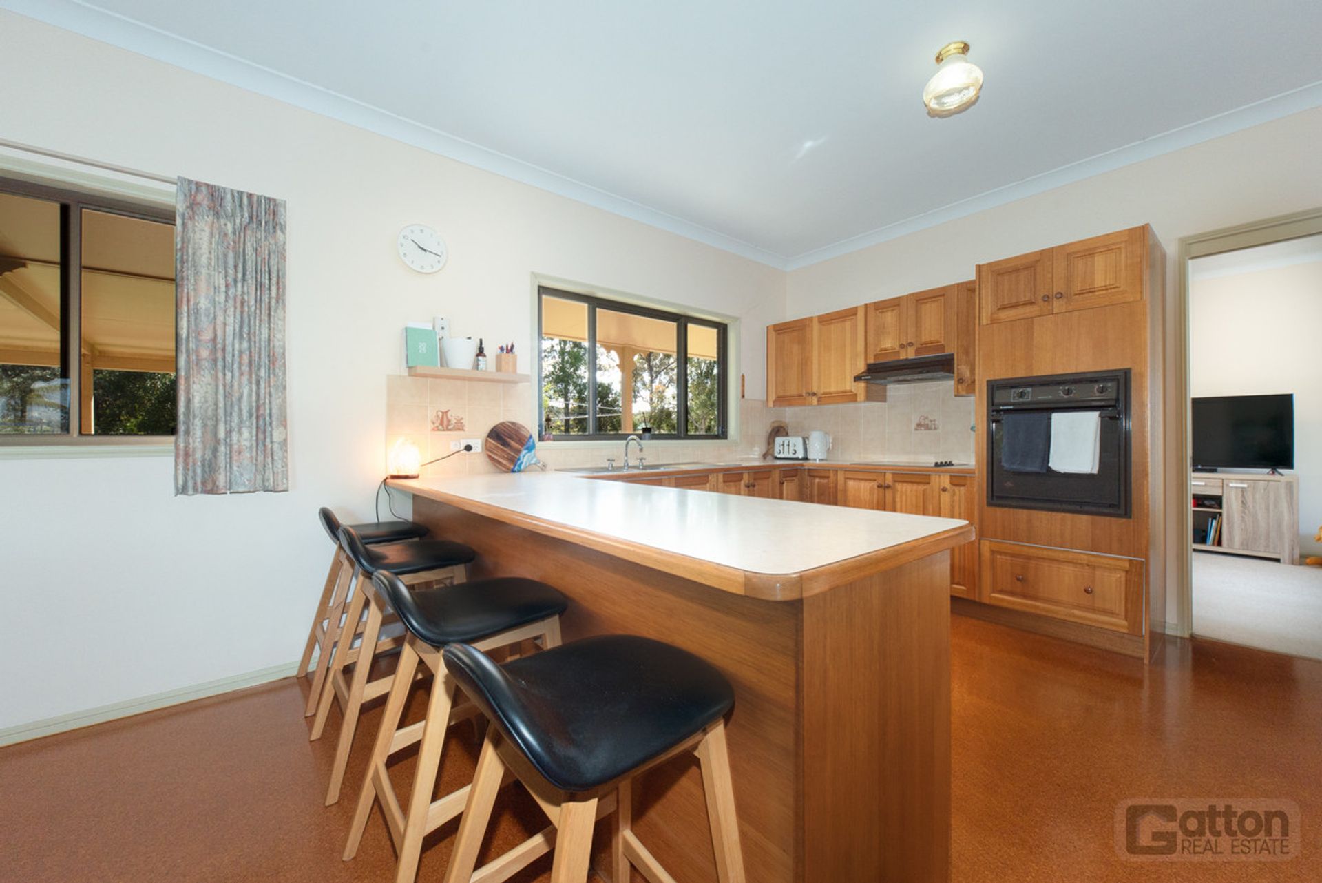 Gourmet Timber Kitchen: Tasmanian oak cabinetry, breakfast bar, and cork flooring blend style and functionality.