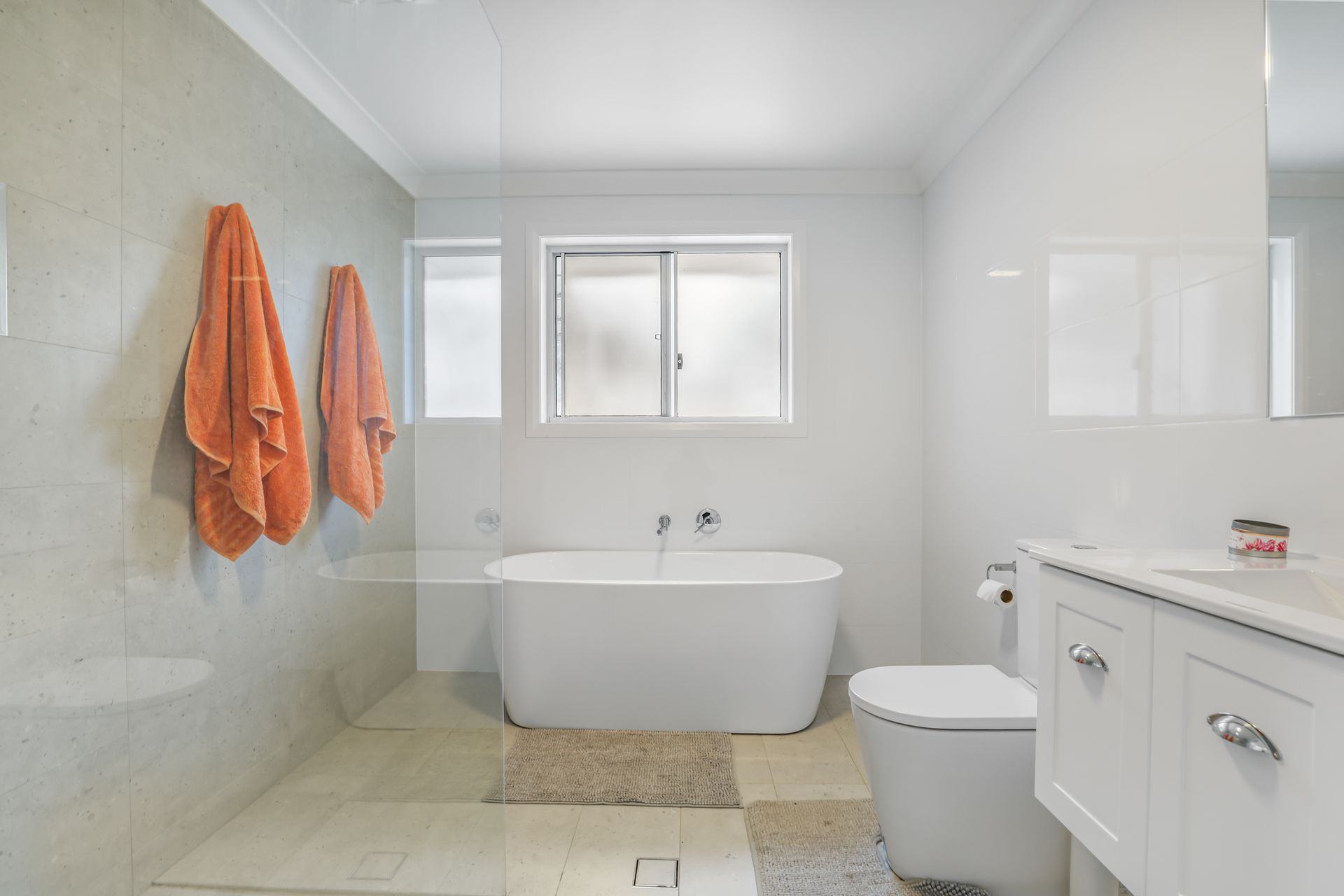 • Large main bathroom with floor-to-ceiling tiling and standalone bathtub