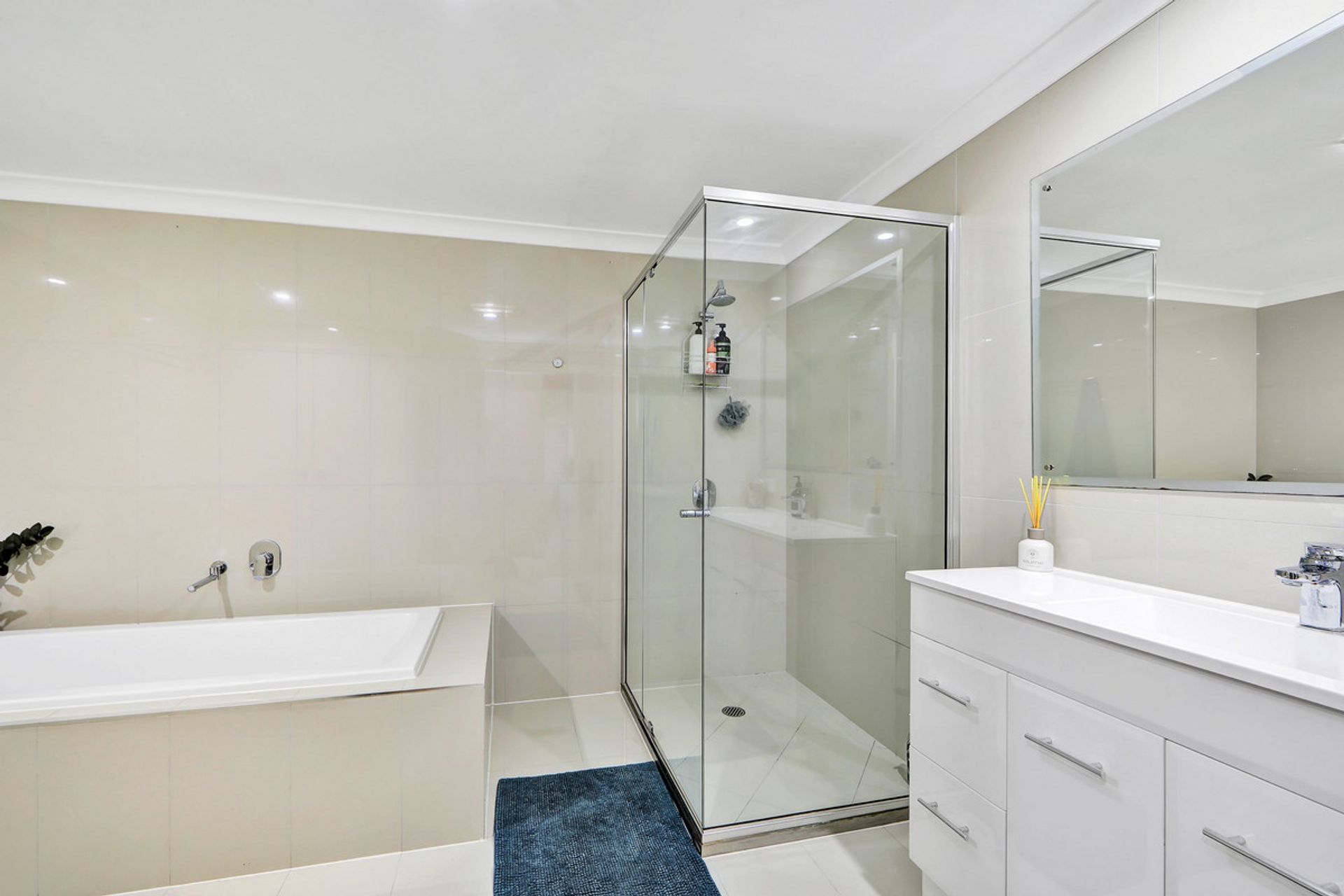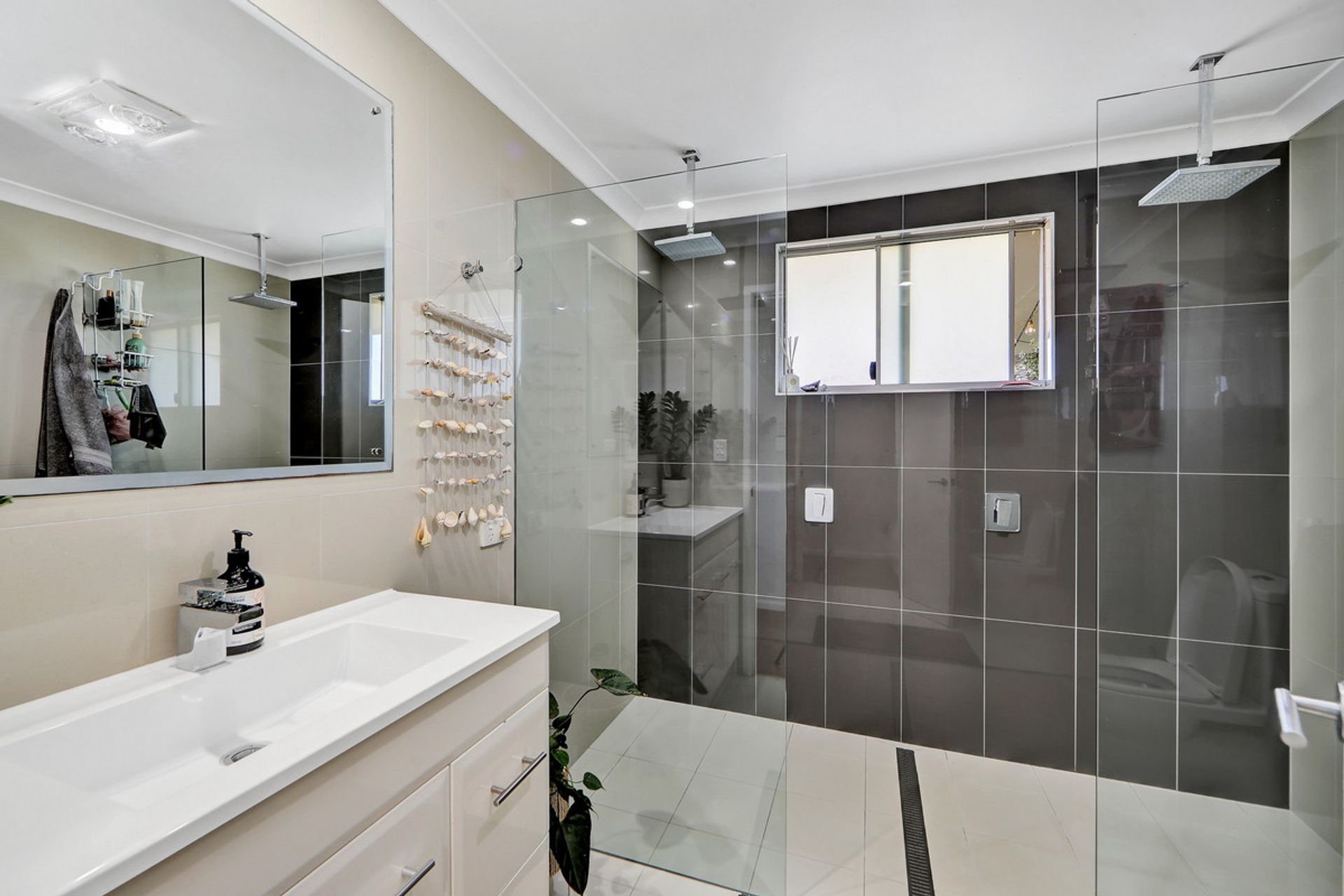 • Second modern bathroom with floor to ceiling tiles and oversized shower