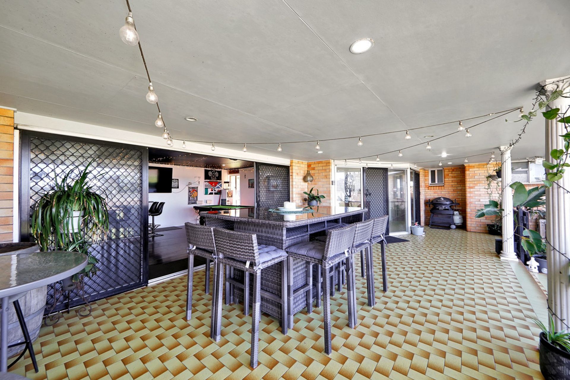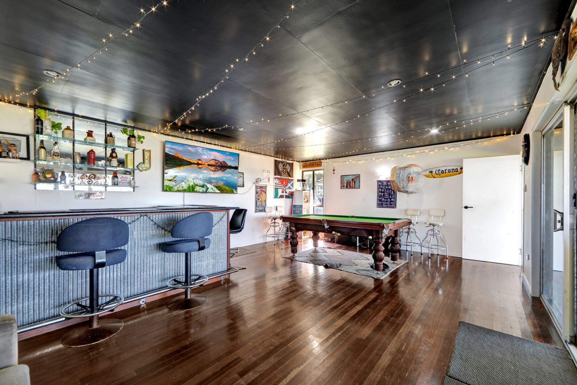 • Air-conditioned rumpus room featuring timber flooring and built-in bar, opening onto large outdoor entertainment area