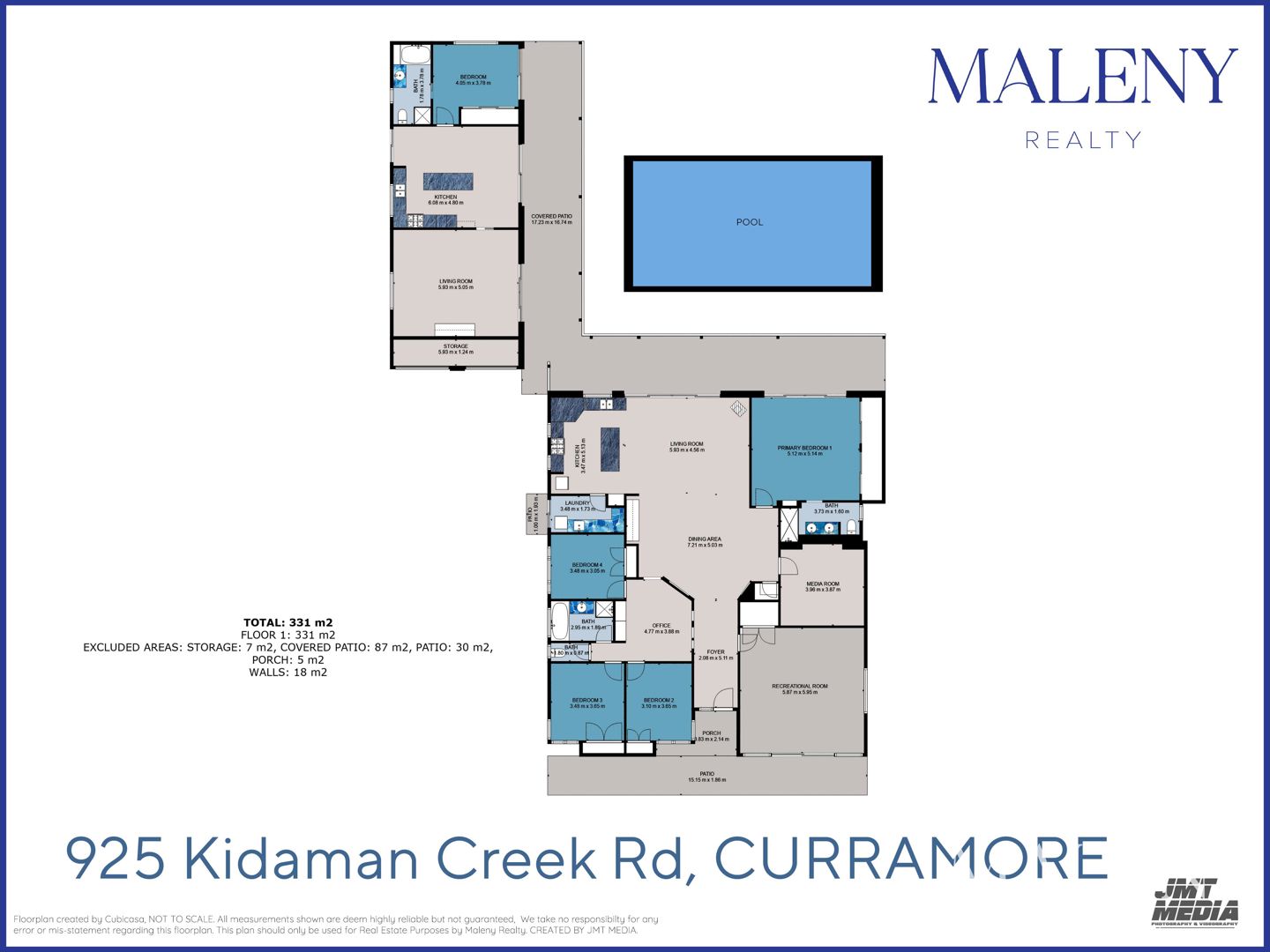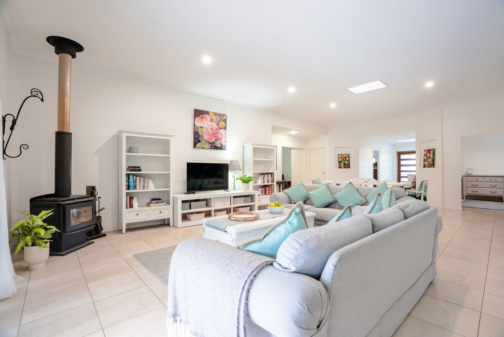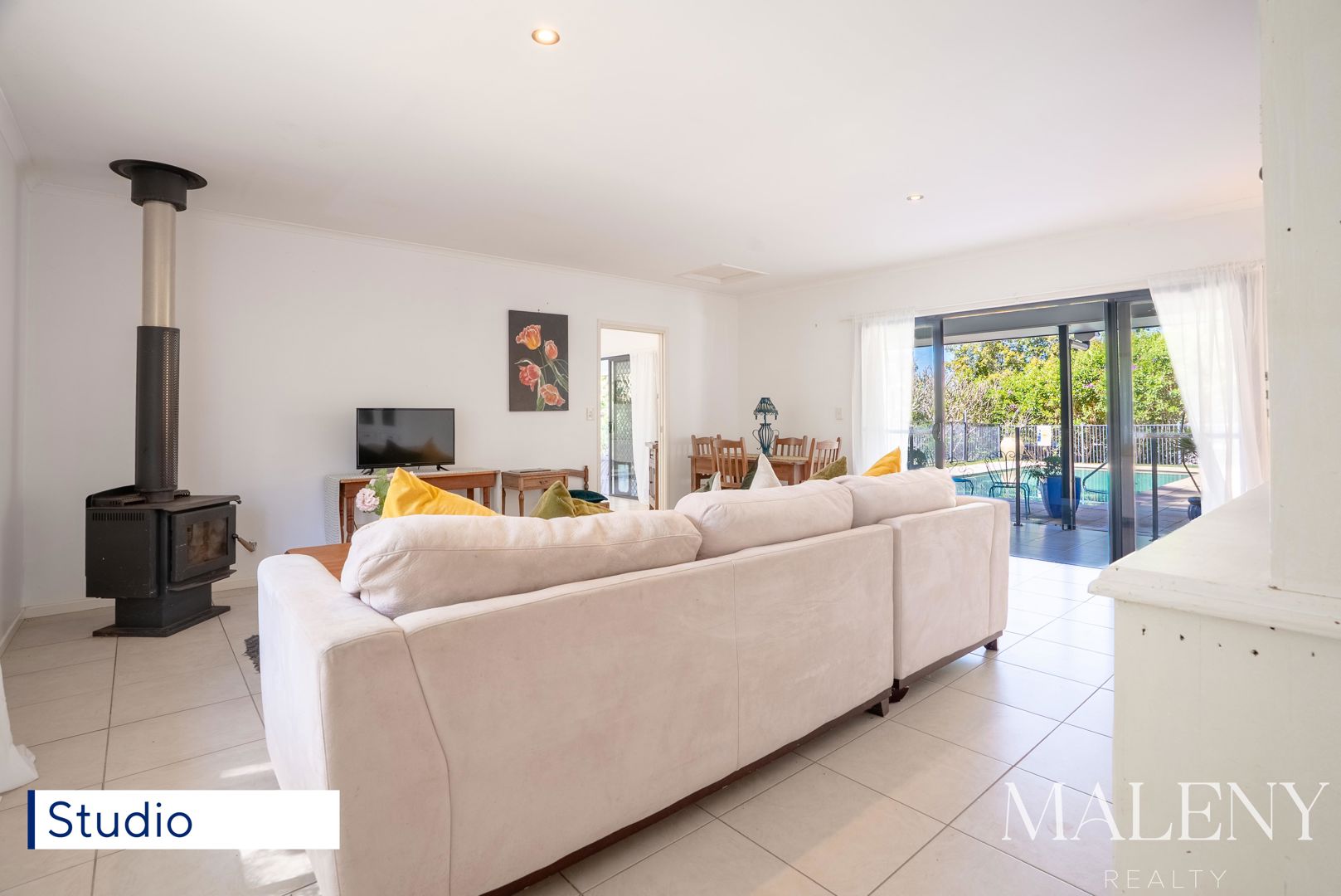 Across a single level, the main home comprises formal entry, four bedrooms, two bathrooms, three separate living areas, huge open plan living flowing to east facing covered terrace overlooking sundrenched saltwater pool, light-filled kitchen, separate laundry, and 6x6m studio/multipurpose space.