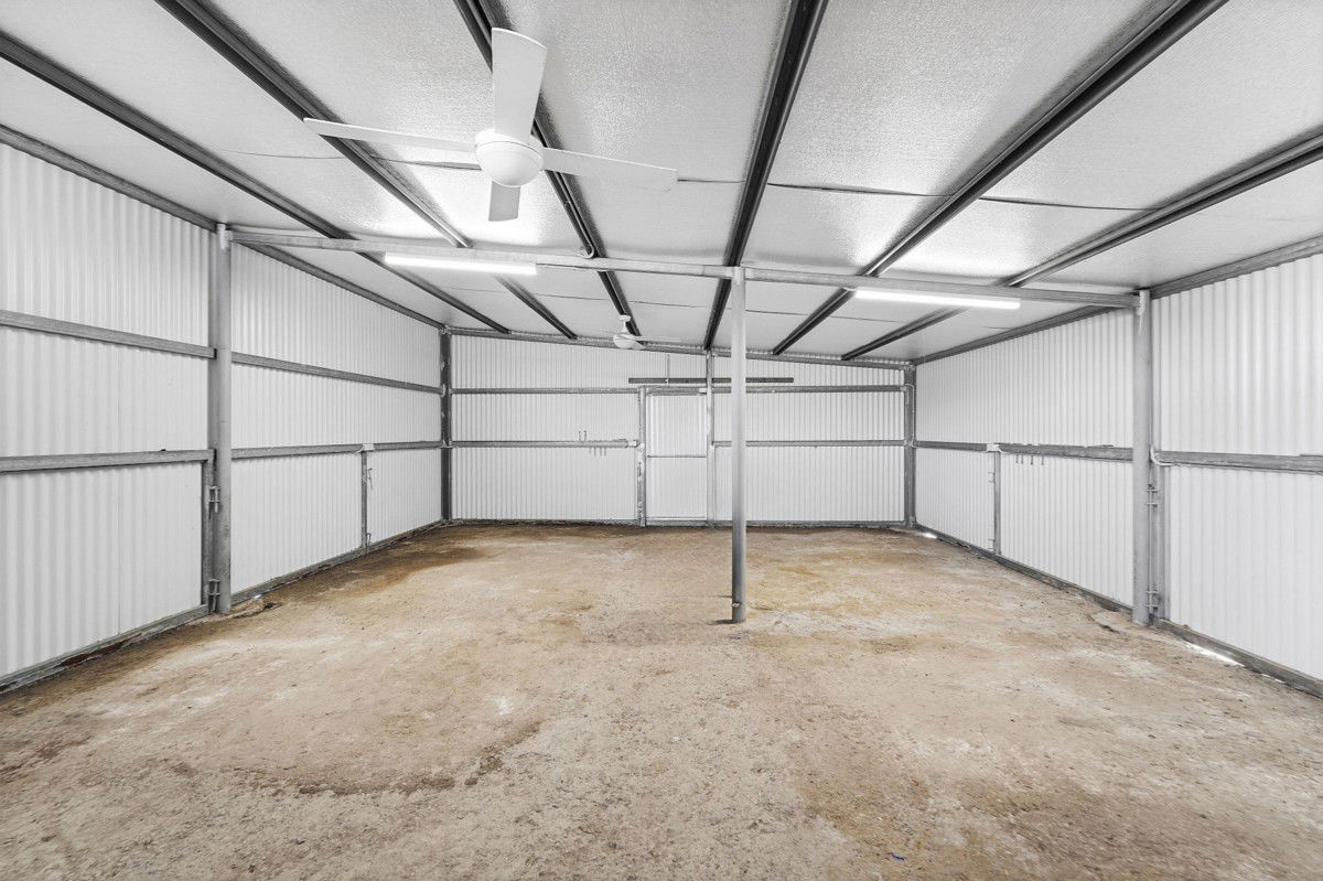 • Welded 4 Bay Steel Frame 16m x 7m wide Skillion Shed. Contains two 7m x 4m Open Carports; enclosed space (7 x 4m) with sliding metal doors currently set up with 8 x 3m x 1m gated livestock pens custom welded to frame, made to configure or completely remove if required. Electrical fittings and Plumbing with a Honda petrol firefighting pump and equipment set up to 22,500Ltr Poly Water tank that supplies water to the shed