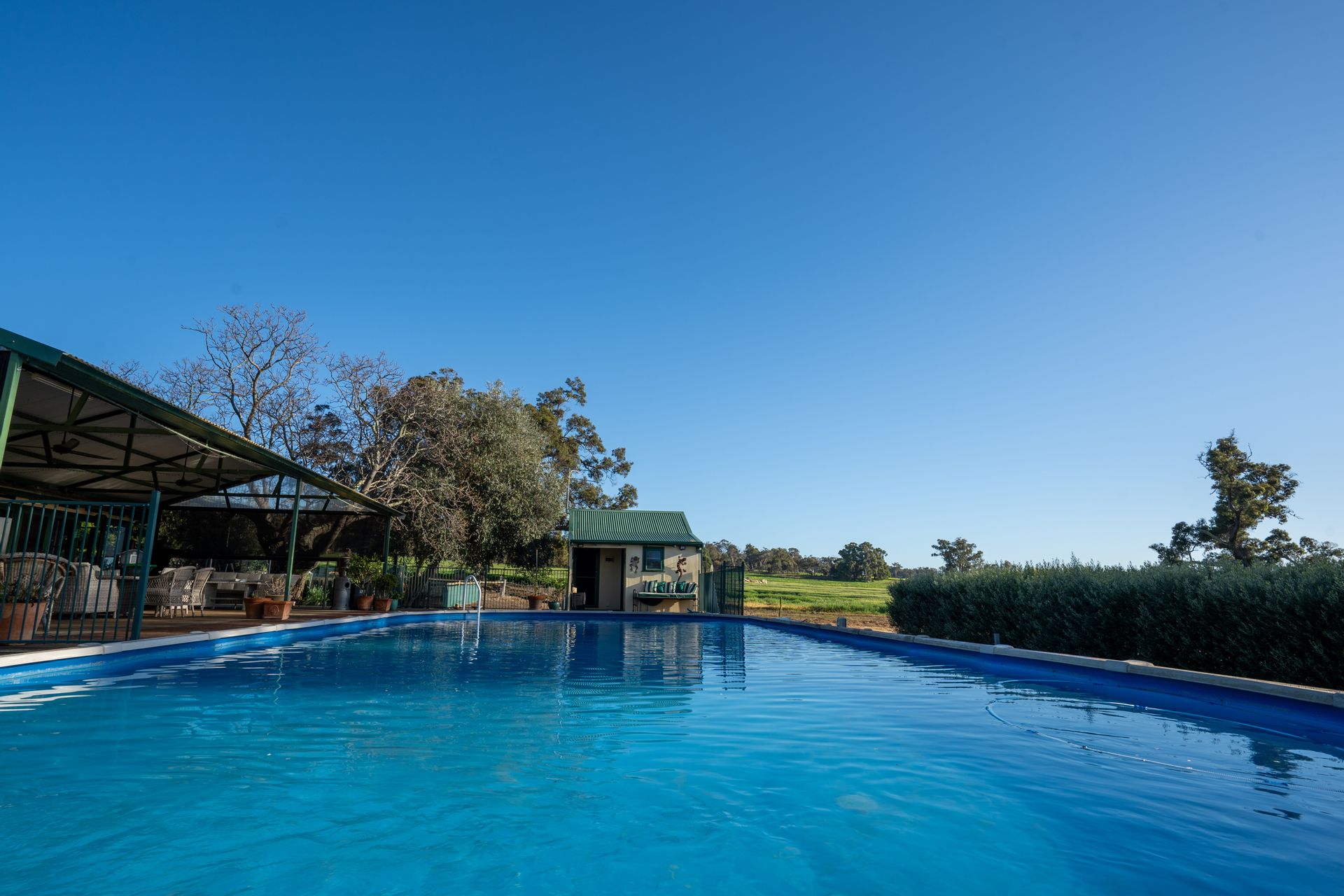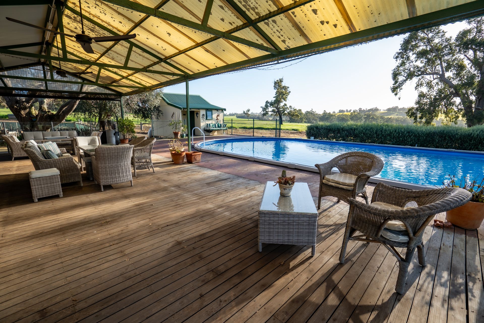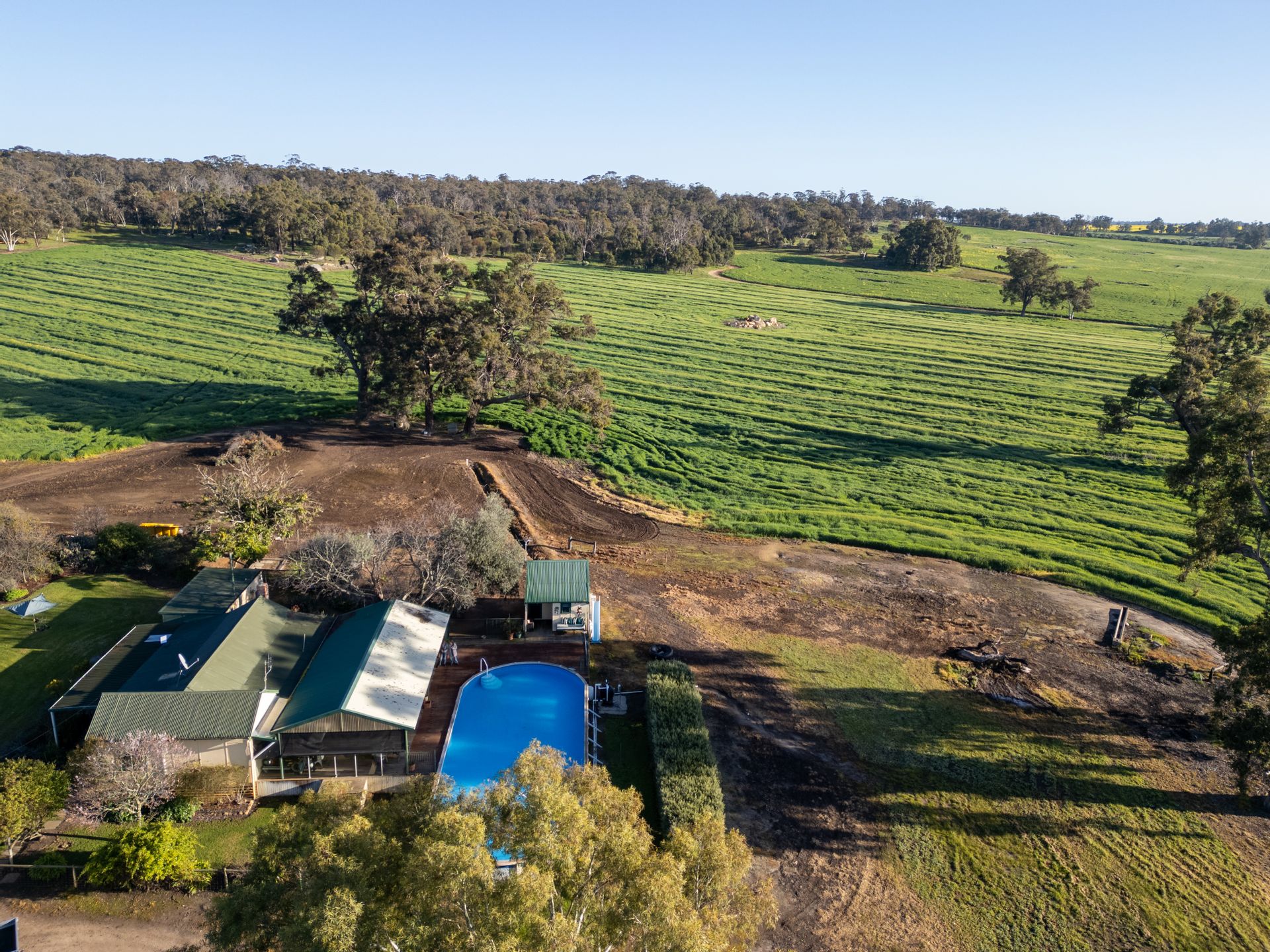 • Homesteads: A solid 1978 brick and tile 4 bed, 2 bath home with games room, dining, and patio, plus the original 1950s 3 bed, 1 bath character homestead with jarrah floorboards, expansive outdoor entertaining, a large pool, and separate guest cottage. Both homes are surrounded by extensive gardens and lawn areas with outlooks across the farm.