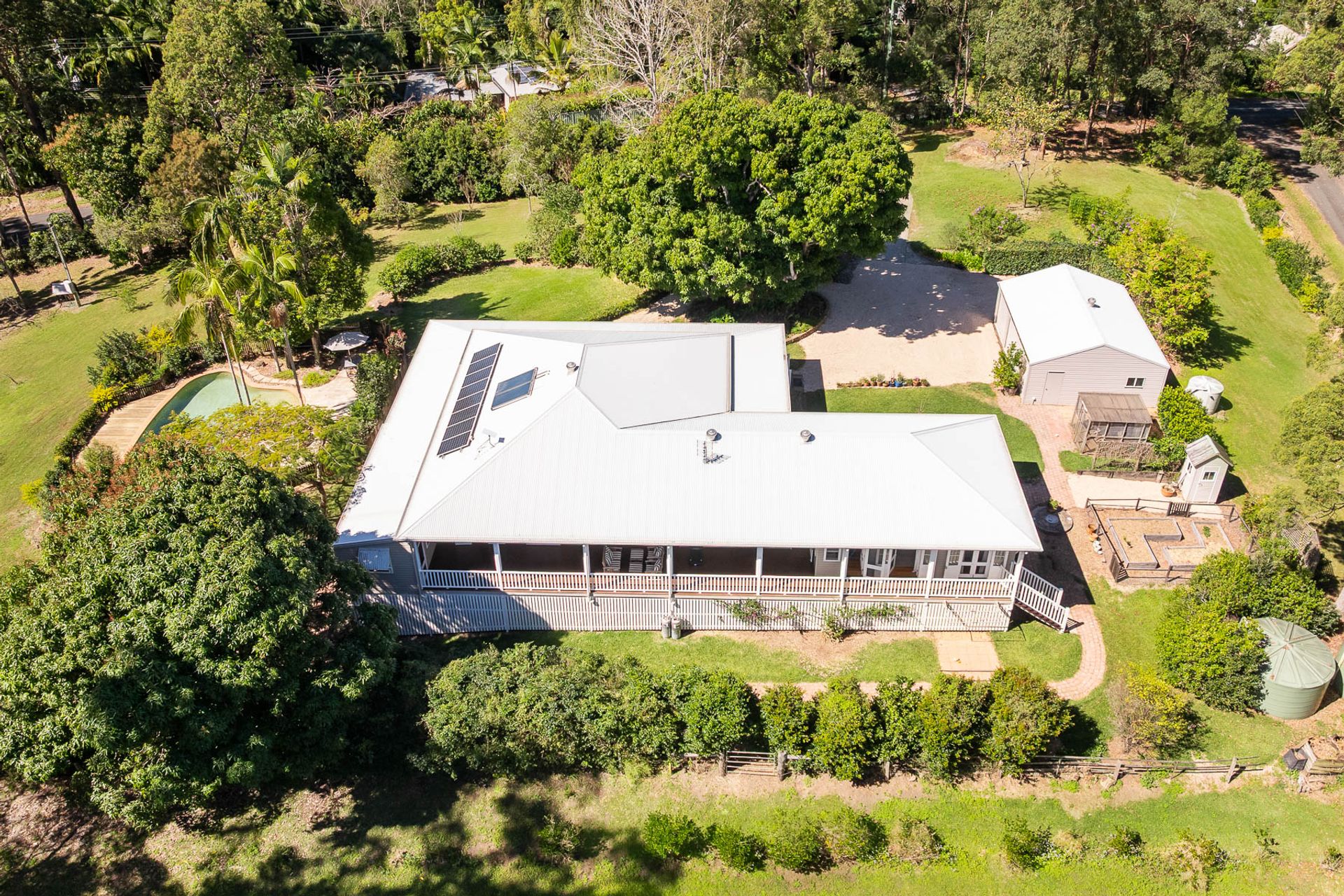 Set on 1.13ha (approx. 2.8 acres) of gently tapered land, this 2011 Benco Constructions home is a masterclass in blending lifestyle and practicality. From the classic weatherboard façade and wraparound verandahs to the landscaped grounds, pool, and iconic mango tree at the entrance, every detail invites you to slow down and savour hinterland life.