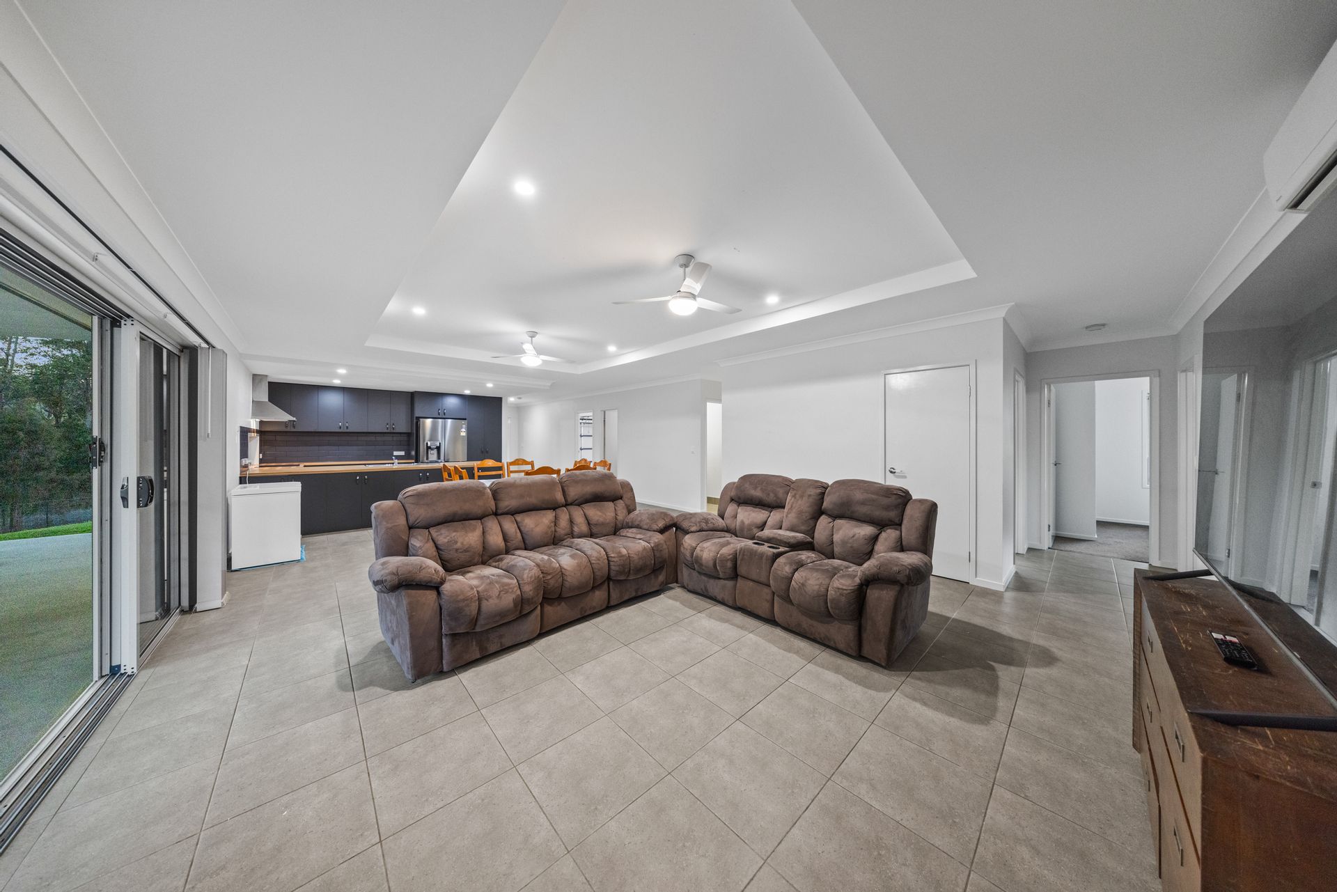 The solid, single-level home features four spacious bedrooms, all with air conditioning, ceiling fans, and built-in wardrobes. The layout includes two bathrooms, a large open-plan kitchen, dining, and lounge area with split-system air conditioning, and a built-in garage currently used as a fully air-conditioned multipurpose room. Tiled throughout, the home is both stylish and easy to maintain, with a large internal laundry completing the floorplan.