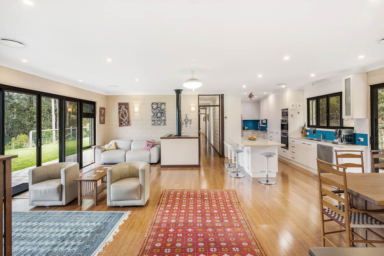 Step inside to light-filled living areas that open effortlessly toward the expansive verandah—perfect for entertaining or soaking in the peaceful rural outlook. The layout features generously proportioned living zones, four bedrooms (three with murphy beds), and a versatile double study and rumpus area. Elegantly appointed with bamboo flooring and an inviting fireplace, the interior strikes a balance between rustic warmth and contemporary convenience.