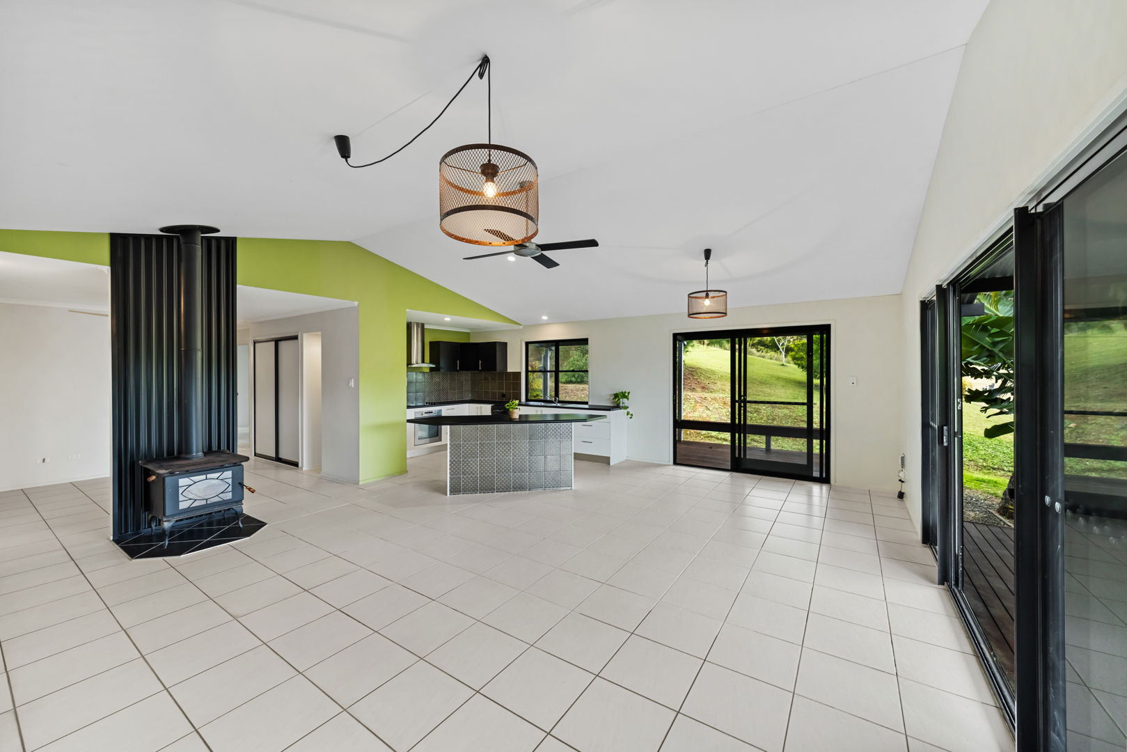 The main pavilion is designed for effortless living, featuring a large open-plan kitchen, dining and lounge area with soaring ceilings, tiled floors, a combustion fireplace and is air-conditioned. Welcoming verandahs to the north and east invite natural light, cooling breezes and seamless indoor-outdoor living, perfect for entertaining or quiet relaxation. Two bedrooms, a family lounge, laundry and bathroom complete this main pavilion.