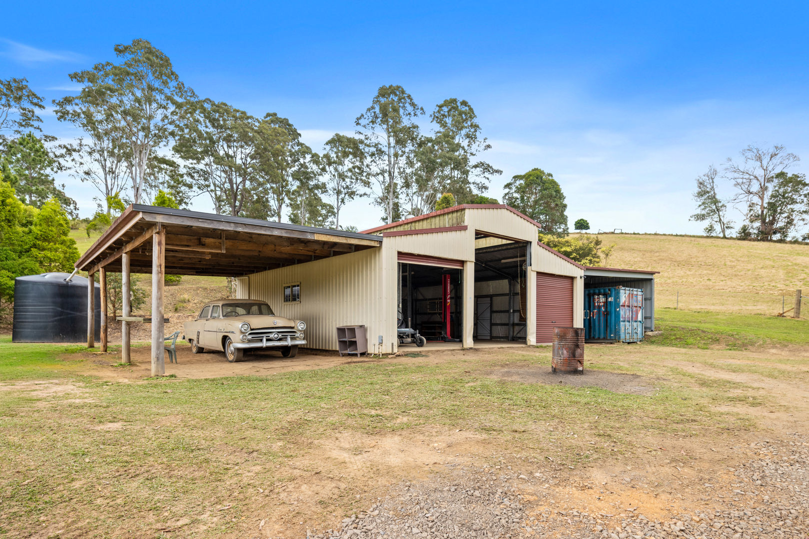 The property features a massive 3-phase powered 10m x 10m shed with two 7m x 10m wings, complete with three high-clearance roller doors (two at 2.6m and one at 3.6m), plus a shower and toilet, perfect for trucks, caravans, motorhomes, or a serious workshop. Complementing this is abundant water storage with two 8,000-gallon tanks (plus additional tanks), a brand-new Taylex septic system and securely fenced paddocks with two dams. Add in a rustic stockyard and you have a property that blends practicality with natural beauty.