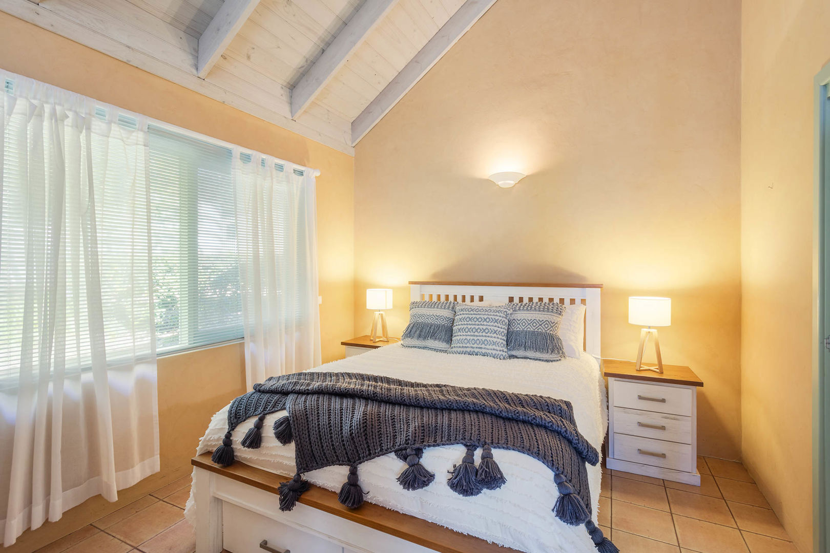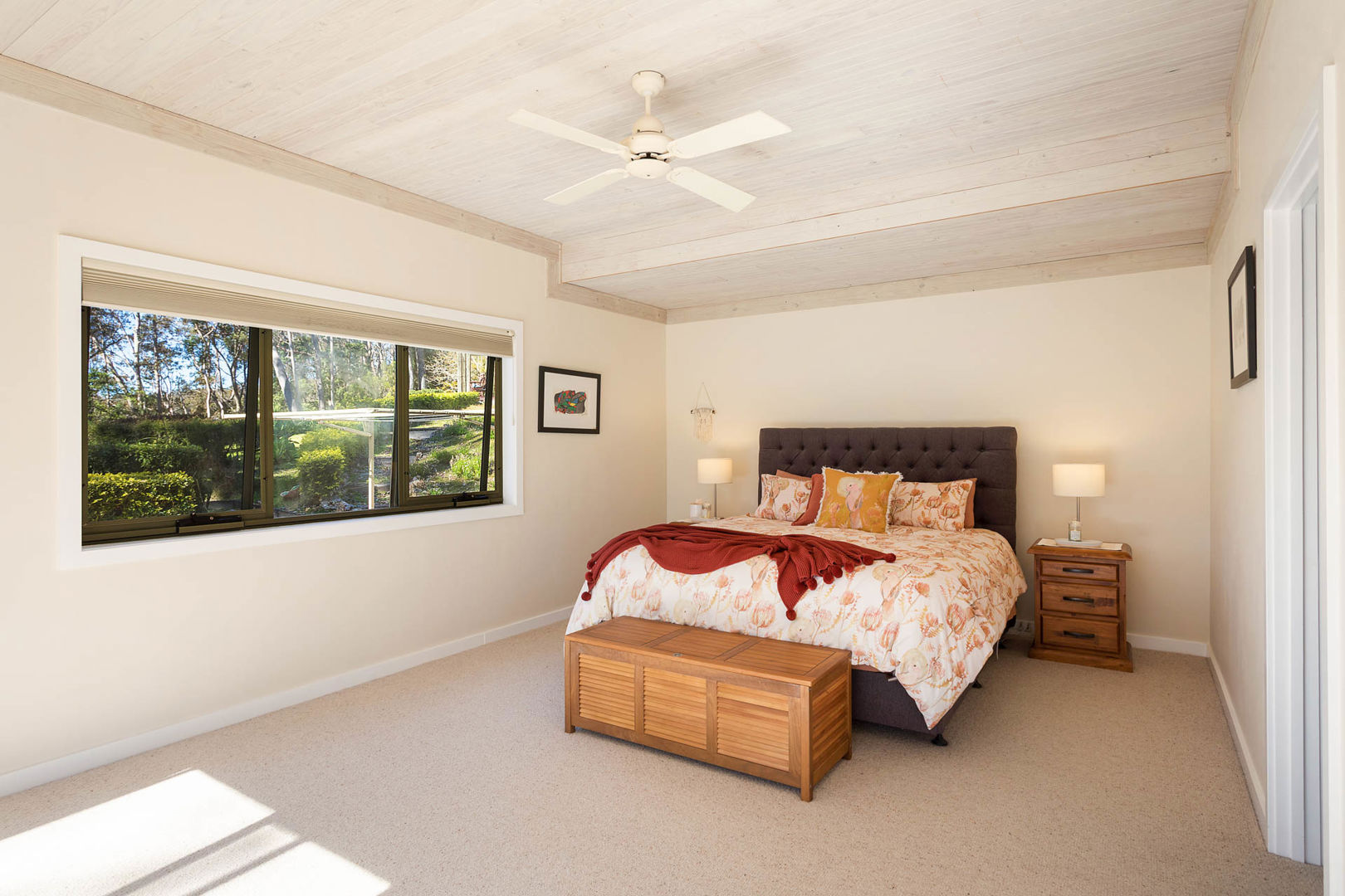 The main residence and separate cottage are thoughtfully crafted, both echoing a timeless style with tiled floors, lime-washed timber ceilings, and expansive windows that bring the outside in. The main house offers a suite of comfort and convenience features designed for modern living, including Luxaflex Duette Ultraglide blinds throughout, multiple heating options with flued gas and a large Jotul wood fireplace, ceiling fans, a Rinnai infinity water system, and carefully considered built-in storage. Each room combines style with practicality: from the master suite with walk-in robe and ensuite, to the spacious living and dining areas with tiled fireplaces and wall-to-wall shelving, and a well-appointed kitchen with stainless steel & stone benchtops, premium appliances, and ample storage.