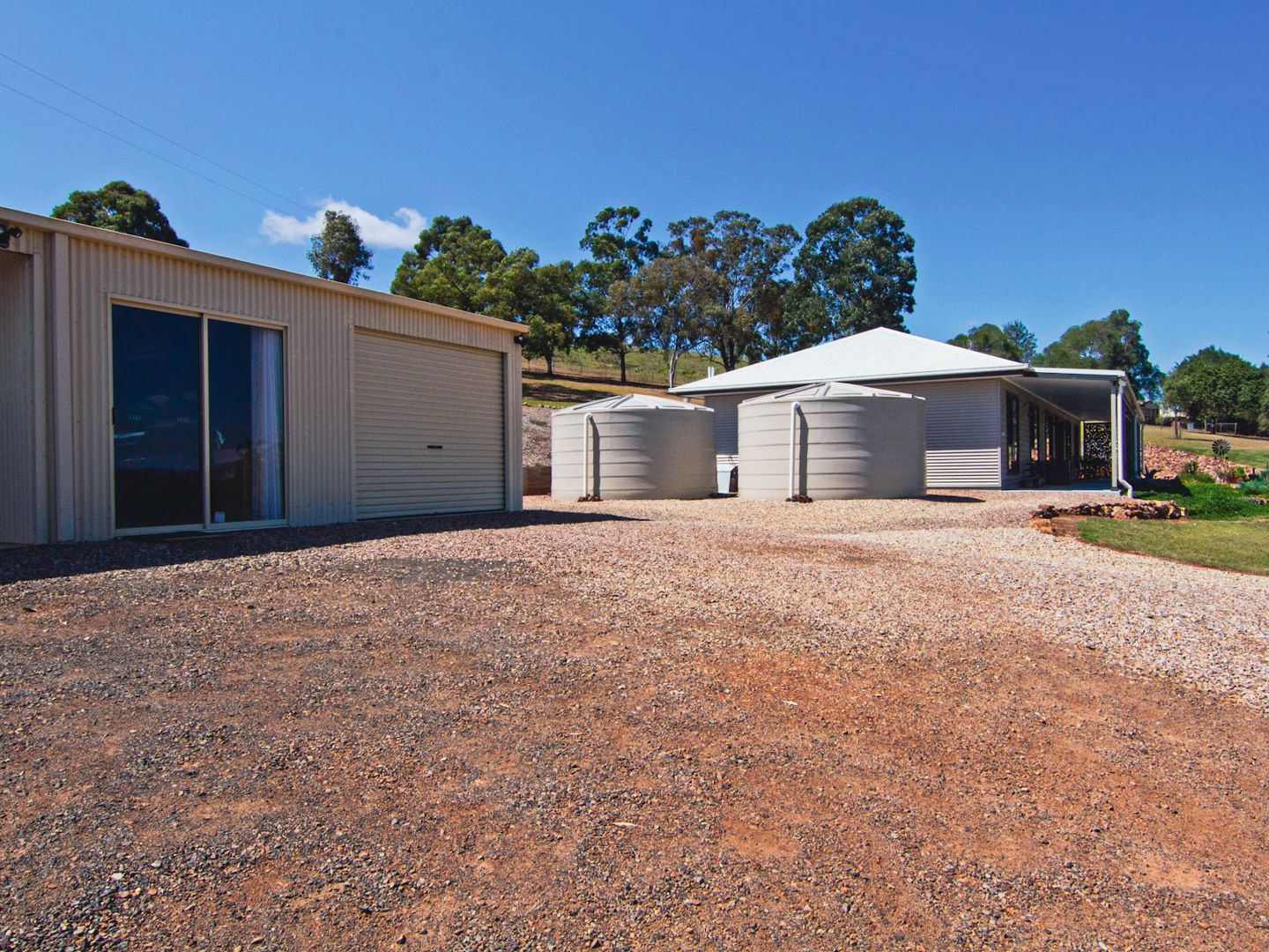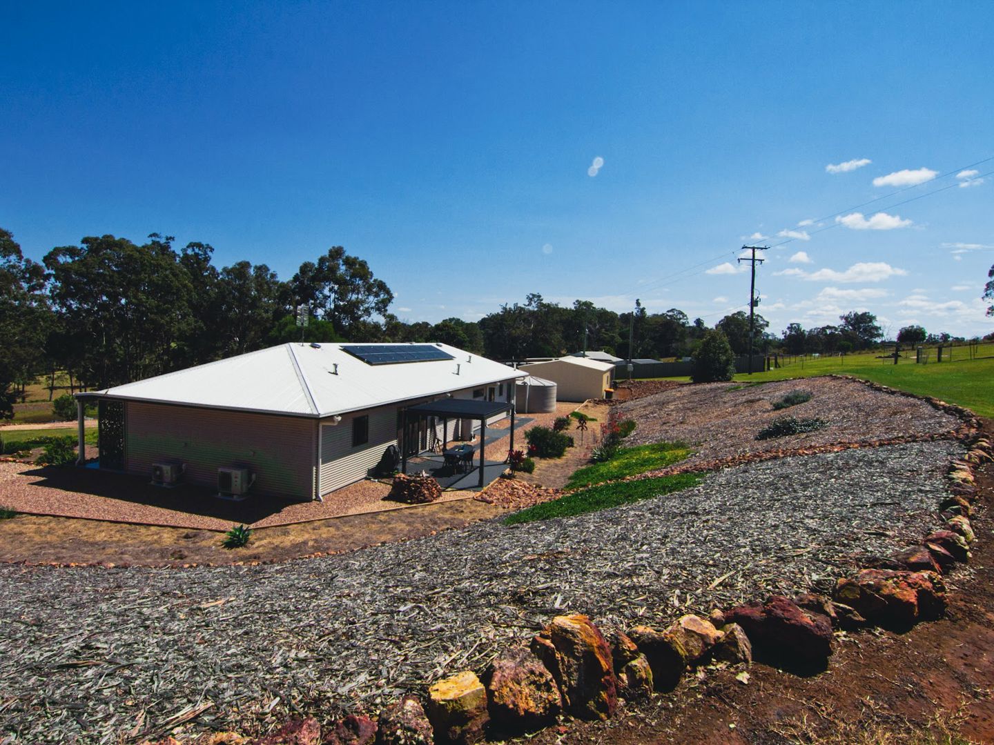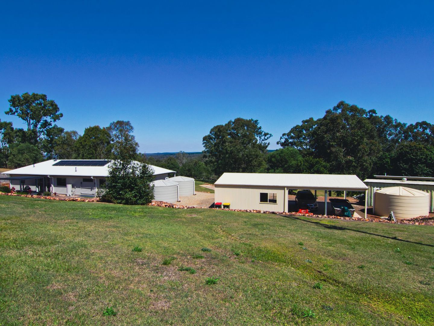 Alongside multiple rainwater tanks, there’s a dam which can feed a concrete header tank on the hill, giving excellent gravity-fed water security. A modern wastewater treatment system is also in place. Plenty of established plants are in place including macadamias and passionfruit.