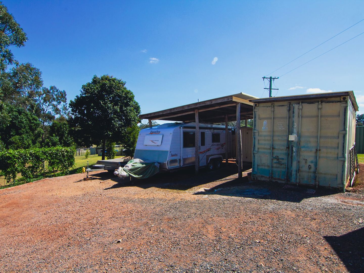 Powered double garage with workbenches, caravan awning, potting shed, shipping container (wired ready for power)