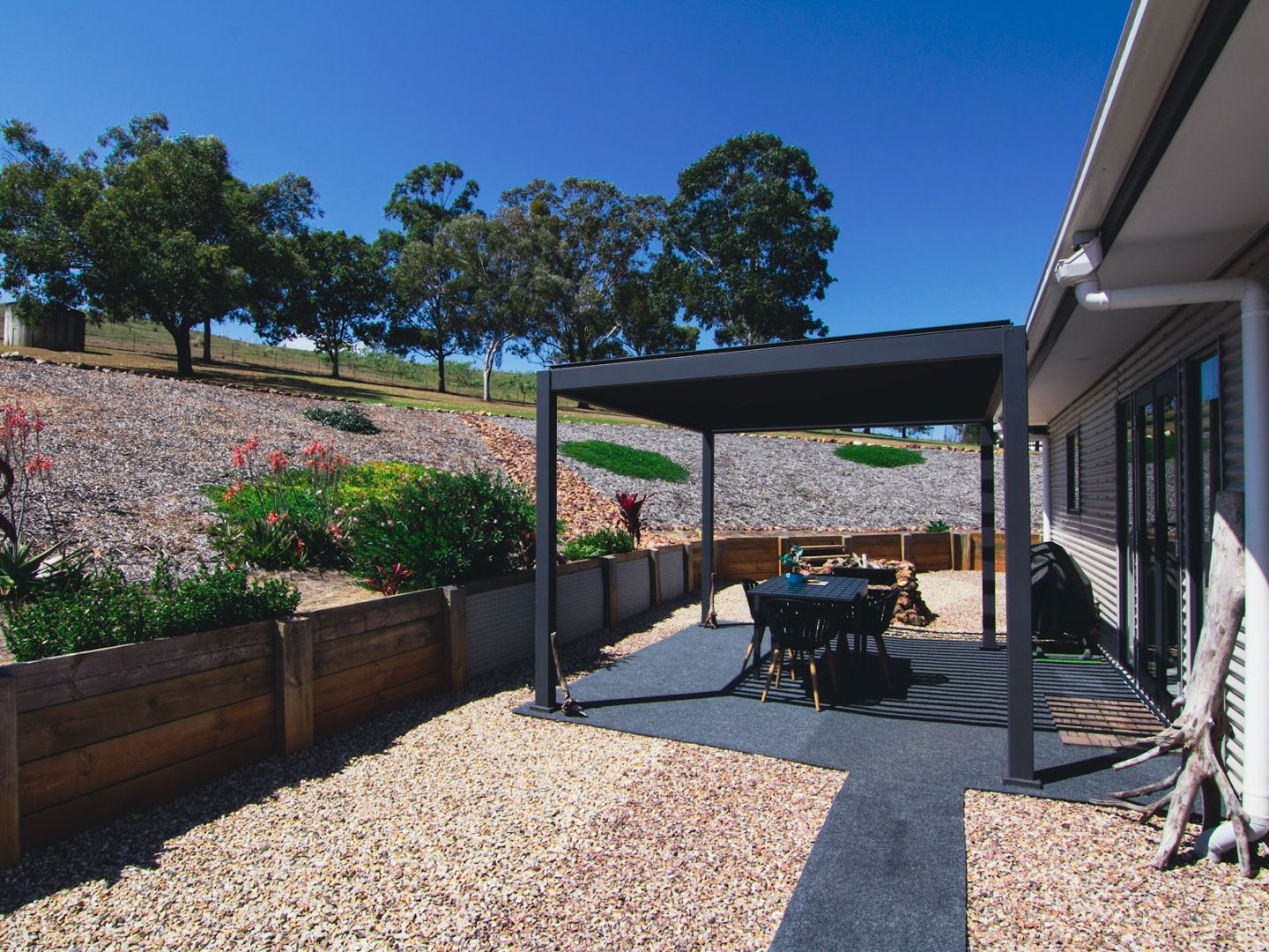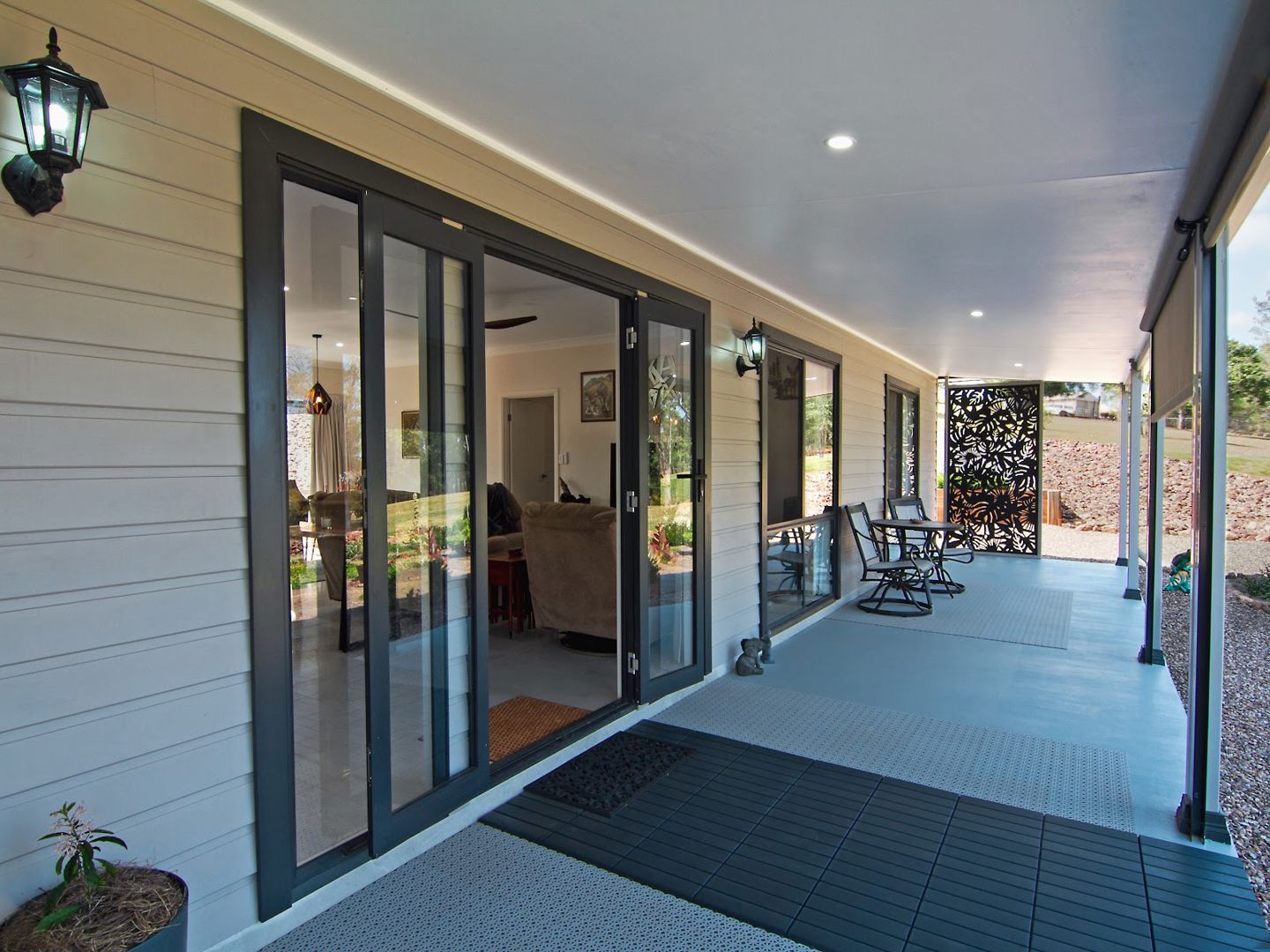 Wide covered verandah at front, with custom wind and rain proof screens + pergola at back with open/close shutters