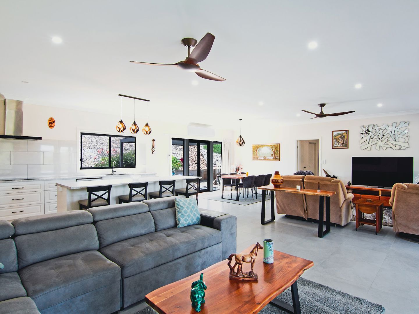 Inside, the home feels light, fresh and thoughtfully designed. The kitchen is a showpiece with soft-close 900mm drawers, LG dishwasher with a 10-year warranty, a premium digital multifunction oven, plus a huge walk-in pantry and coffee bar, The open plan living area is kept comfortable year-round with full insulation and a large split system air conditioner, while remote-controlled ceiling fans and clever lighting features run throughout.