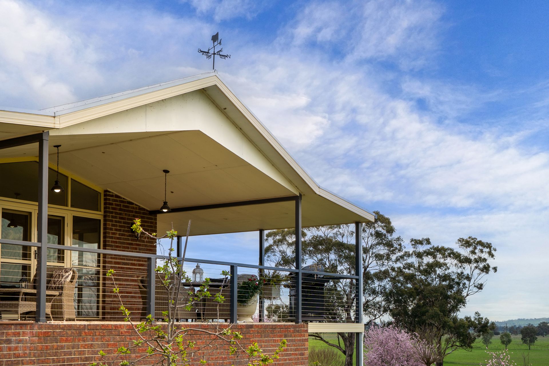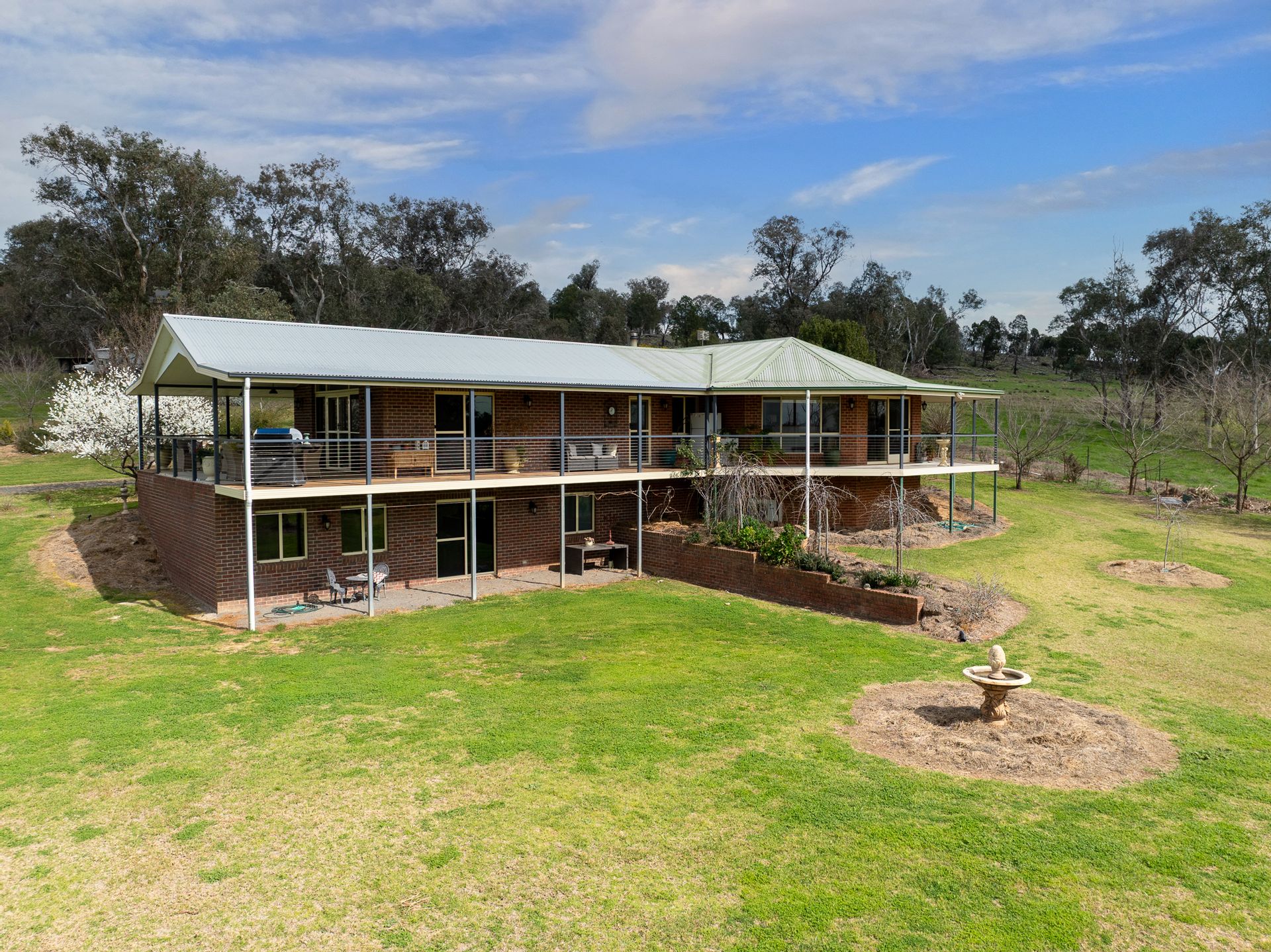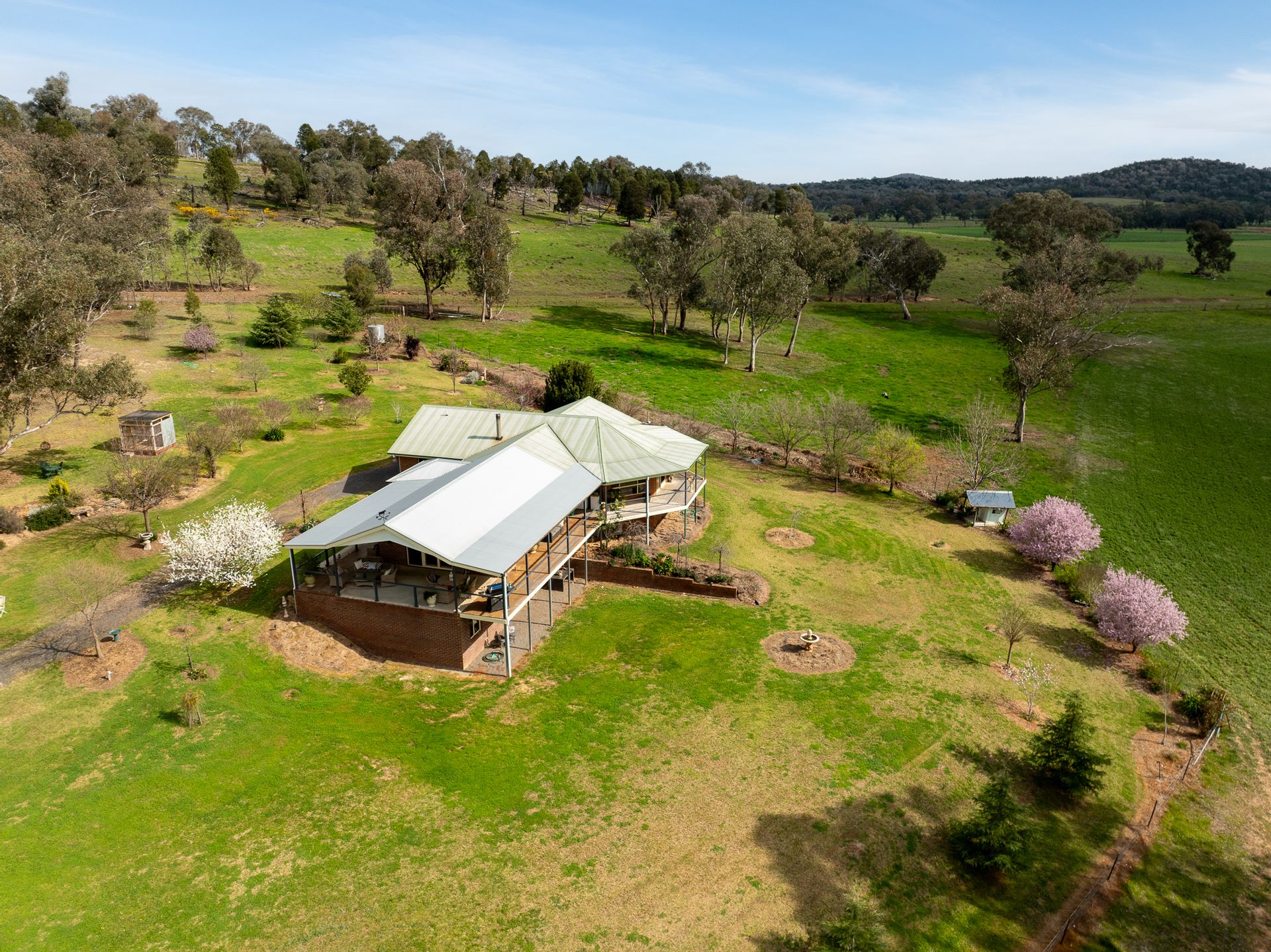 • Set privately among the trees and designed for modern family life, the residence offers expansive living over two levels. Cathedral ceilings, a spacious open-plan layout, and country-style verandahs create a welcoming retreat with panoramic views over the land. Downstairs includes a large rumpus or guest suite, perfect for extended family or entertaining.