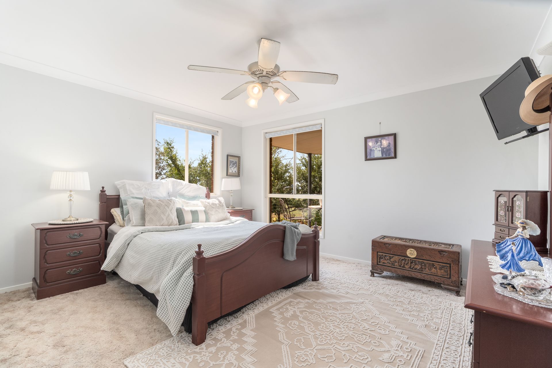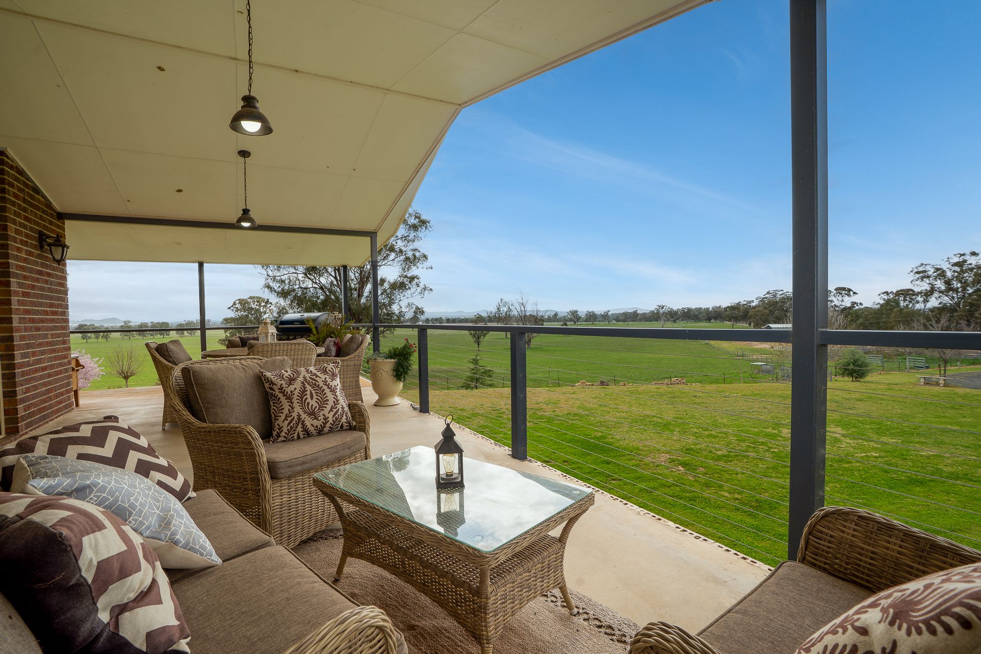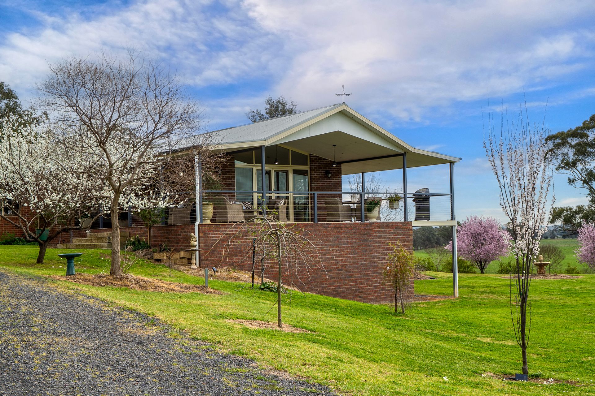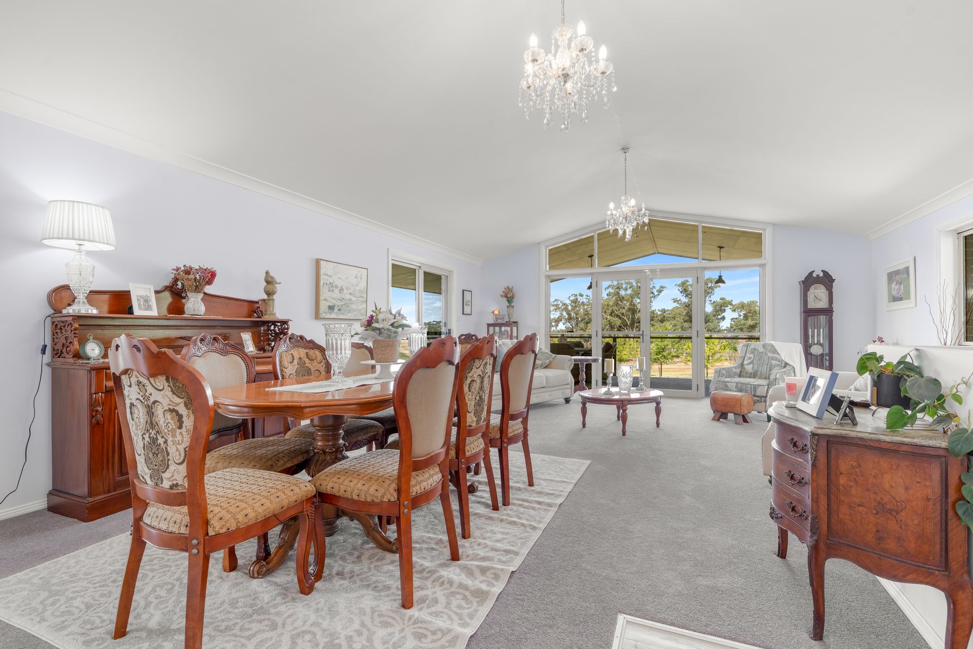 • Set privately among the trees and designed for modern family life, the residence offers expansive living over two levels. Cathedral ceilings, a spacious open-plan layout, and country-style verandahs create a welcoming retreat with panoramic views over the land. Downstairs includes a large rumpus or guest suite, perfect for extended family or entertaining.