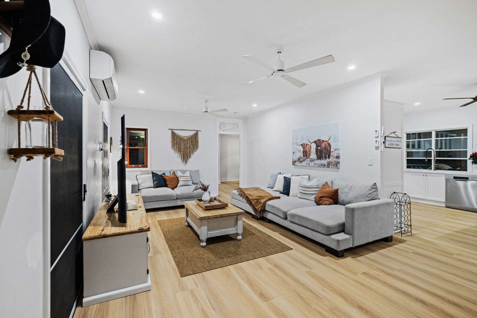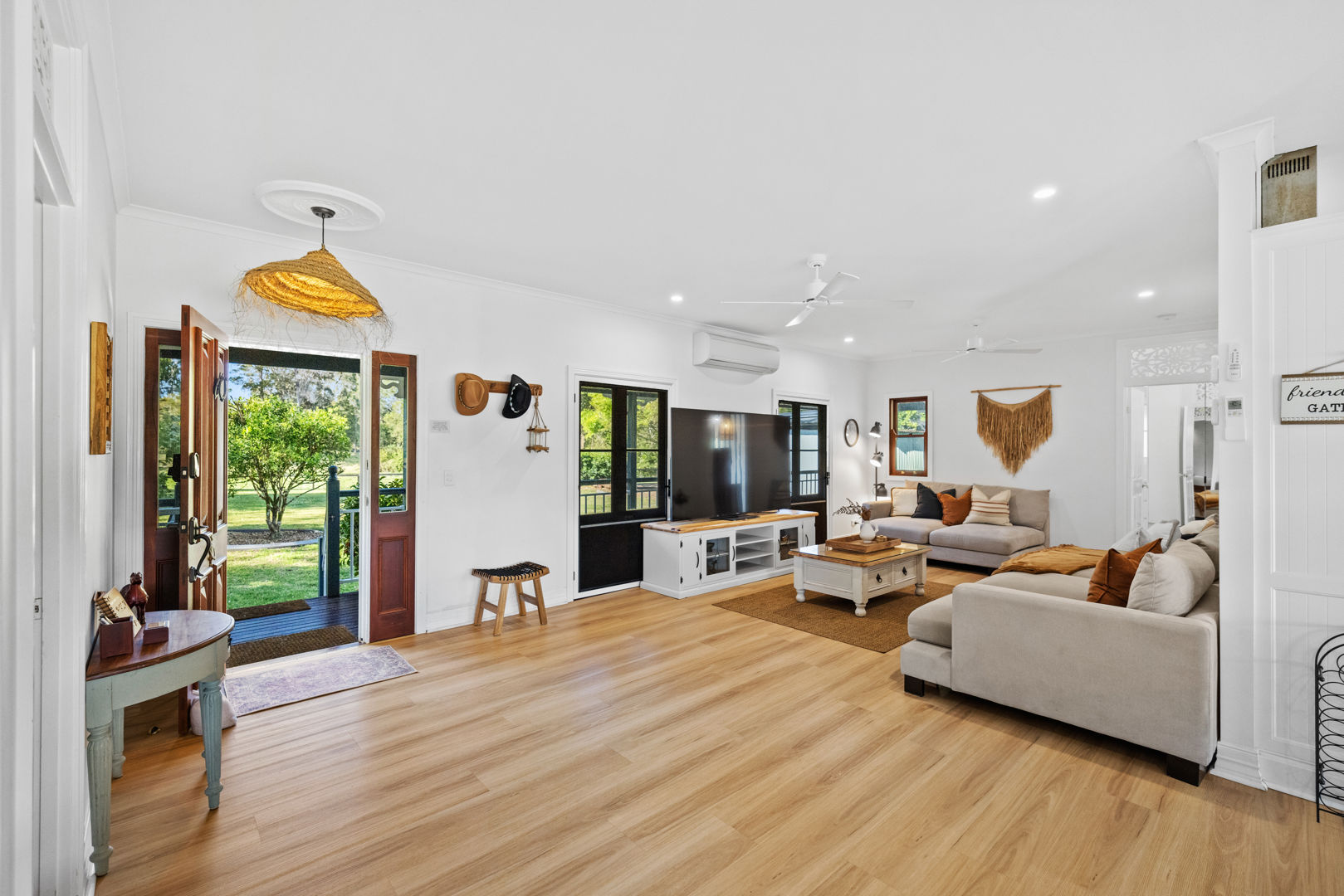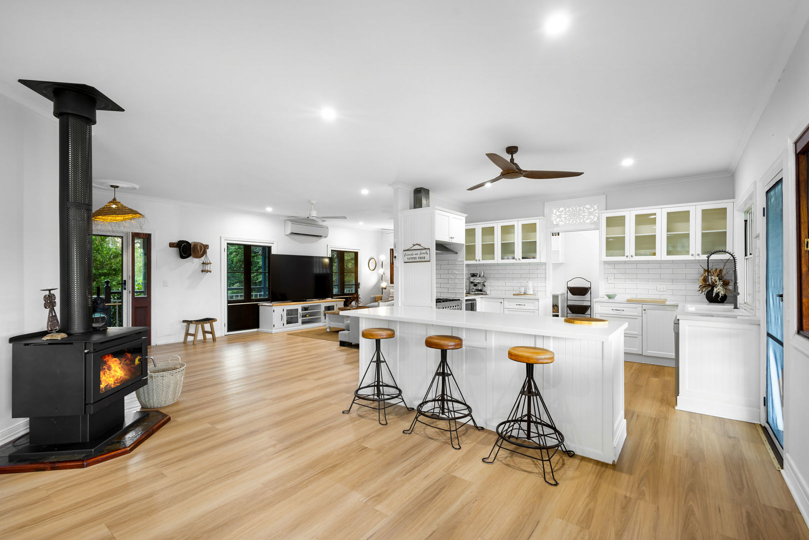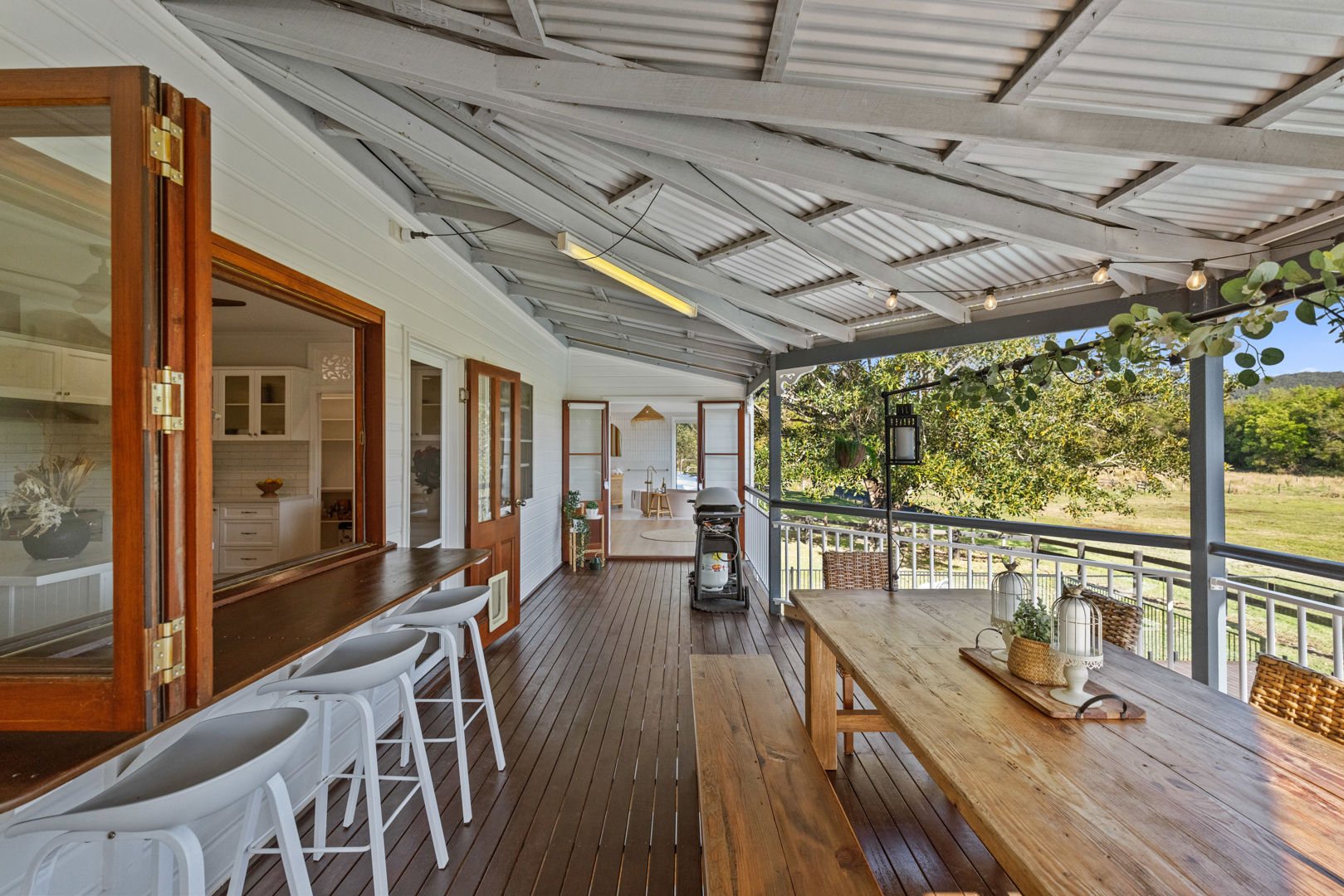 At the heart of the property sits a beautifully restored Garth Chapman Queenslander, perfectly elevated to take in the wide green sweep of the paddocks below. Crafted with character and warmth, the home blends traditional charm with modern comfort. It features three bathrooms, wraparound verandahs, polished timber floors, reverse cycle air conditioning and a central fireplace.