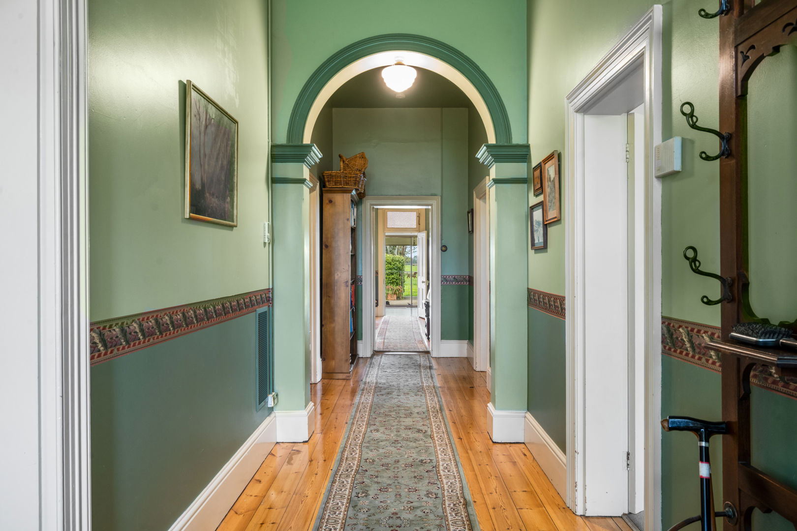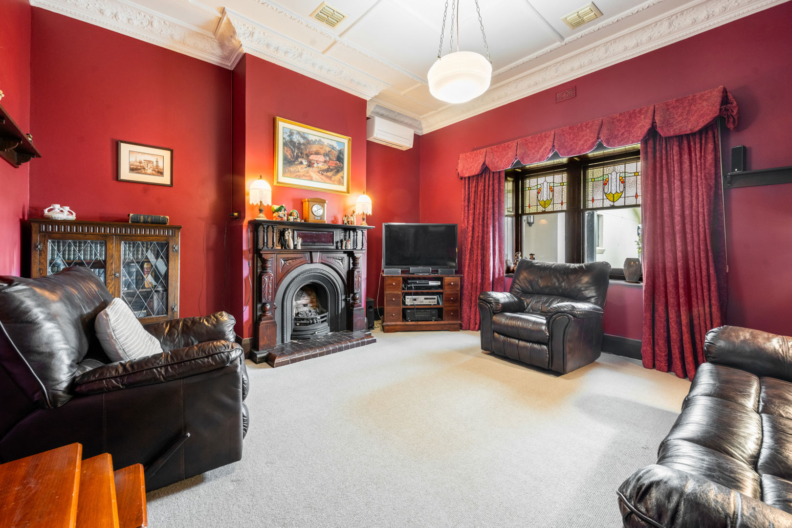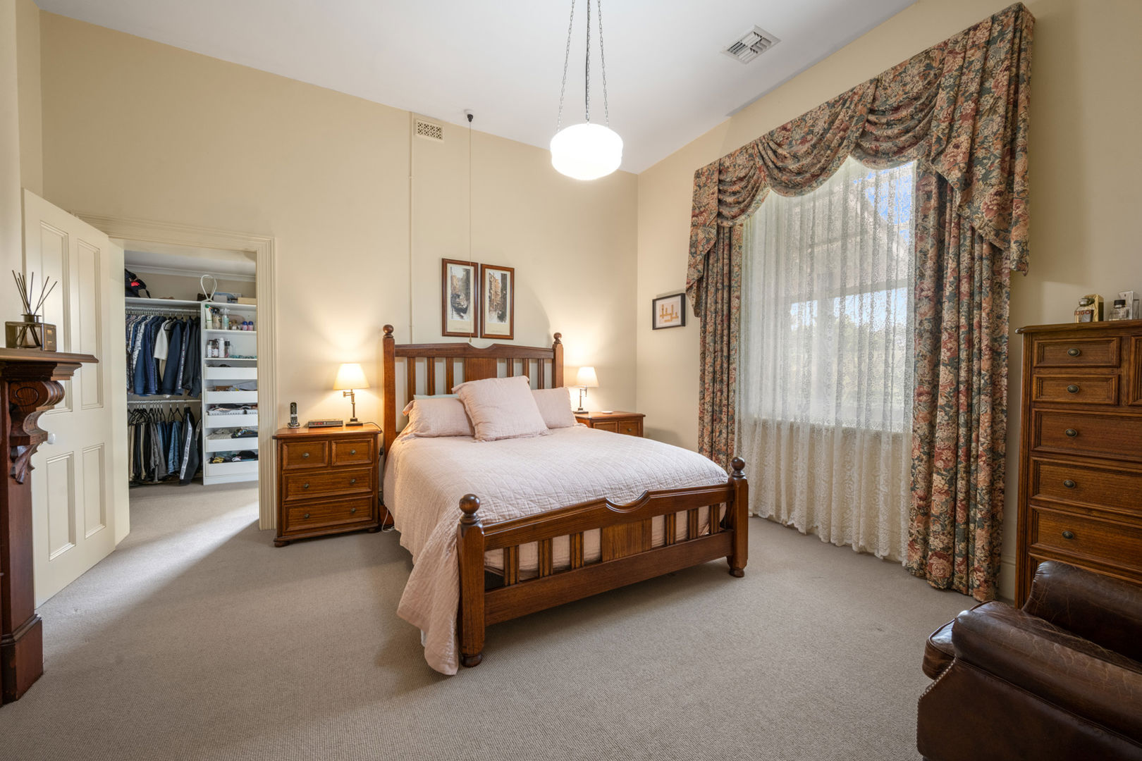 Set privately back from the road, the 1890s Mount Gambier stone homestead has been carefully renovated to blend period charm with modern comfort. The home features four bedrooms, two bathrooms, and multiple living areas centred around a wide central hallway with decorative archway. Each bedroom includes an ornate fireplace and mantel, with built-in cupboards to three rooms, the master suite offers a walk-in robe and ensuite with underfloor heating, heated towel rail, and walk-in shower.