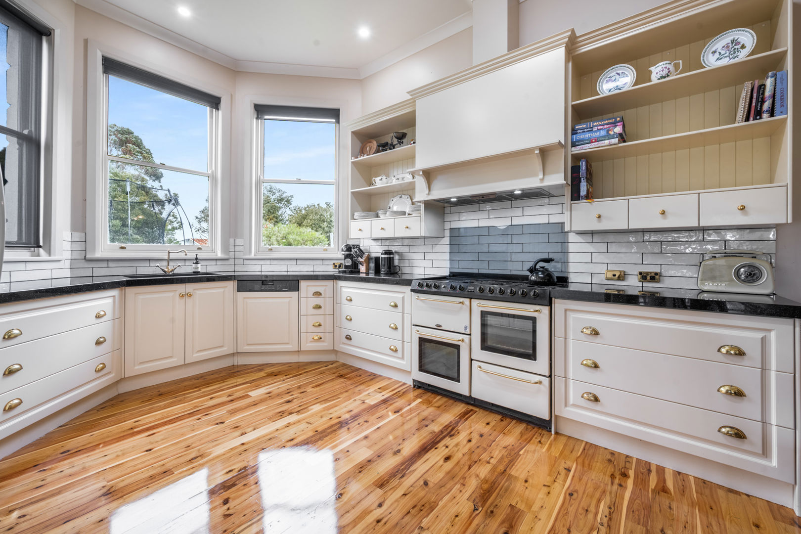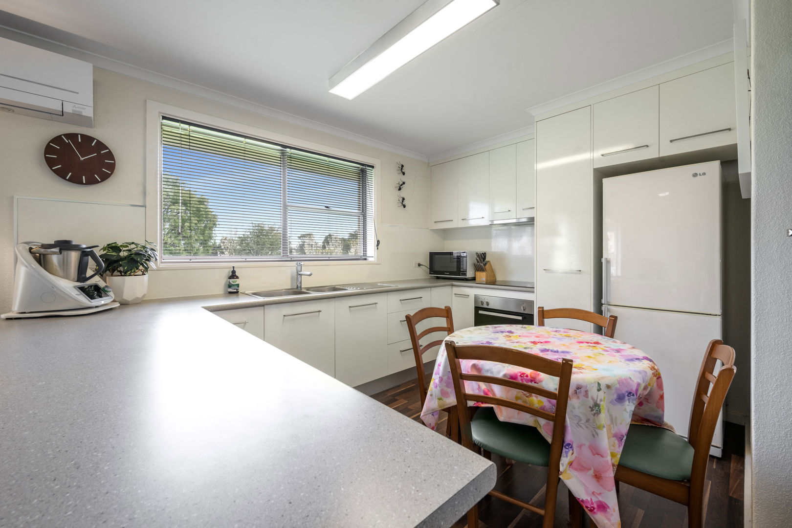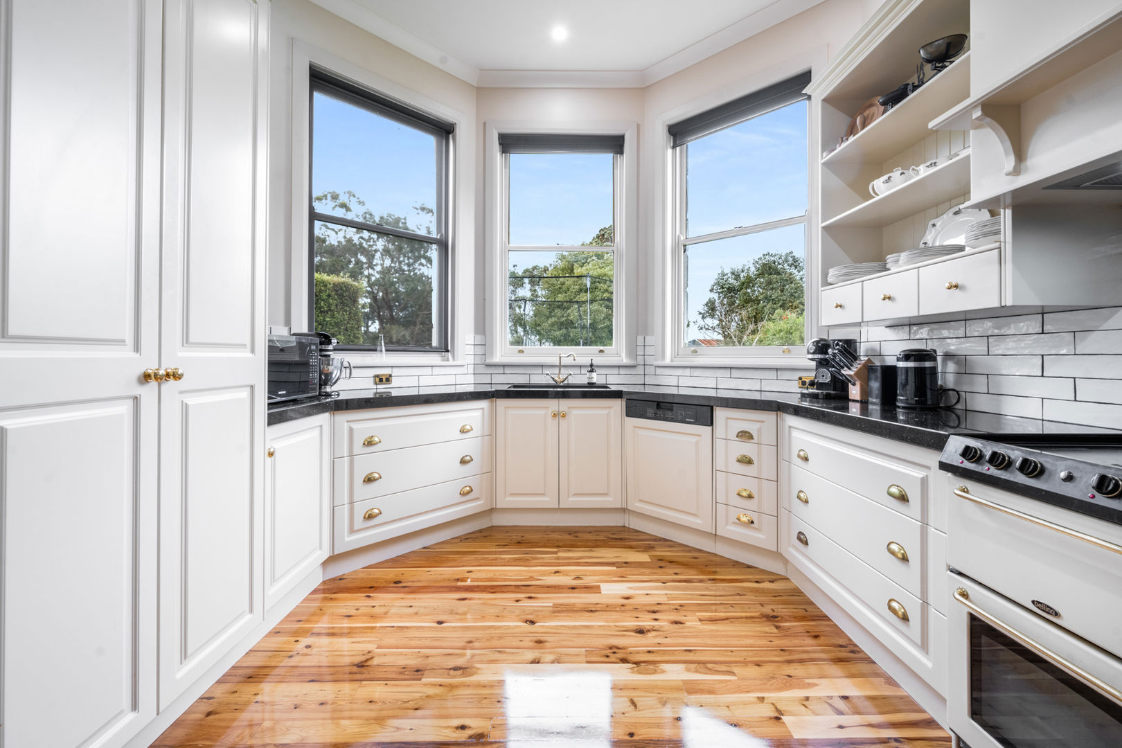 Generous living spaces include a formal lounge with bay window, coloured leadlight, and LPG coal fire, alongside a large dining room connecting to the 2021 upgraded kitchen. The kitchen boasts granite benchtops, Belling cooking range with six gas burners and multiple ovens, Miele dishwasher, Schweigen rangehood, and French doors opening to a timber deck ideal for entertaining. Polished cedar floors flow through the kitchen and dining areas, resanded and sealed in 2025. A renovated bathroom, spacious laundry with second toilet, and enclosed rear verandah provide practicality for family living. Modern comforts include reverse cycle air conditioning, LPG ducted heating, solar hot water, and a 40-panel solar array.