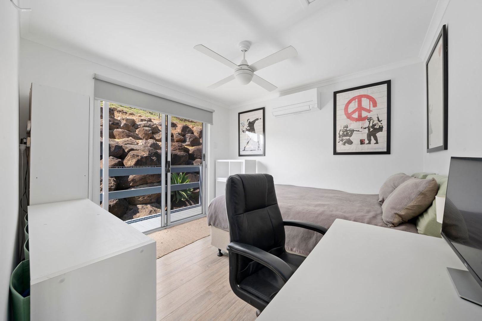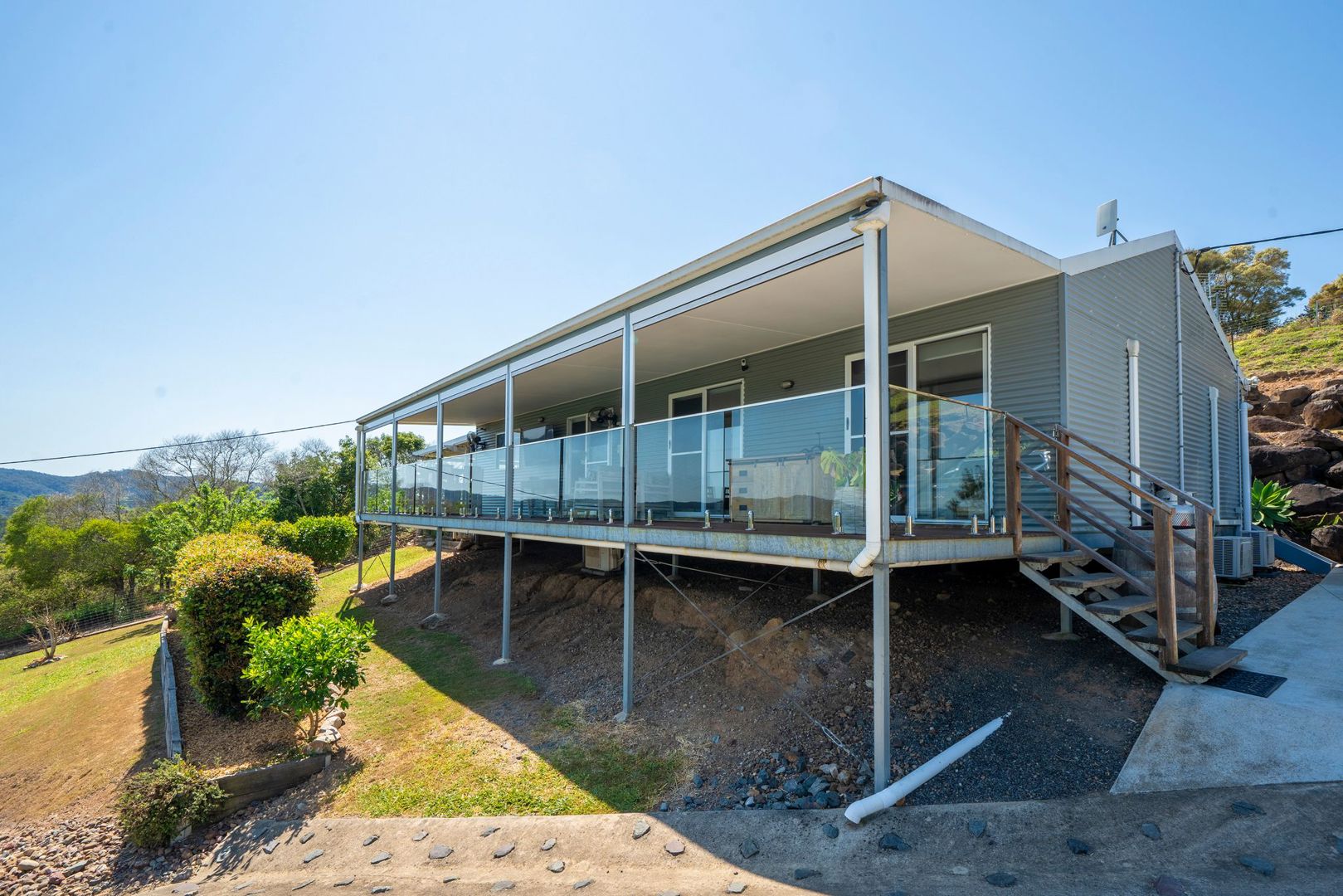 The upper home features four bedrooms, a family bathroom, a neat kitchen with gas cooking, and open-plan living that spills onto a sprawling covered deck with weather screens and incredible views. A double shed, concrete driveway and solar powered private gated entry complete the picture, giving this home independence and privacy from the lower residence.