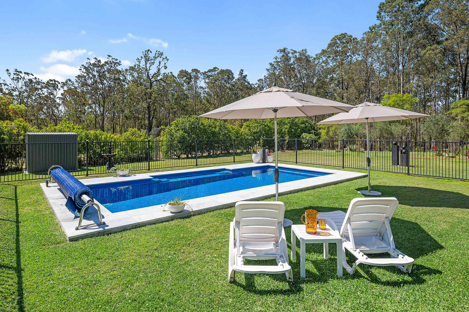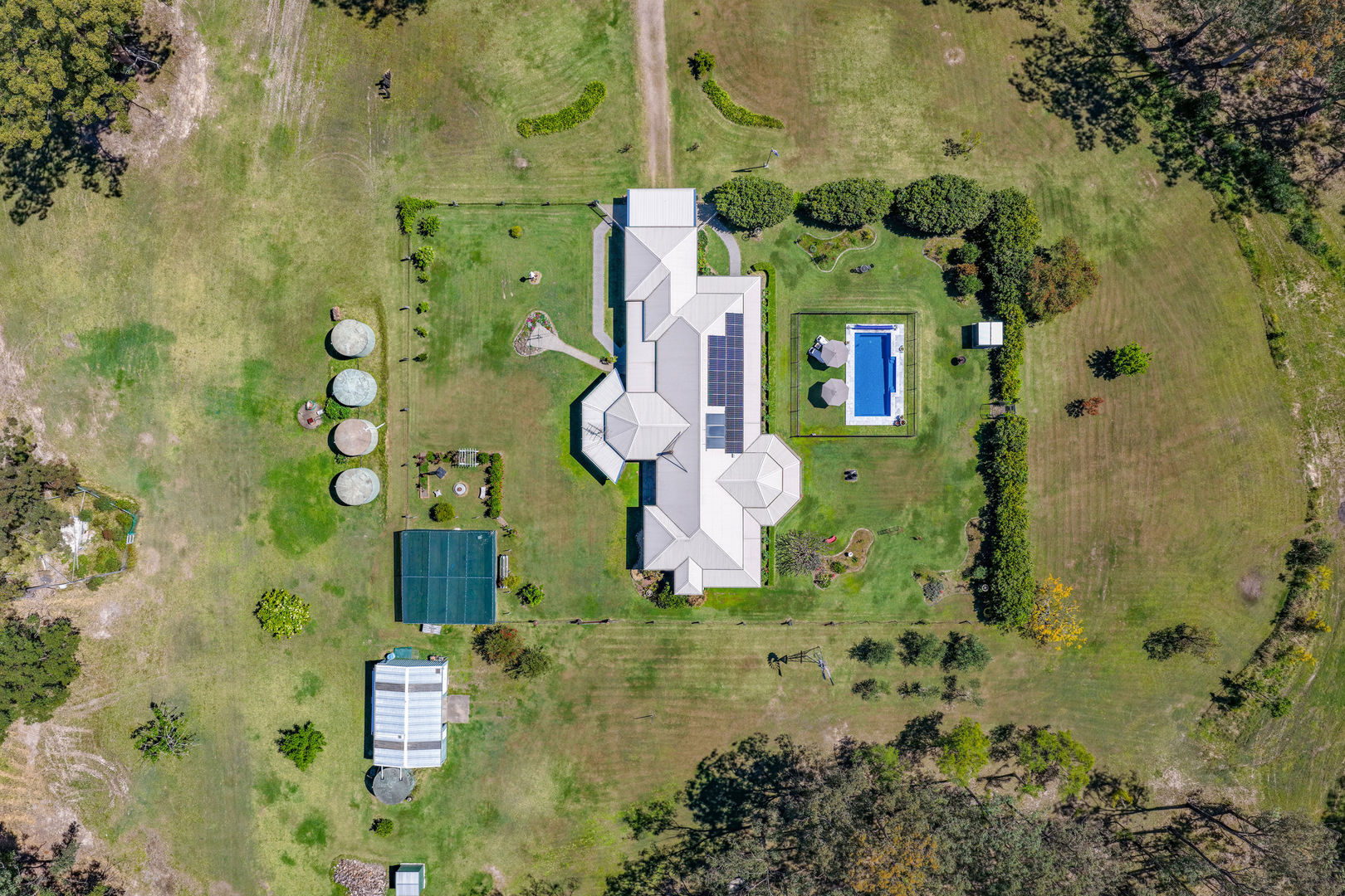 Wraparound verandahs and sunlit patios frame manicured grounds that flow to a sparkling self-cleaning pool, a perfect spot to unwind and take in the rural views. Beyond the house, two fenced paddocks, two dams, and five 20,000L tanks offer endless potential, whether you dream of keeping horses, setting up kennels, or creating your own productive garden.