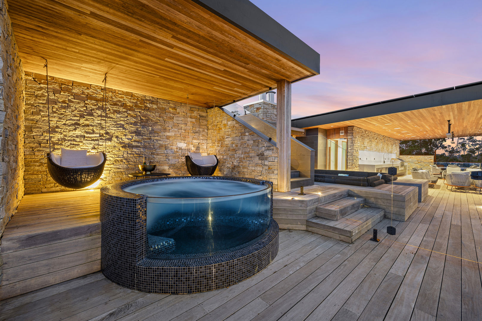 There's a sunken openair lounge, dining terrace and full kitchen with wine fridges, Miele oven and BBQ. A handcrafted stone fireplace is a cosy focal anchoring piece. R&R is guaranteed with a curved glass spa, rainhead shower, idyllic hanging chairs and, the pièce de résistance, a state of the art therapeutic steam room.