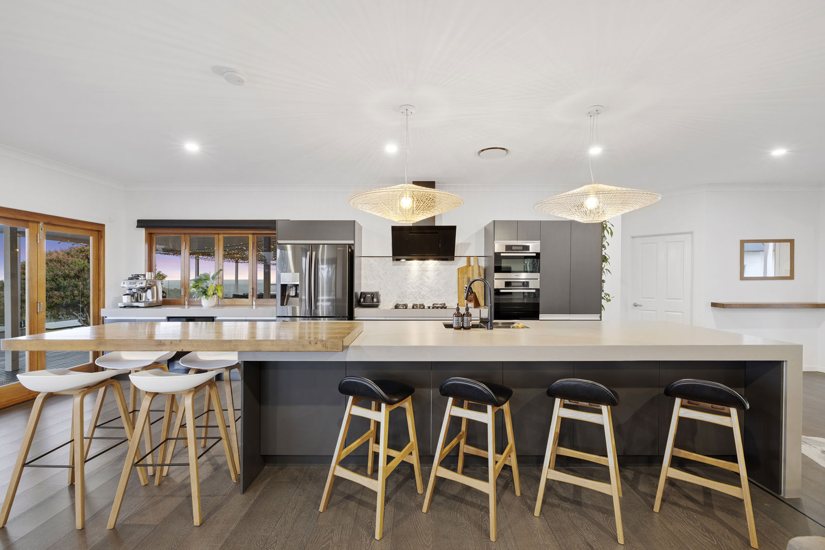 The expansive decks envelop the residence and have mesmerising views, integrated kitchen and festoon lighting - perfect for long lazy lunches, twilight cocktails, basking in nature and the cascading waterfalls of the infinity-edge pool.