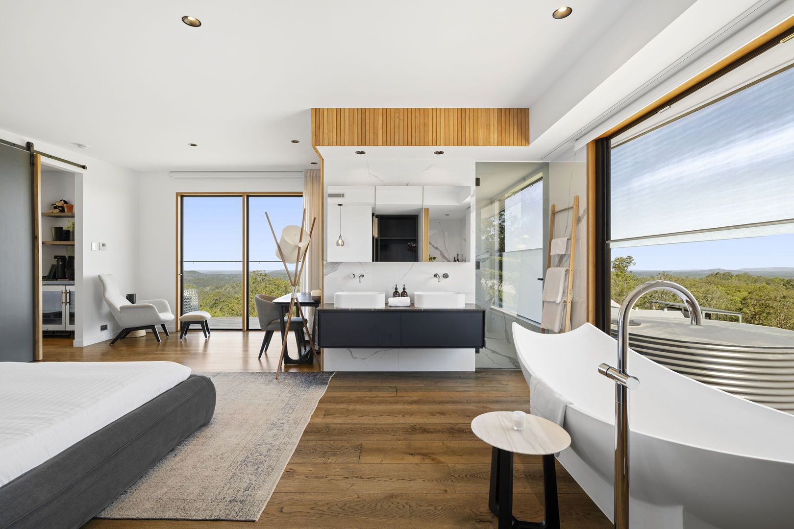 Set high on the ridgeline, WildHaven's main residence has timber cladding, storybook wraparound verandahs, soaring ceilings, wide plank oak floors, bespoke finishes and lush vistas. It is the epitome of coastal chic countryside living.