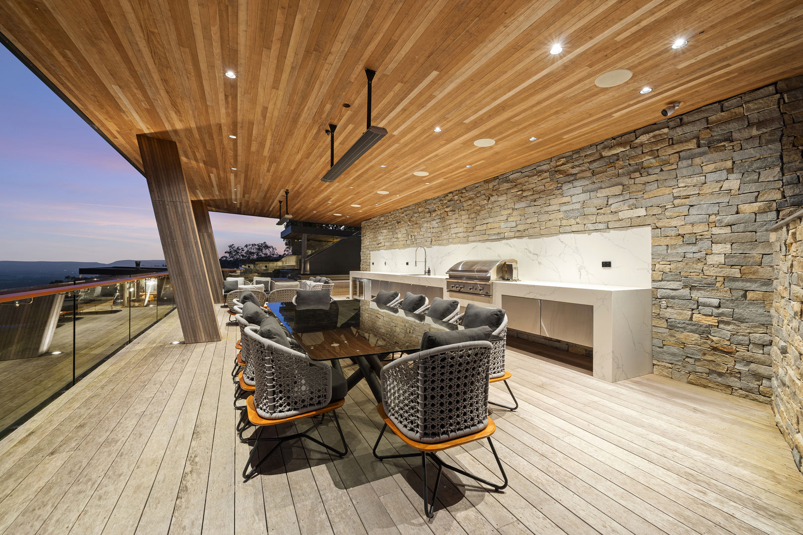 The expansive decks envelop the residence and have mesmerising views, integrated kitchen and festoon lighting - perfect for long lazy lunches, twilight cocktails, basking in nature and the cascading waterfalls of the infinity-edge pool.