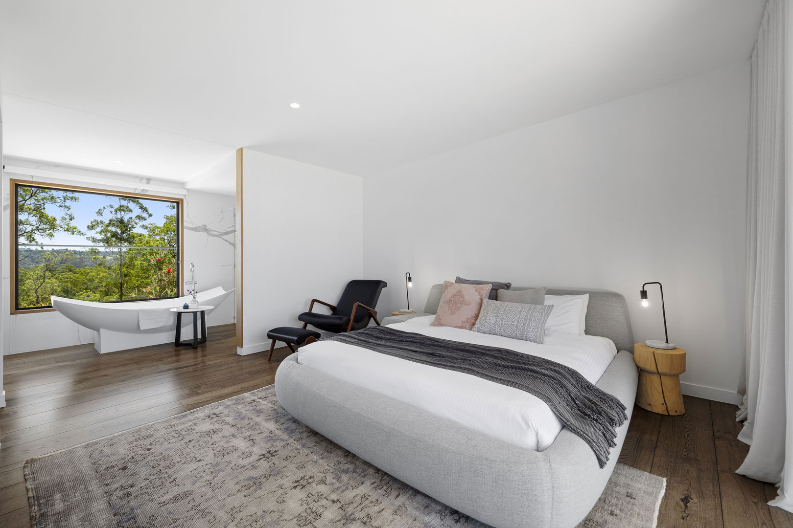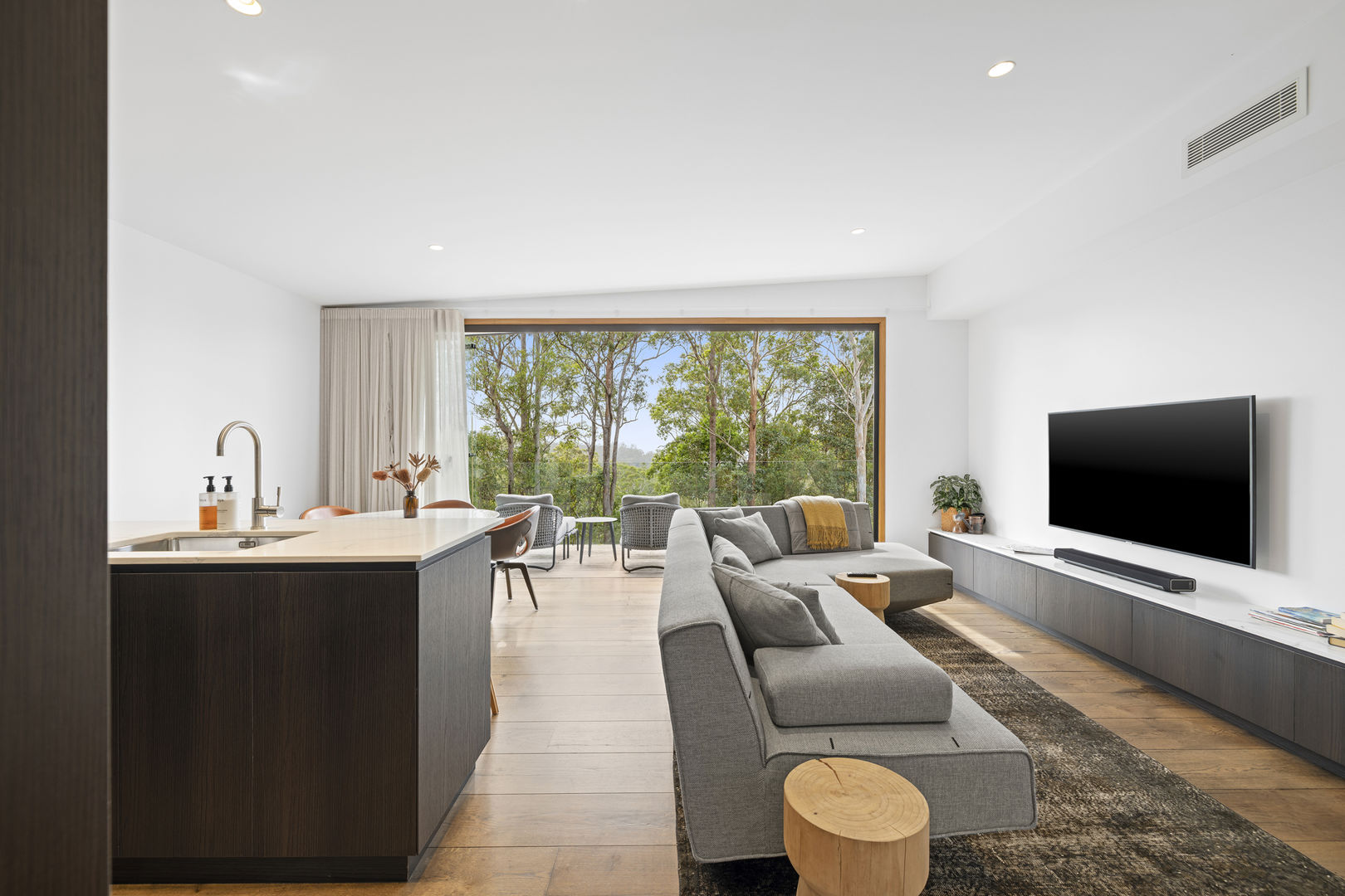 Four generous bedrooms enjoy leafy outlooks and deck access; two are ensuited. The master is a spa-like oasis with walk-in robe and stone-and-timber ensuite featuring dual showers and vanity.