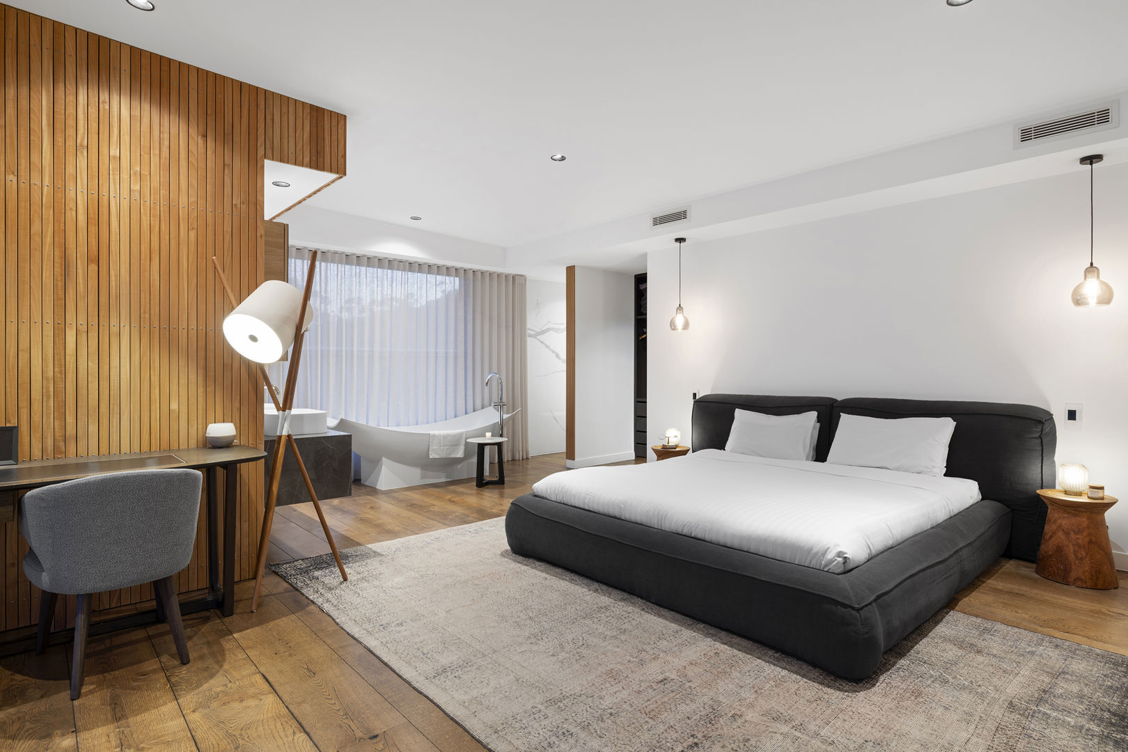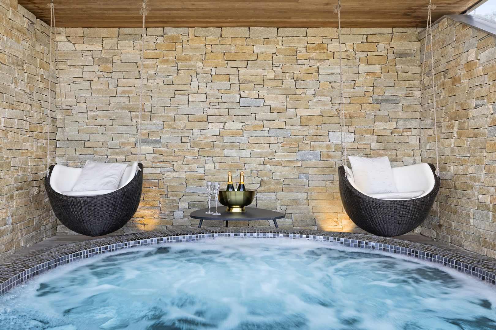 There's a sunken openair lounge, dining terrace and full kitchen with wine fridges, Miele oven and BBQ. A handcrafted stone fireplace is a cosy focal anchoring piece. R&R is guaranteed with a curved glass spa, rainhead shower, idyllic hanging chairs and, the pièce de résistance, a state of the art therapeutic steam room.