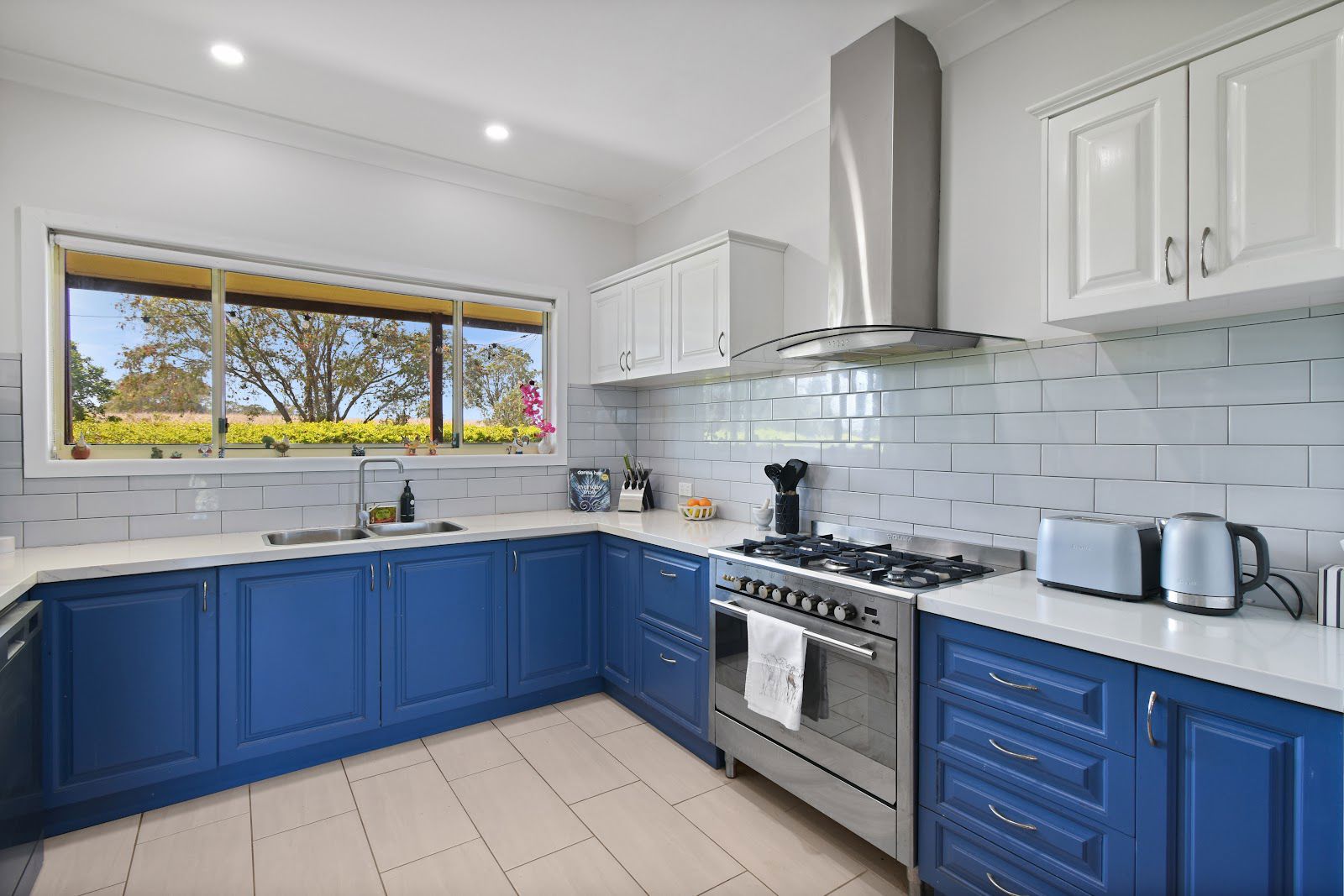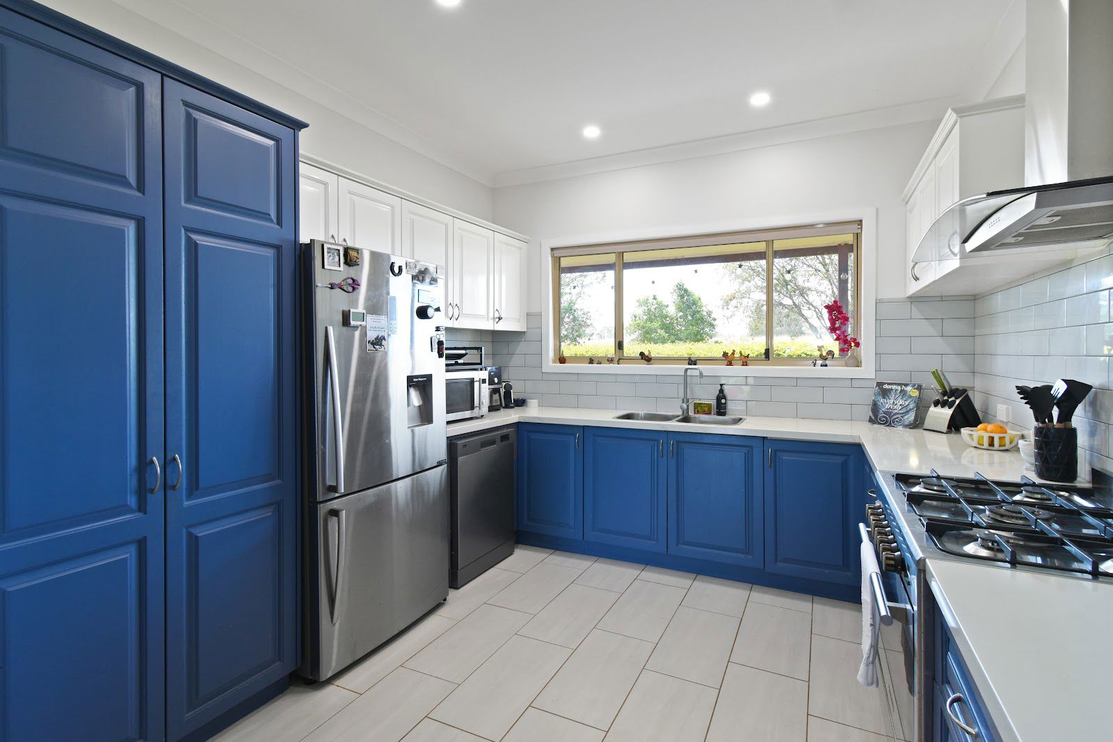 • Modern kitchen with stone bench-tops, large five burner hob, gas oven and dishwasher.